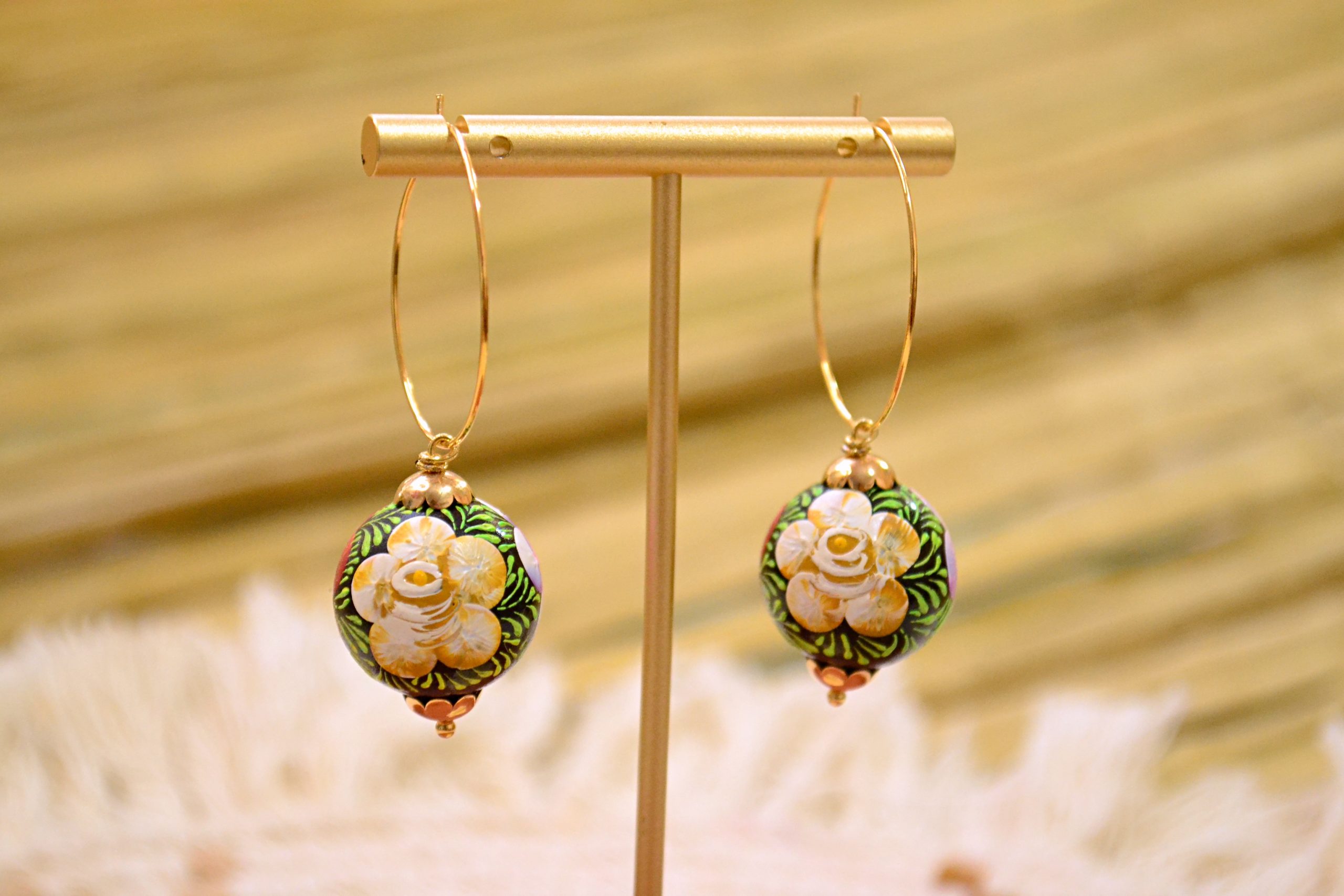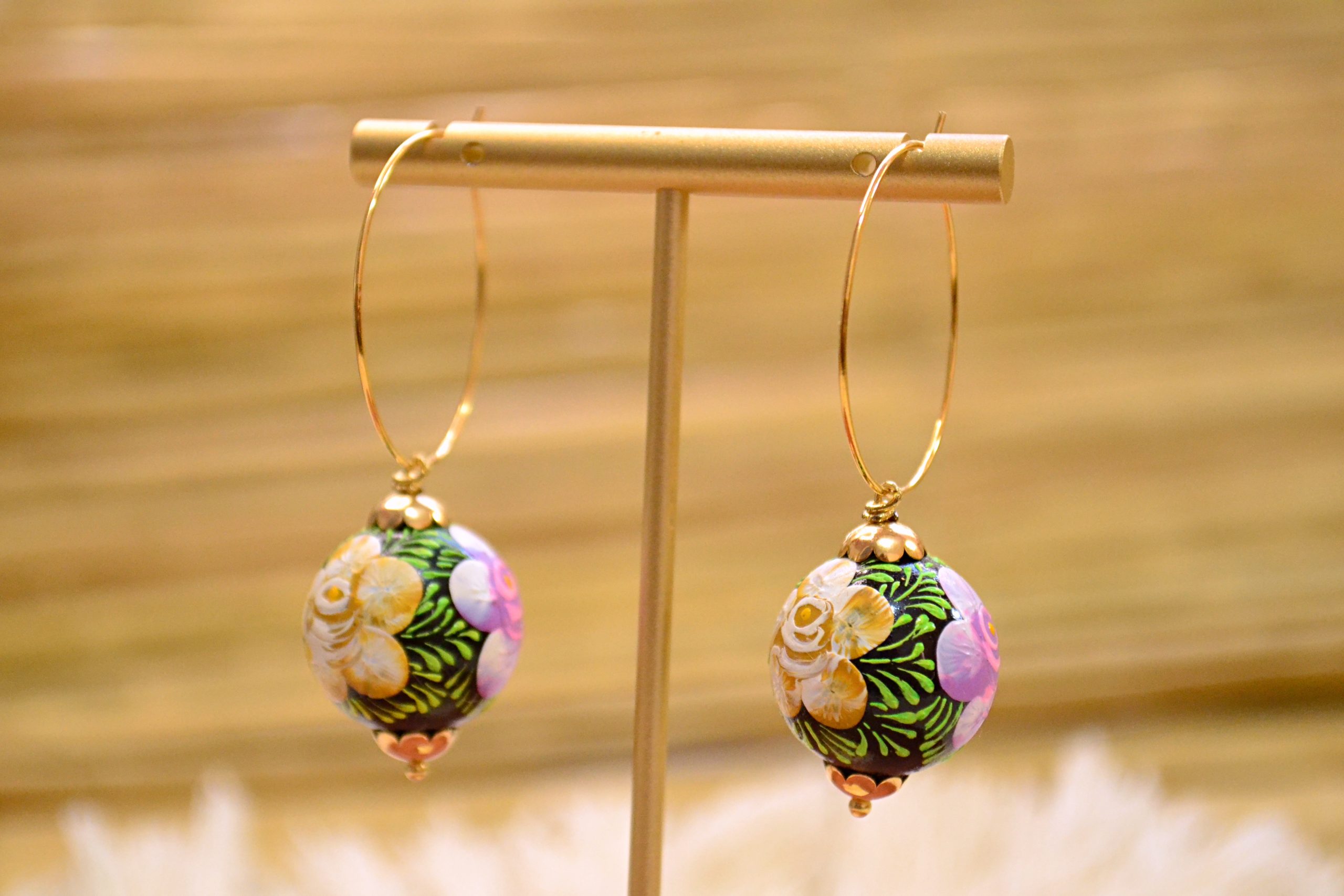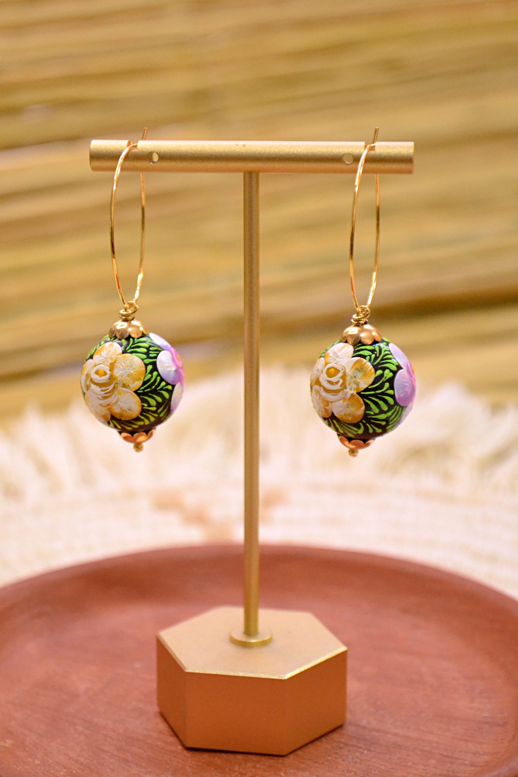Arracadas ligeras con esferas decoradas con la técnica tradicional de Chiapa de Corzo. Componentes y arracadas de chapa de oro.
