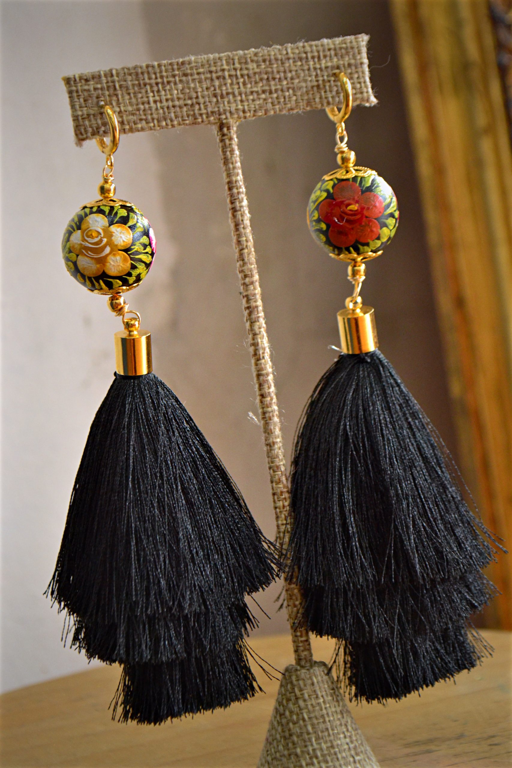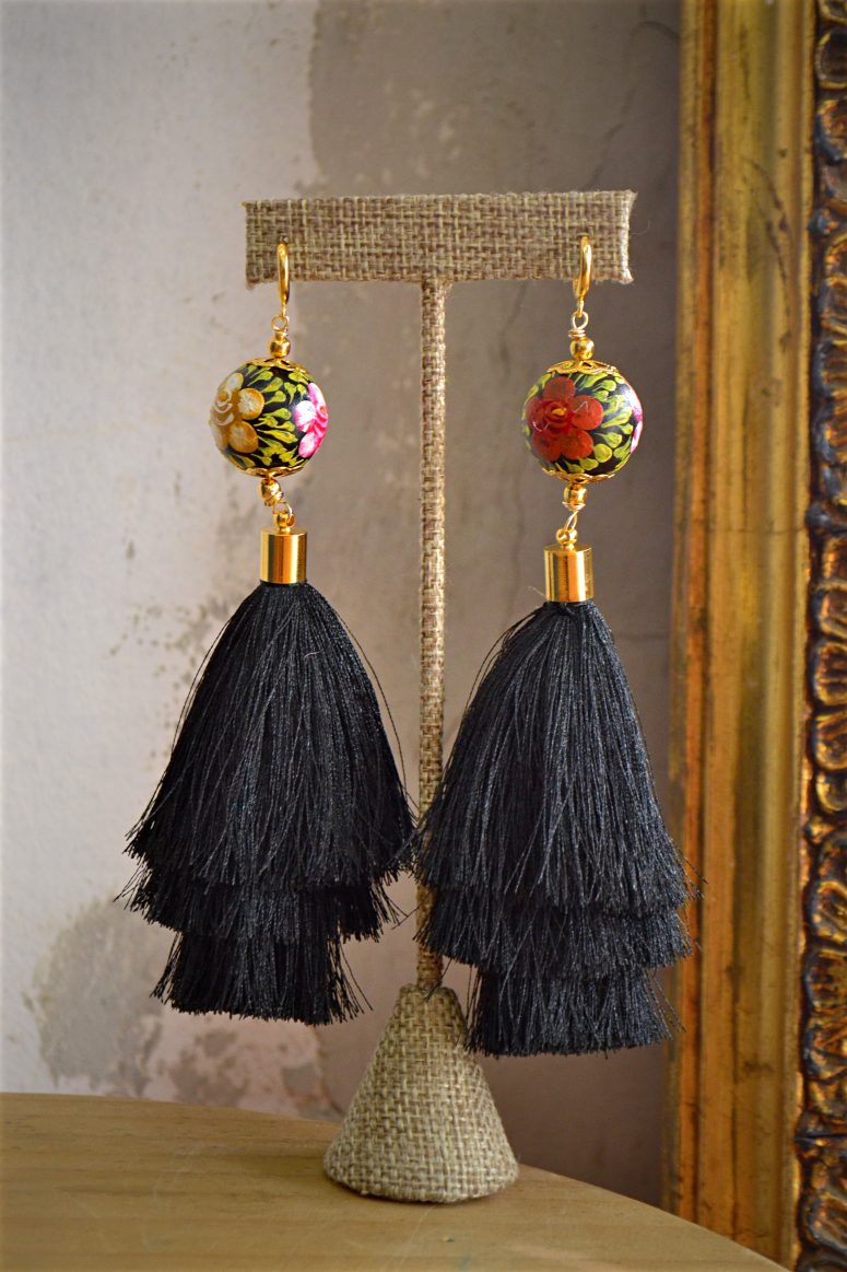 Aretes con gancho tipo huggie y esfera de plástico decorada con la técnica tradicional  de Chiapa de Corzo, Chiapas. Cuenta con tres niveles de pompones de hilos de seda. Todos los componentes son de chapa de oro.