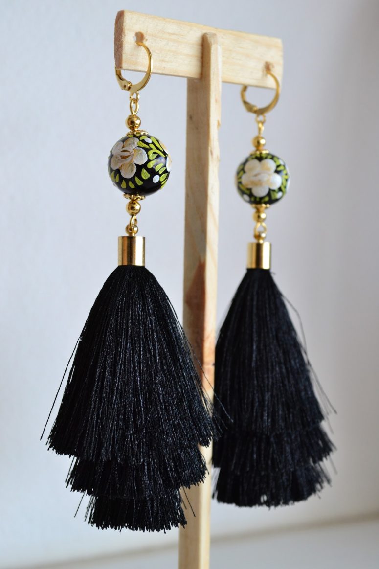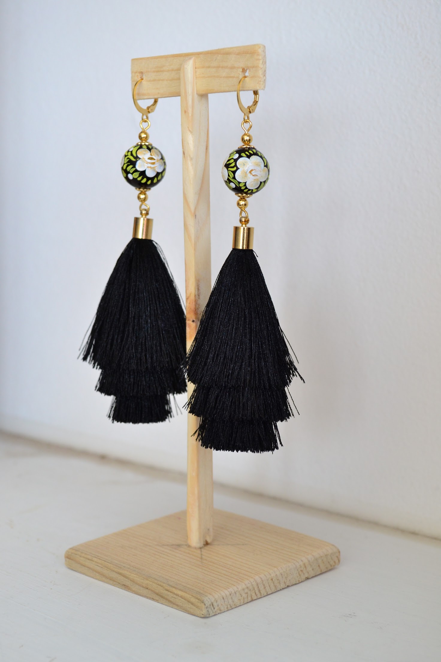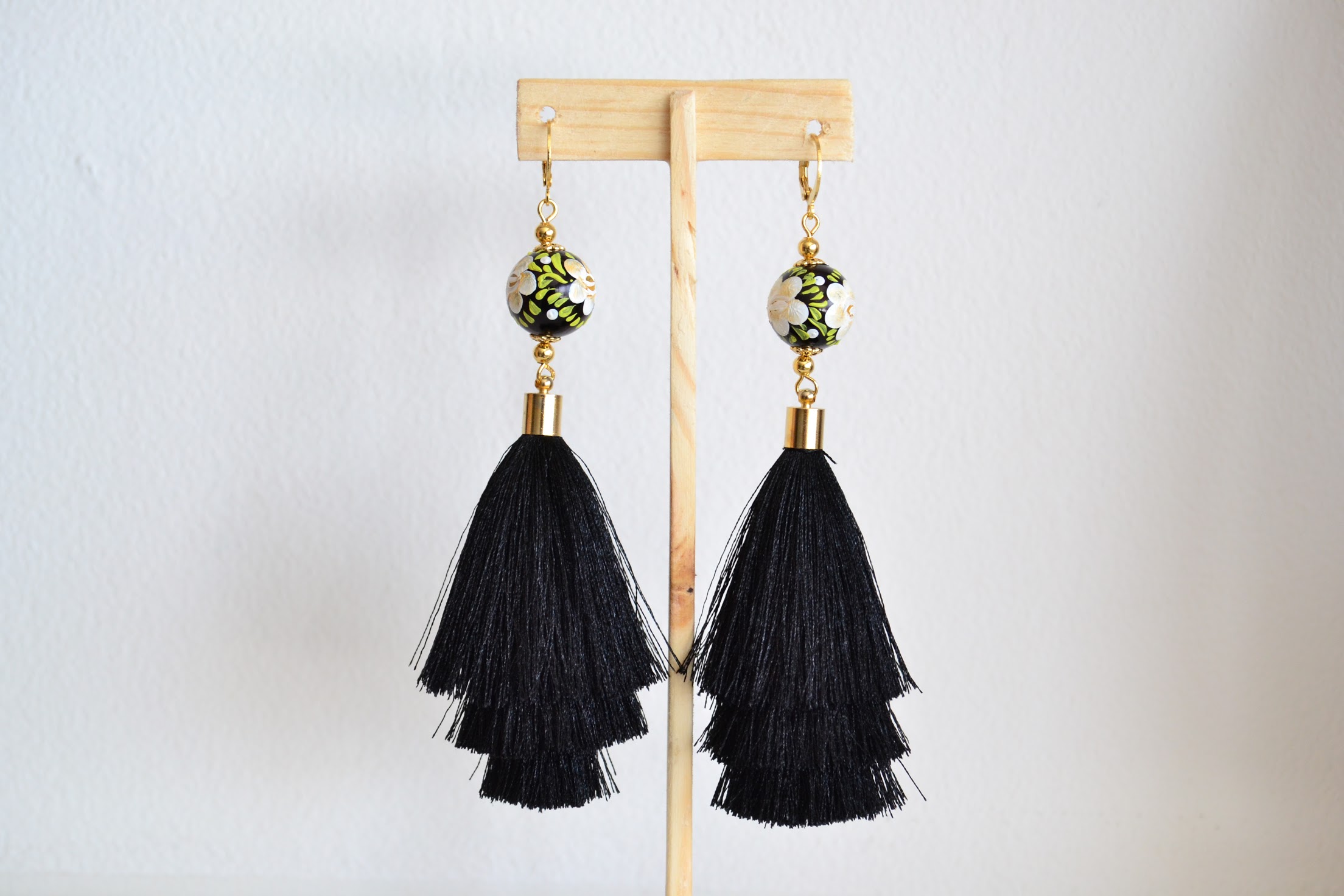 Aretes con gancho tipo huggie y esfera de plástico decorada con la técnica tradicional  de Chiapa de Corzo, Chiapas. Cuenta con tres niveles de pompones de hilos de seda. Todos los componentes son de chapa de oro.
