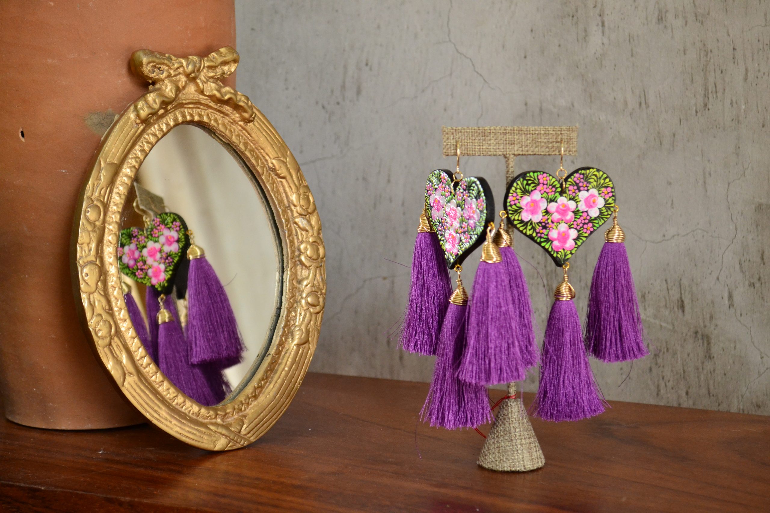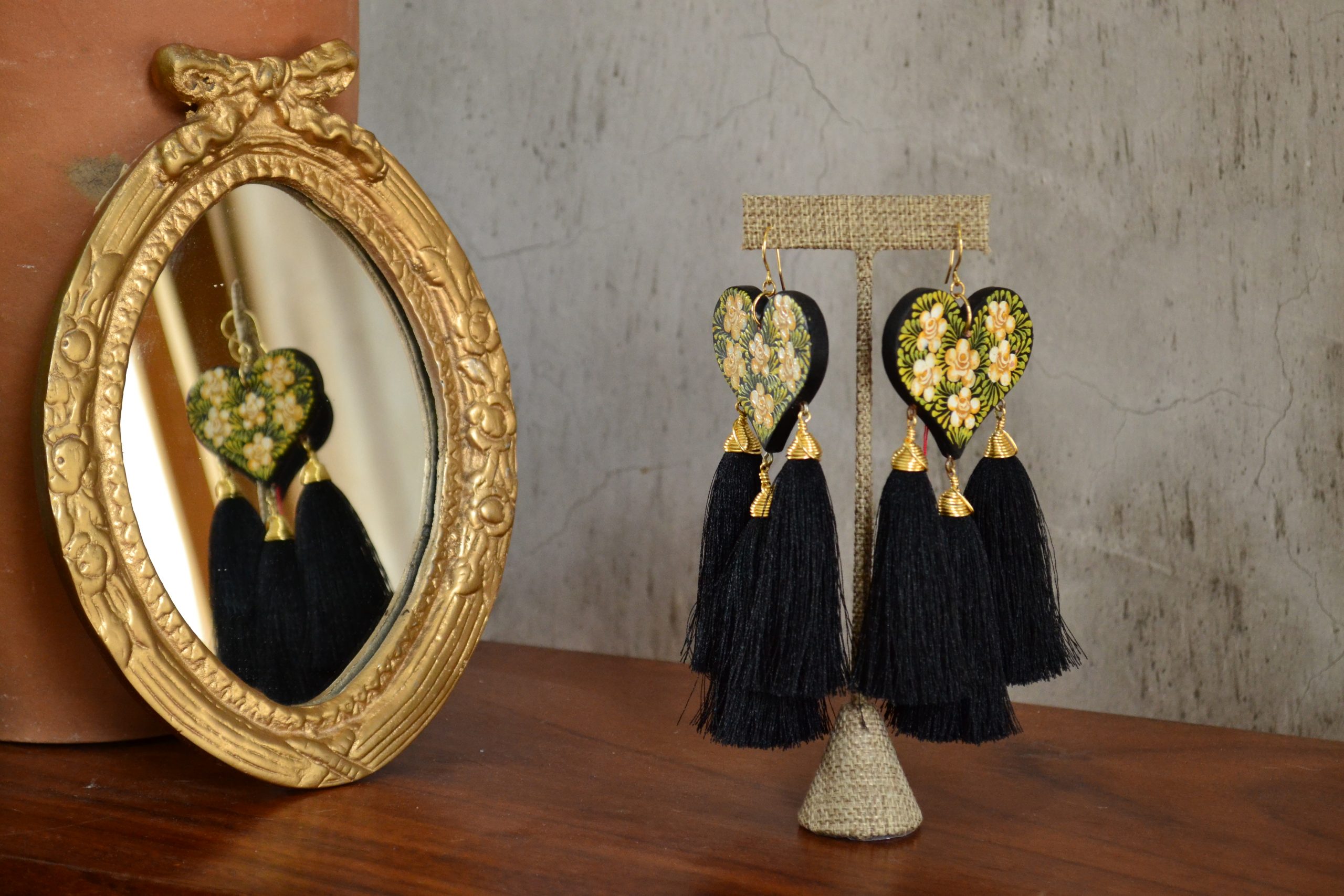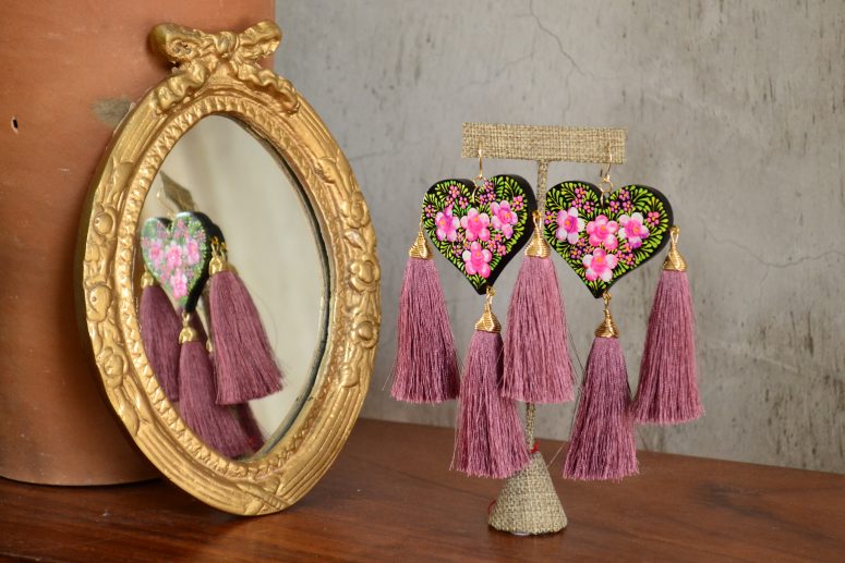 Aretes con gancho africano con pieza de corazón de madera con decorado tradicional de Chiapa de Corzo, Chiapas. Componentes de chapa de oro y pompones de hilo de seda.
