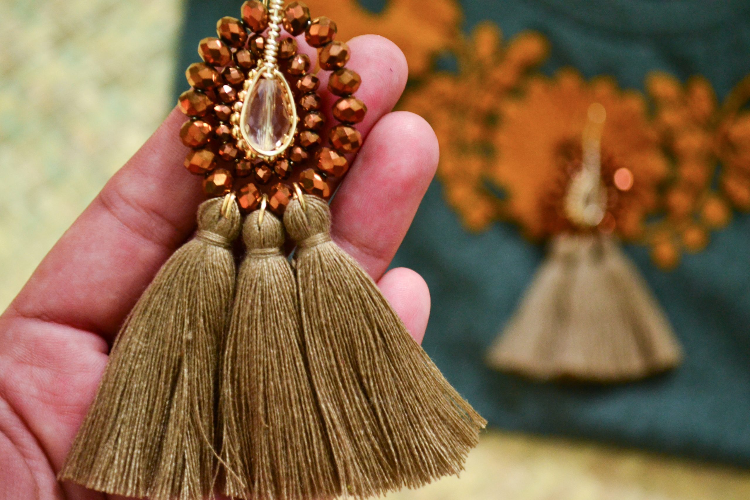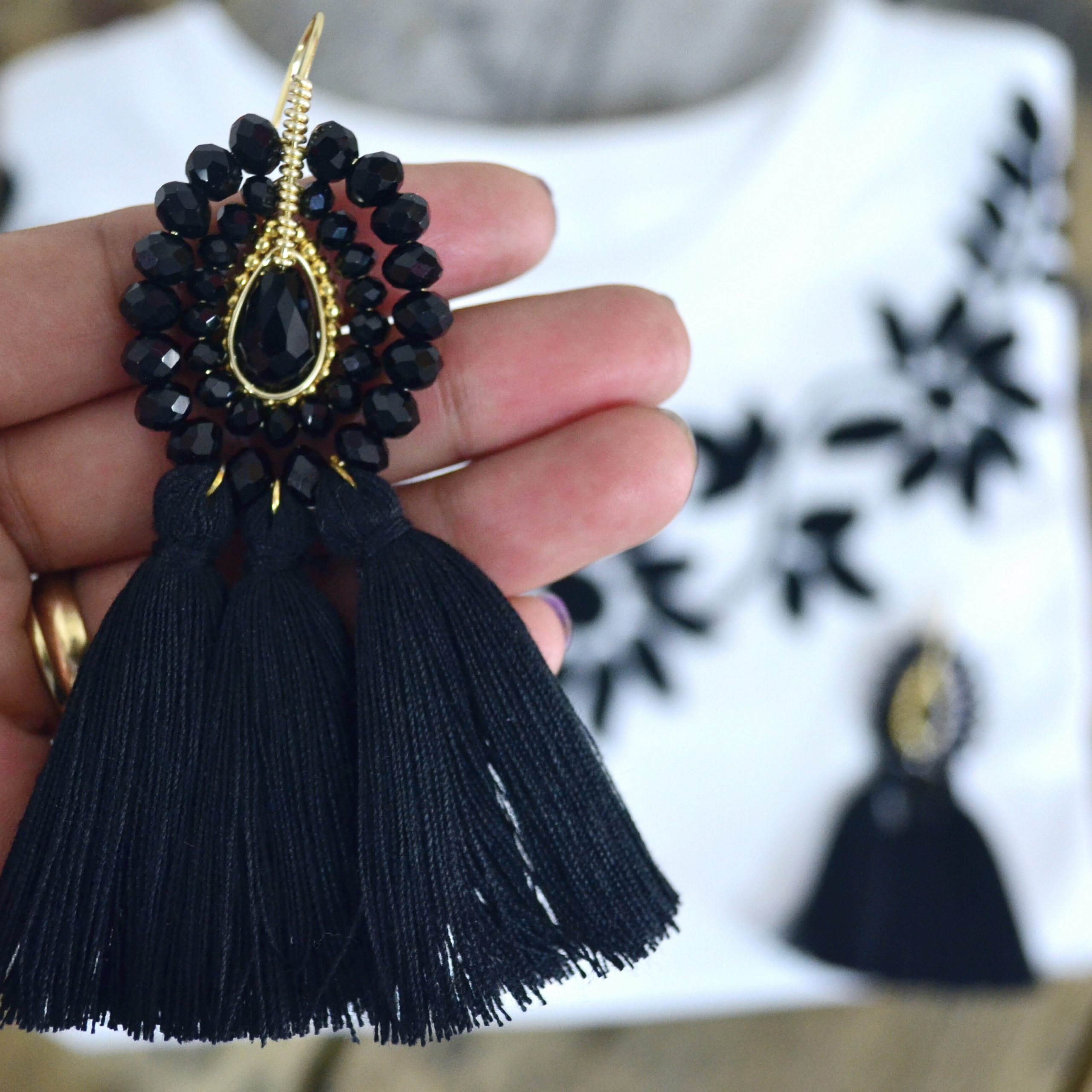Aretes con gancho africano, cristales facetados engarzados en alambre de chapa de oro, con pompones elaborados con hilos de algodón.