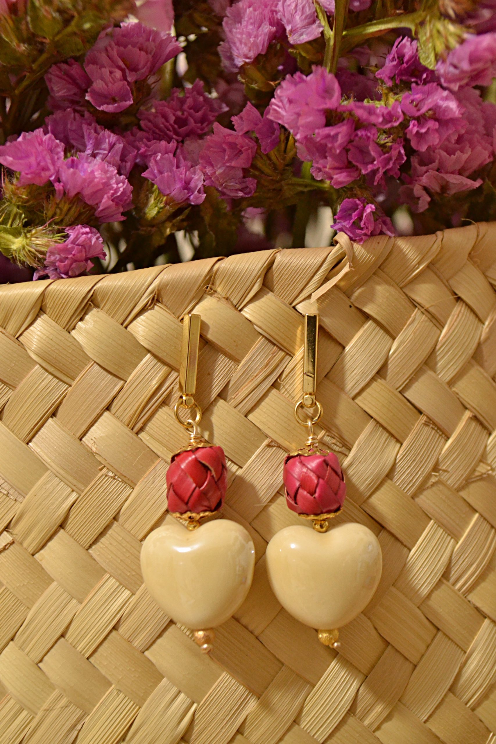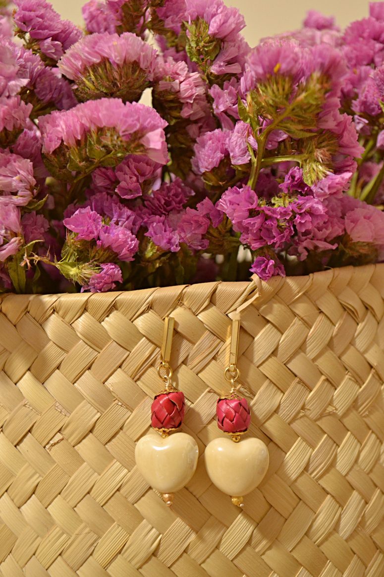 Aretes cortos de broquel con palma tejida en color rojo, teñida y tejida por artesanos de Guerrero, corazoncito de acrílico y componentes de chapa de oro.