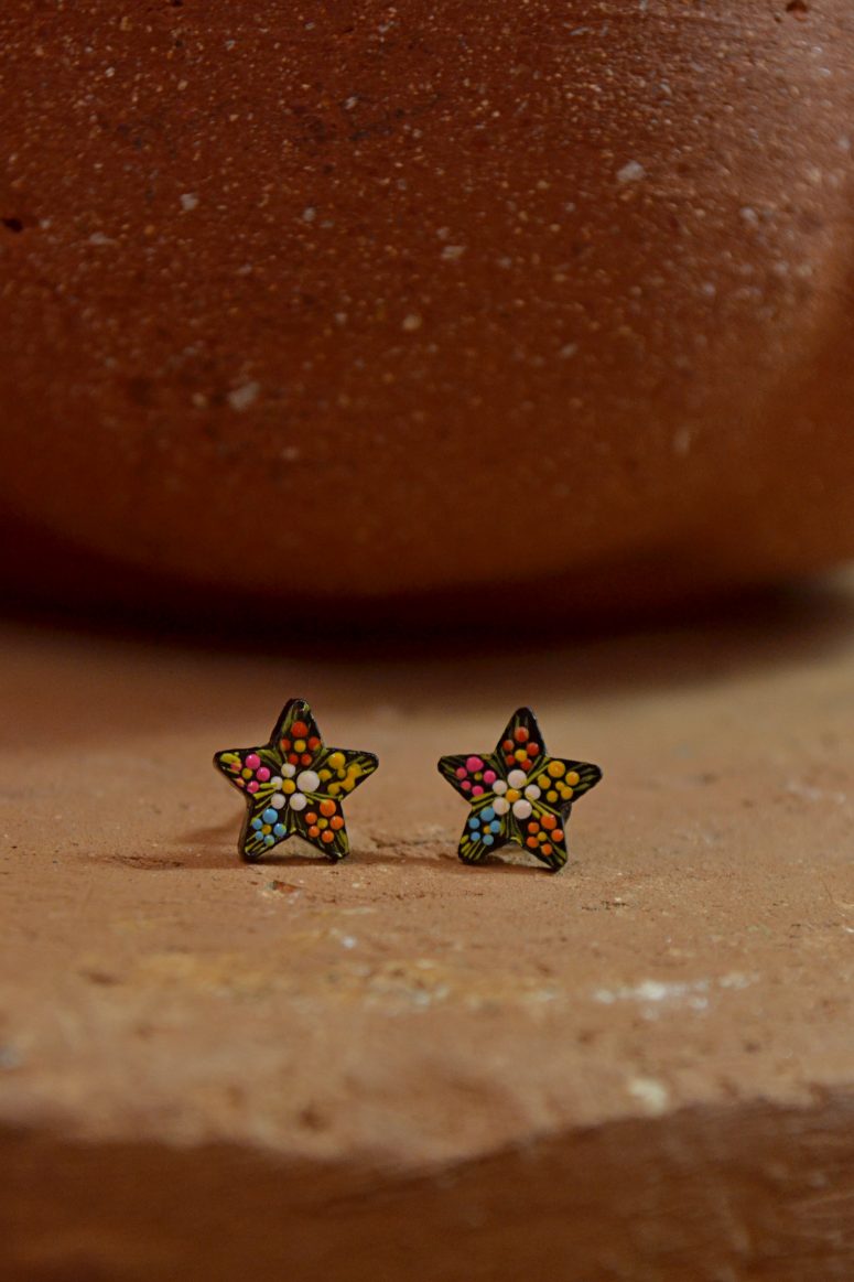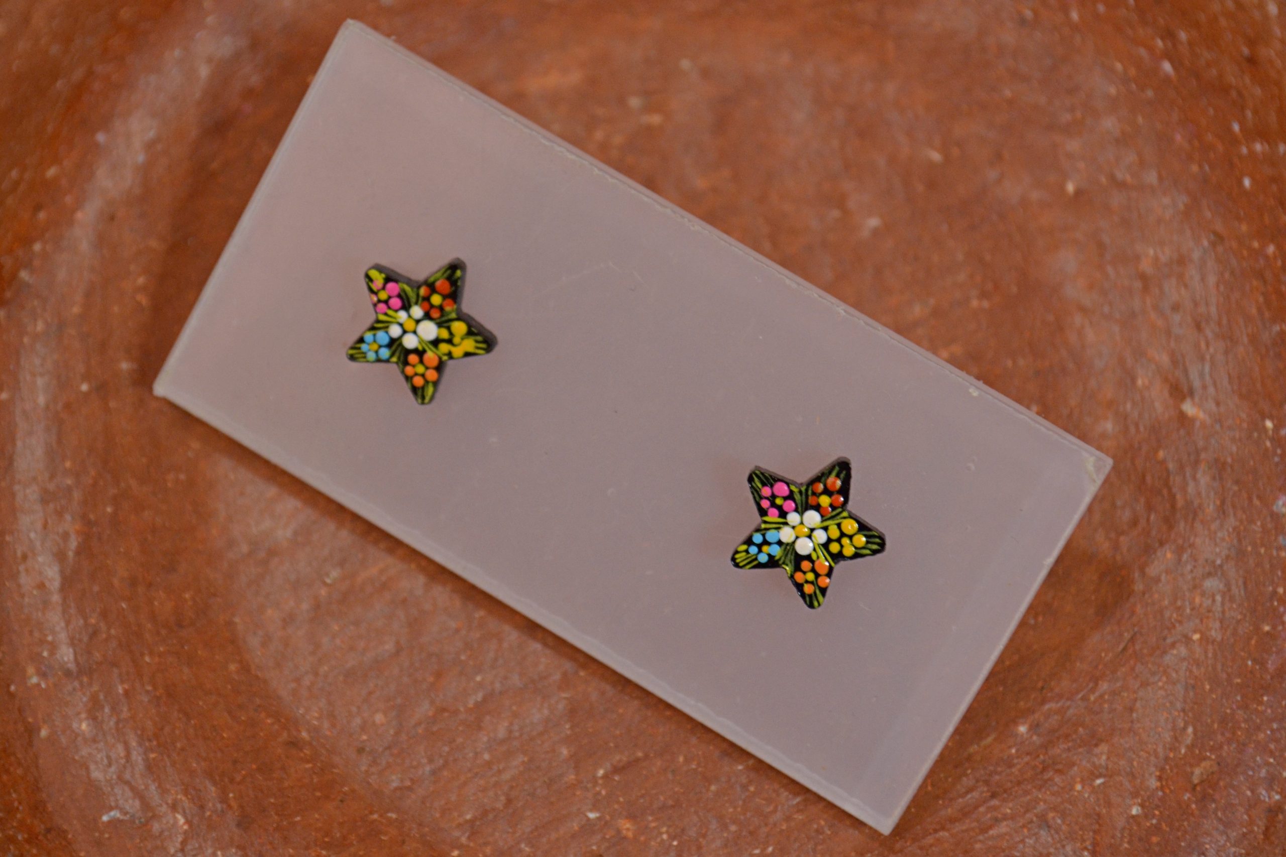Aretes mini de plástico pintadas con el decorado tradicional de Chiapa de Corzo, tipo broquel. El orden del color de las florecitas puede variar.