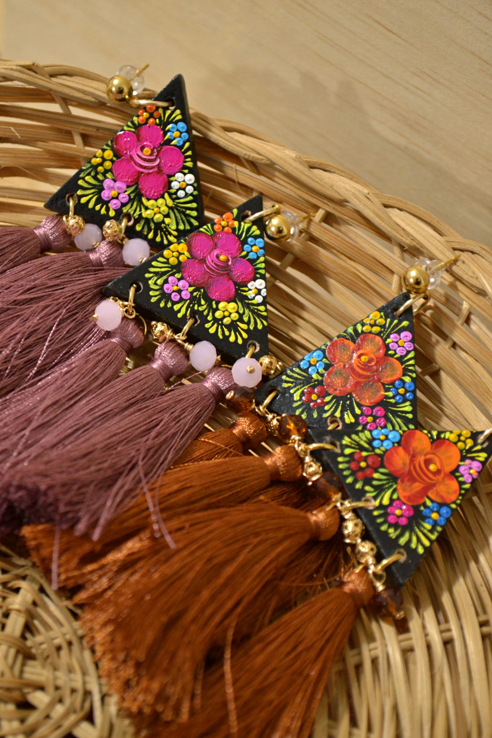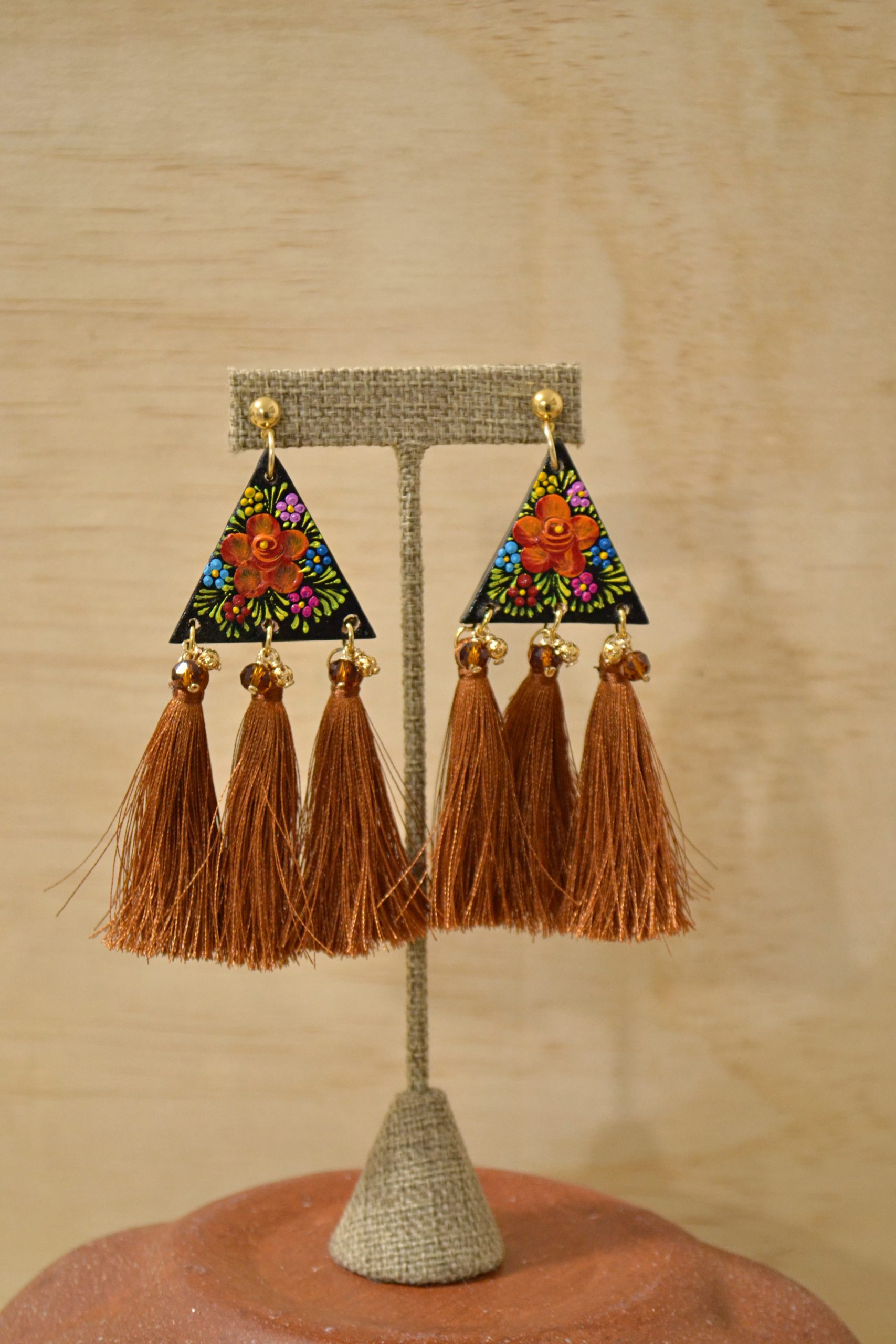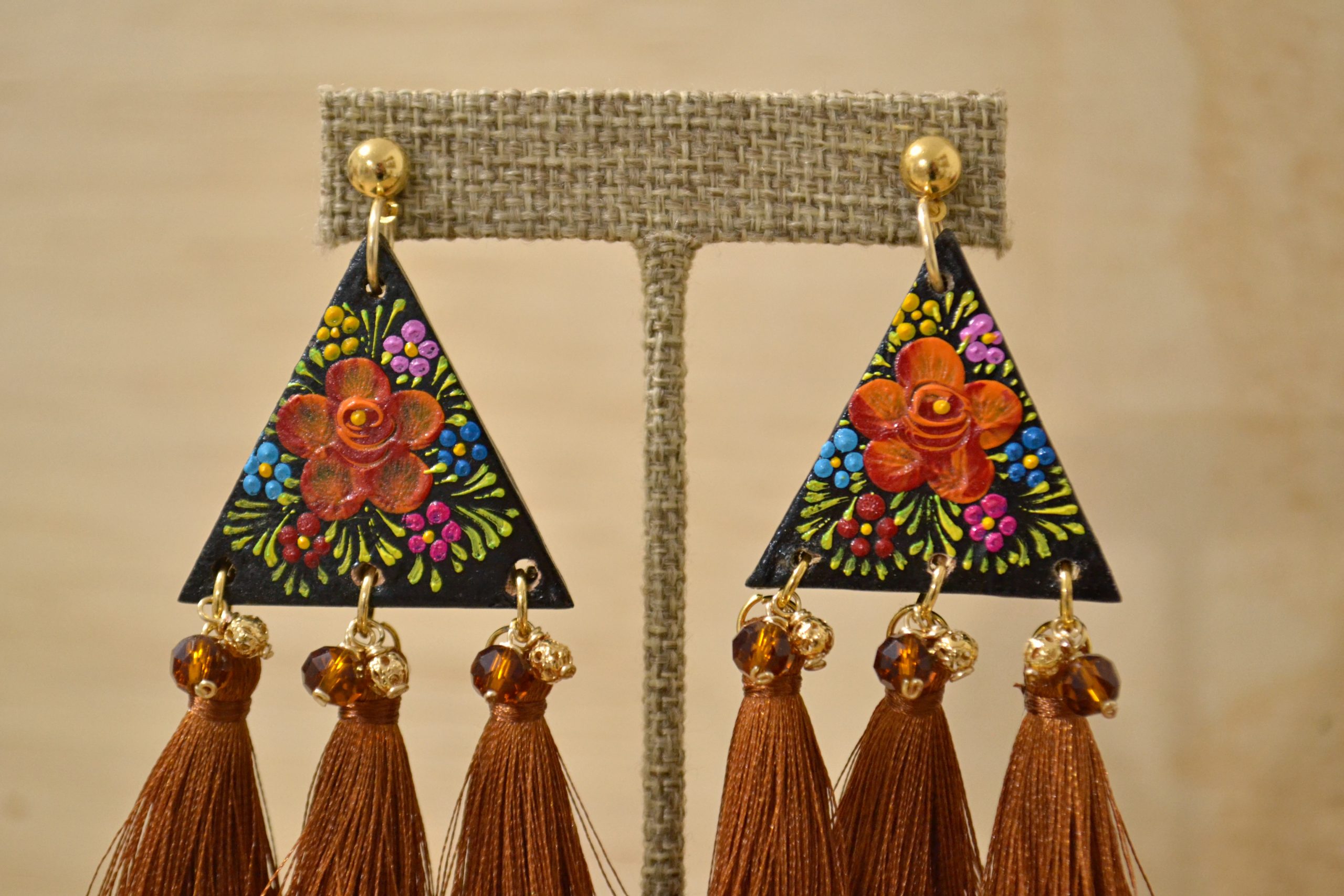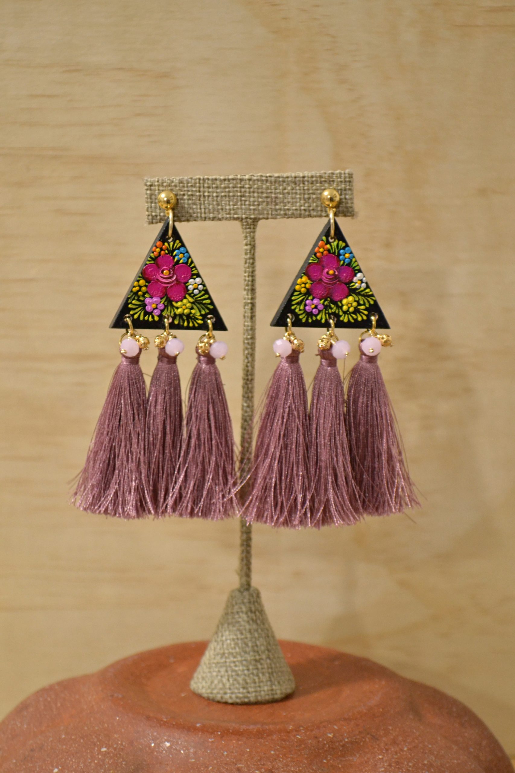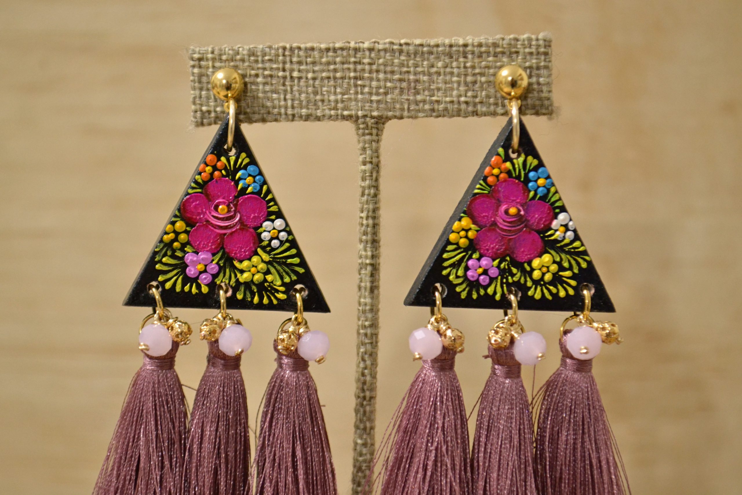 Aretes largos con base triangular de madera, decorados con la técnica tradicional de laca, originaria de Chiapa de Corzo, pompones de hilo poliseda y componentes de chapa de oro.