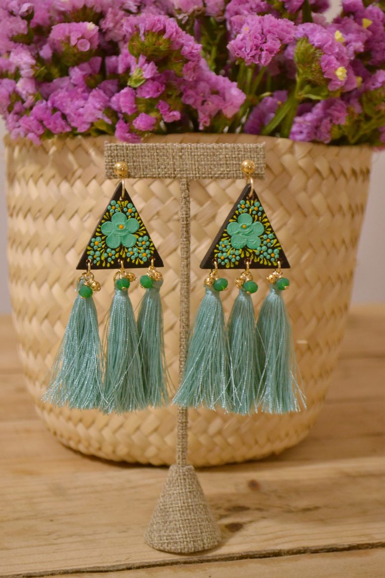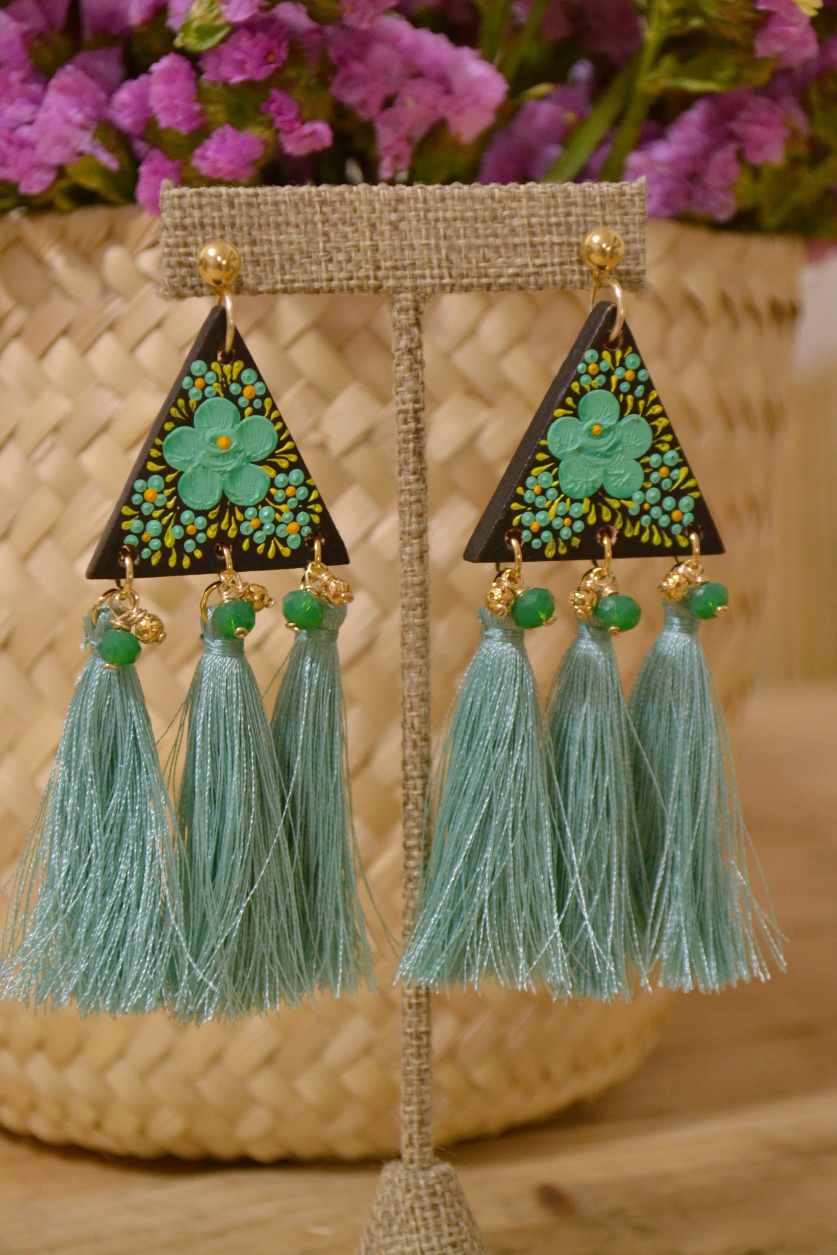 Aretes largos con base triangular de madera, decorados con la técnica tradicional de laca, originaria de Chiapa de Corzo, pompones de hilo poliseda y componentes de chapa de oro.