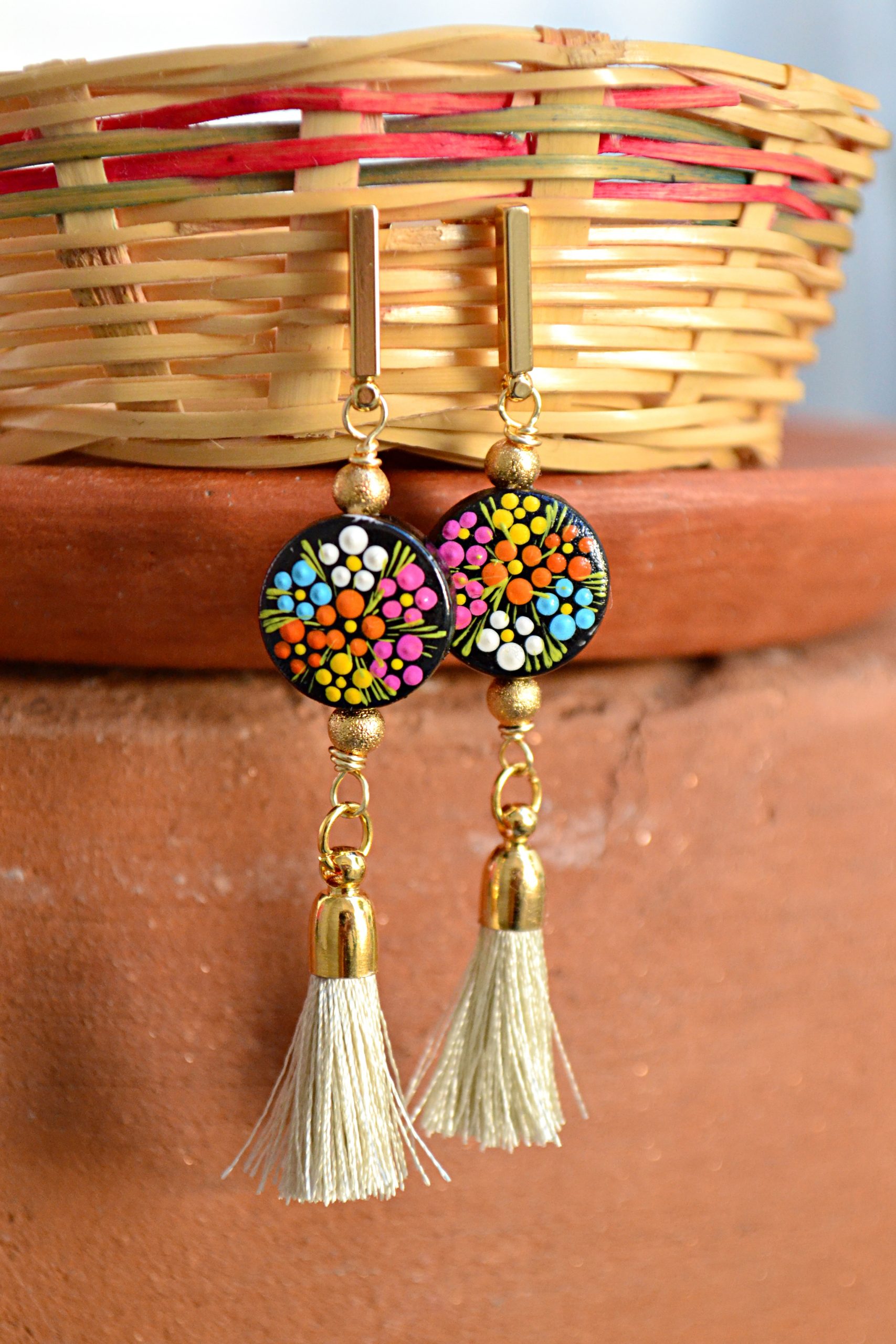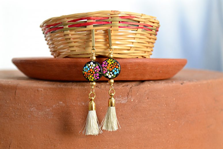 Aretes con broquel y  pieza de plástico con decorado tradicional de Chiapa de Corzo, Chiapas. Con componentes de chapa de oro y pompones de hilo de seda.