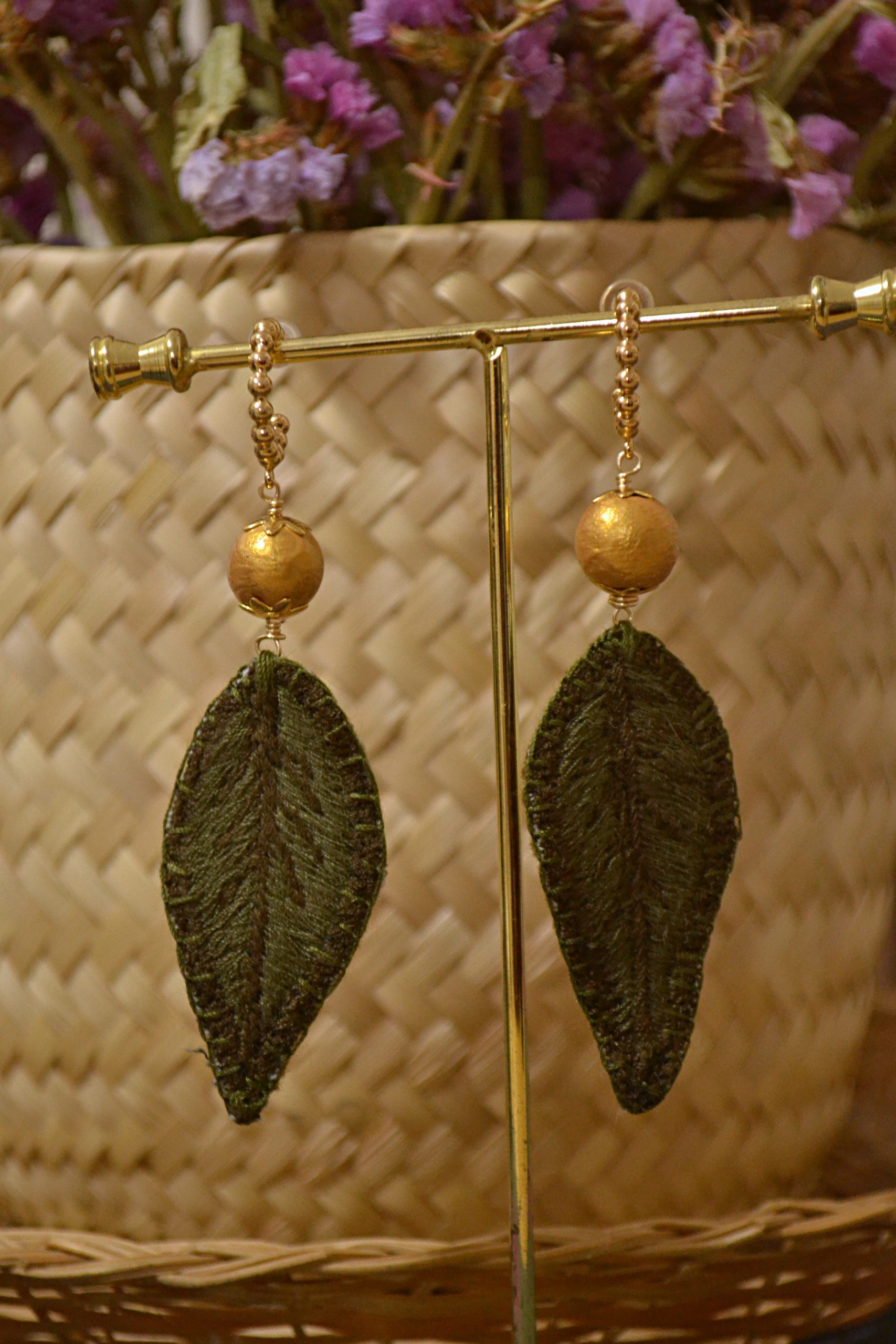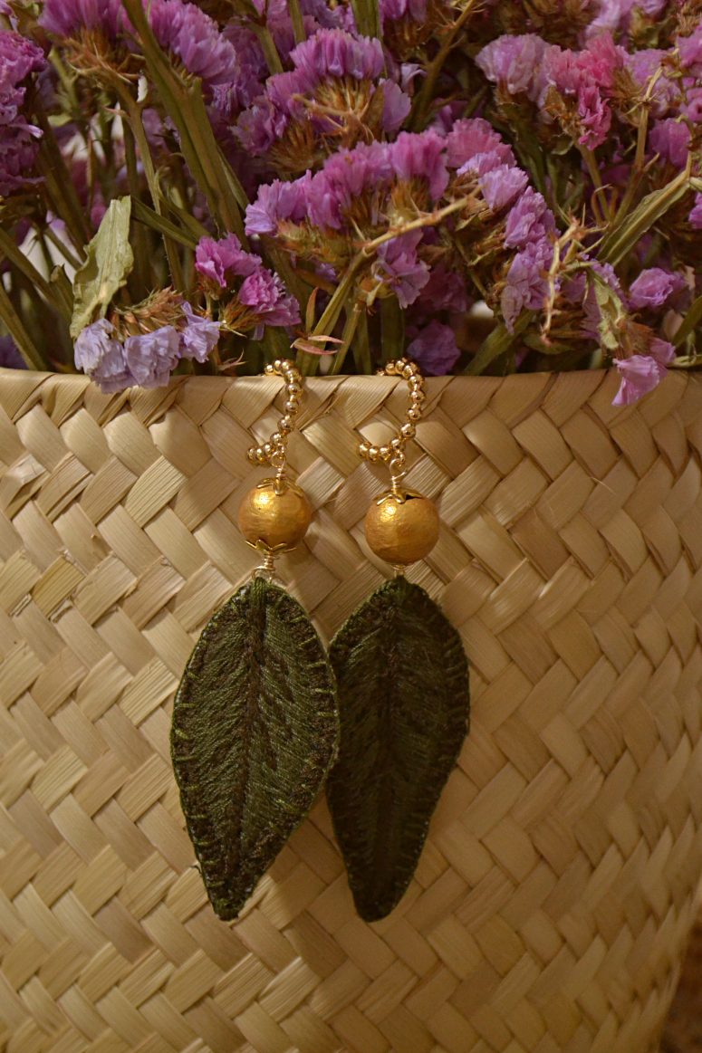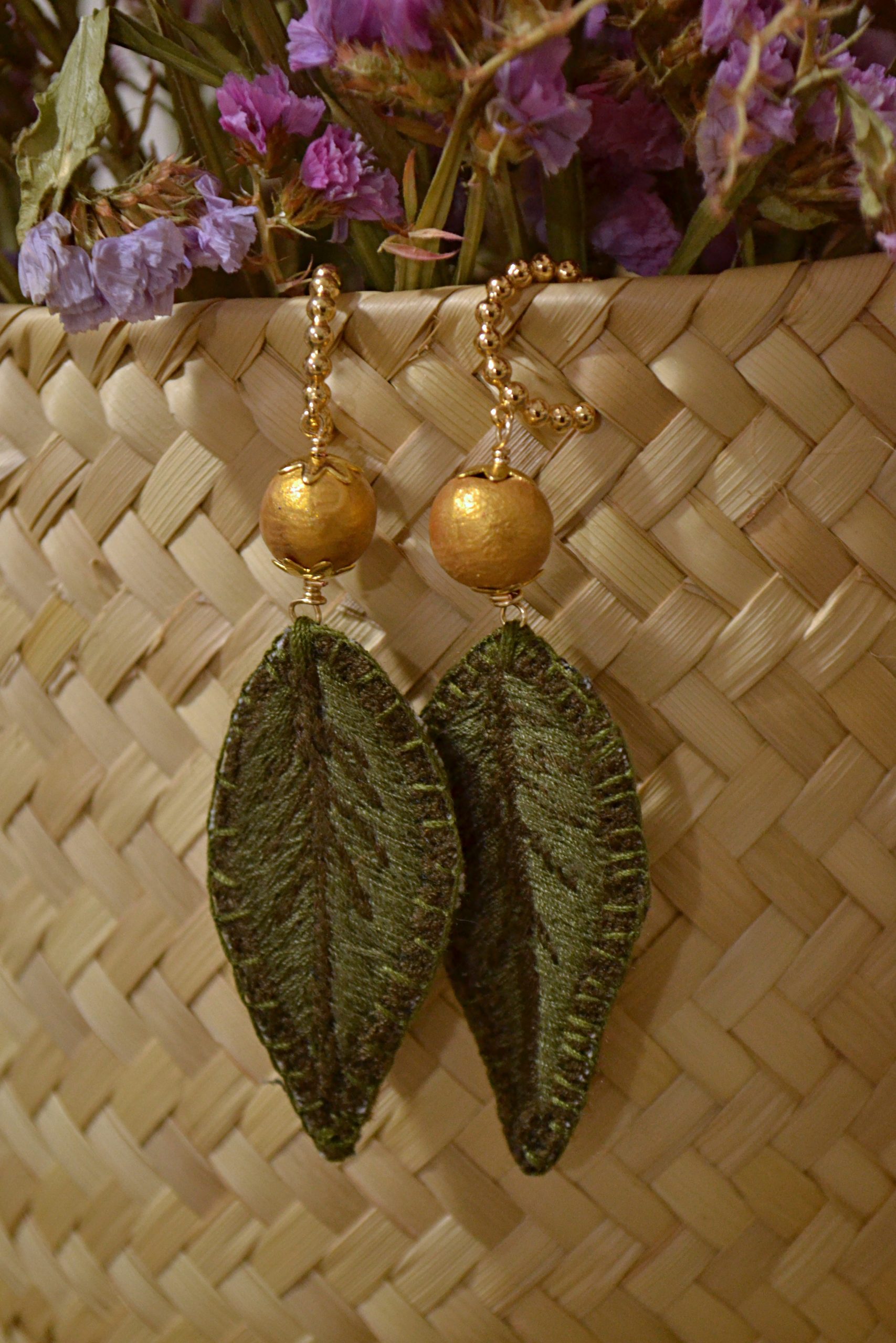 Aretes largos de chapa de oro con esferas de madera pintadas, pieza principal de hojas bordadas a máquina de pedal por la artesana Rosa, originaria de Jech Chentic, Zinacantán.