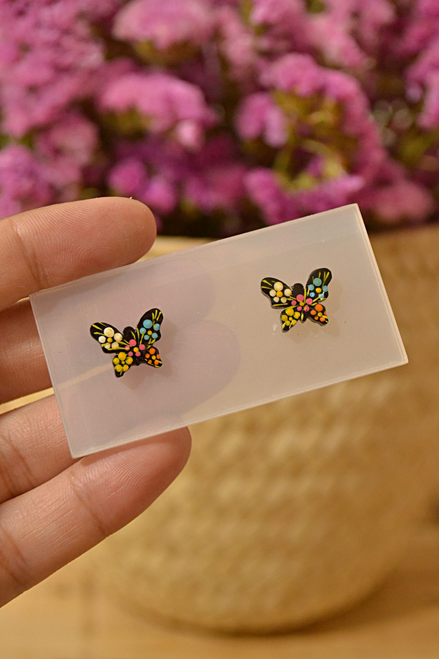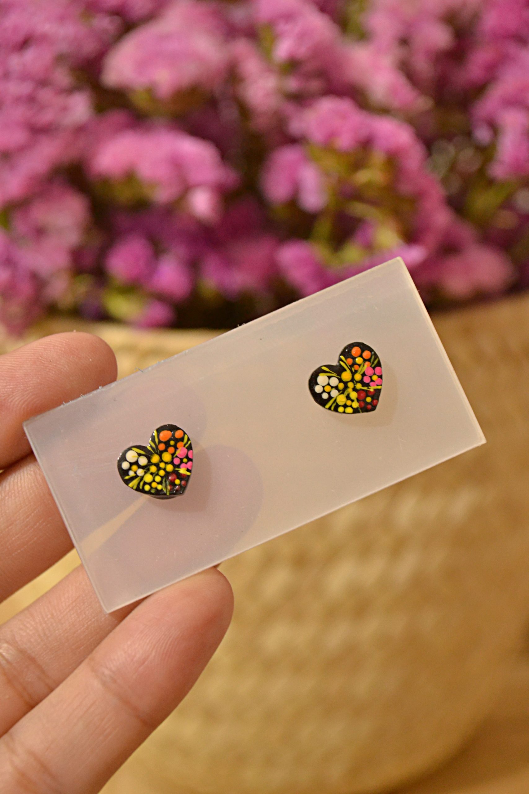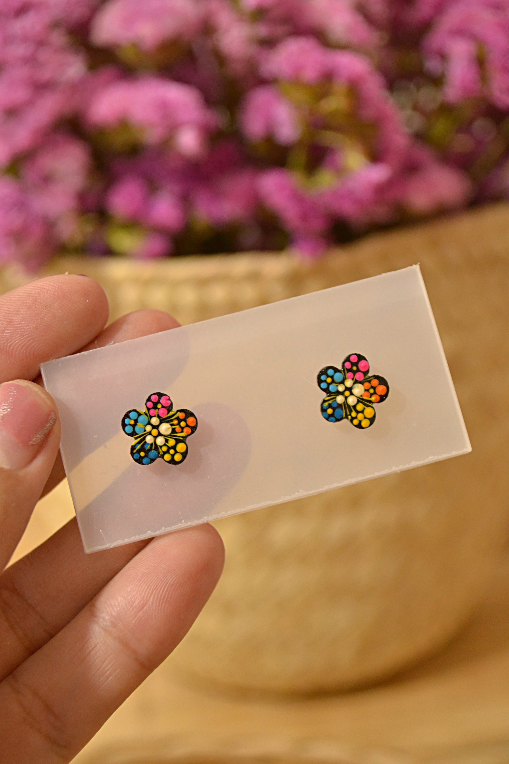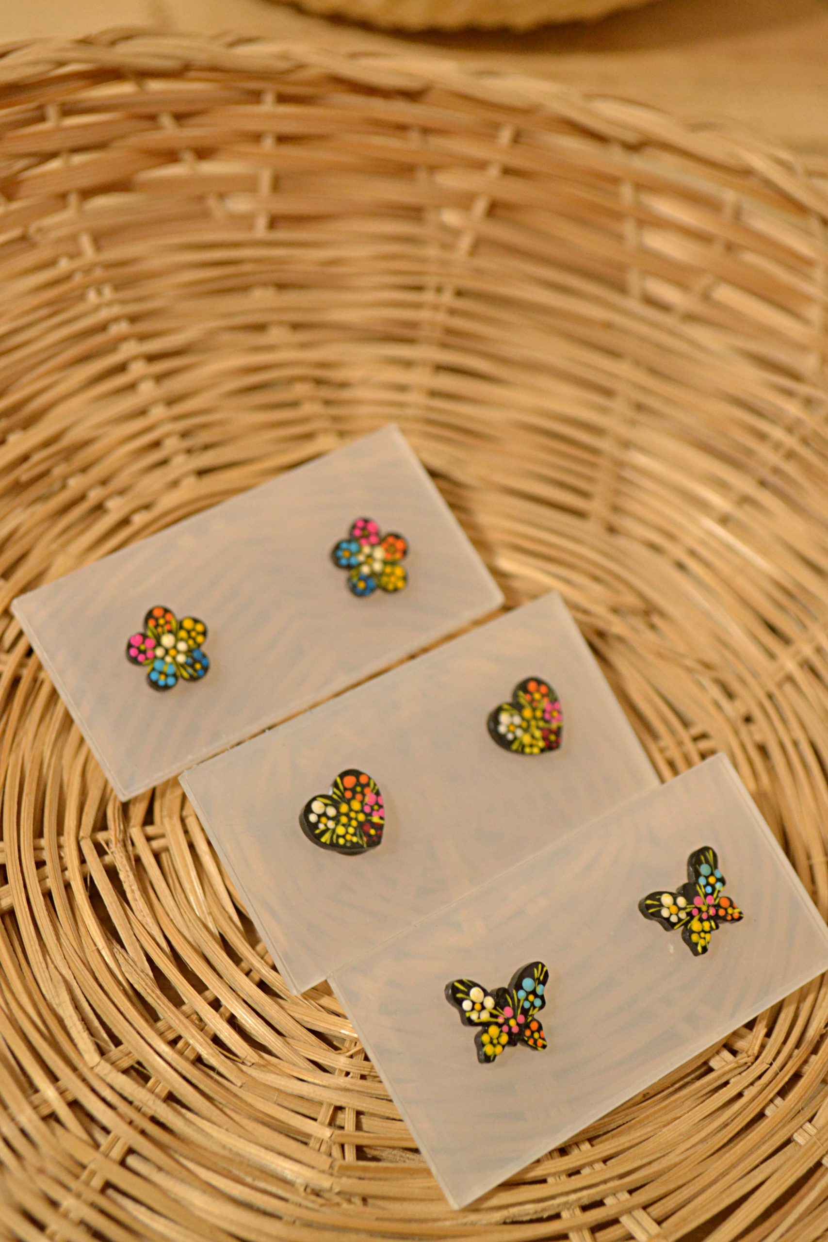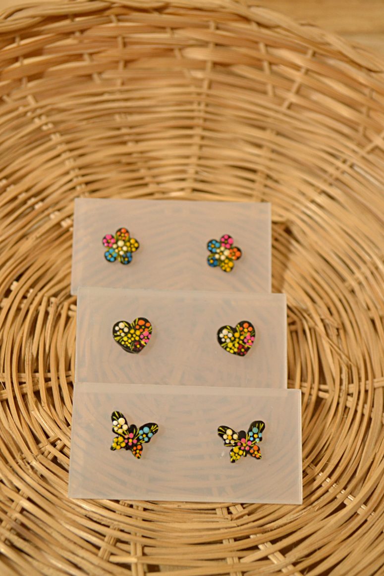 Aretes pequeñitos tipo broquel con base de plástico decorado con la técnica tradicional de Chiapa de Corzo. Elige la forma que desees en nuestras variantes.