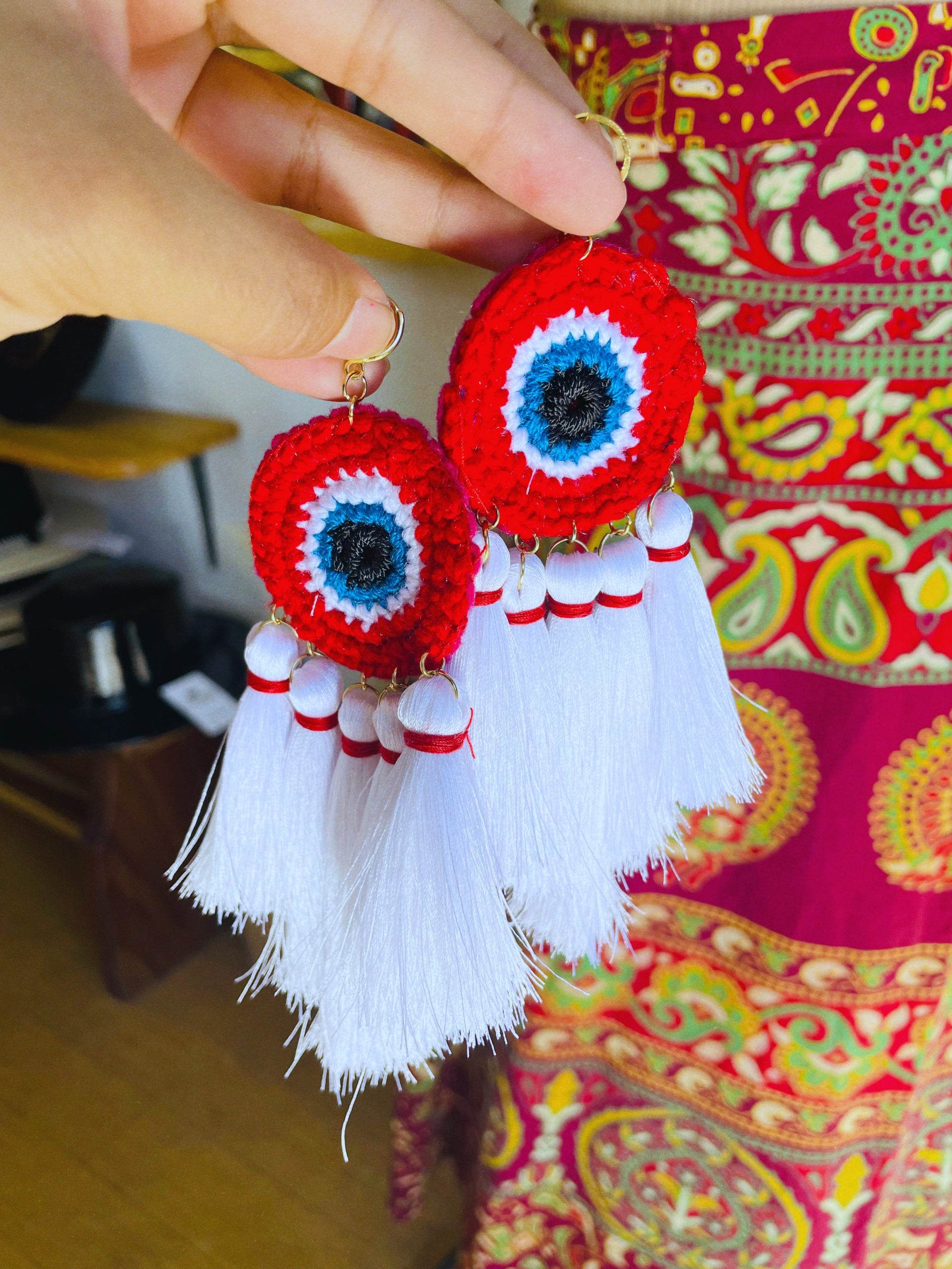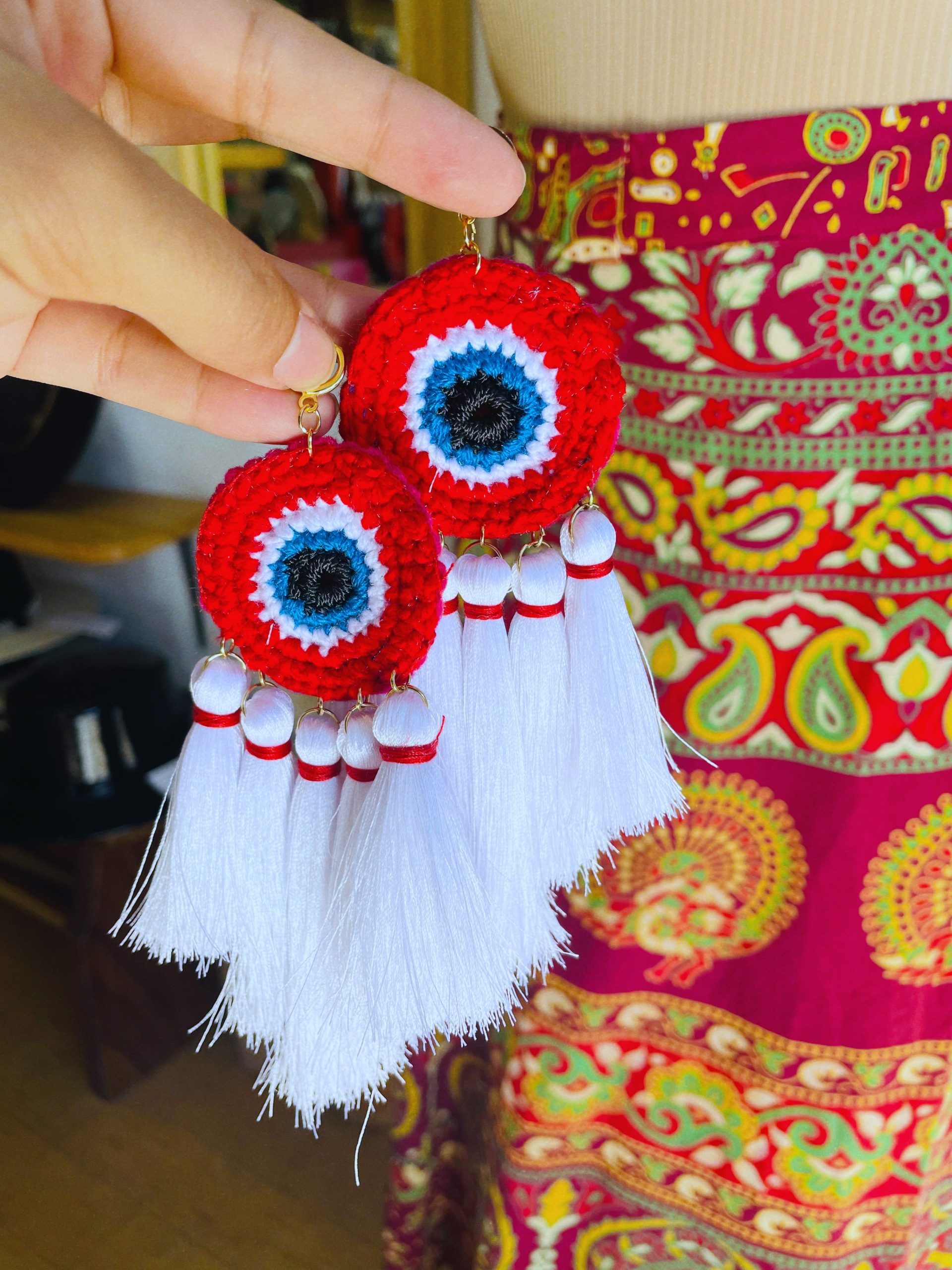 Maxi aretes con gancho africano, circulo tejido con hilos de algodón y pompones con hilo omega delgado. Componentes de chapa de oro.