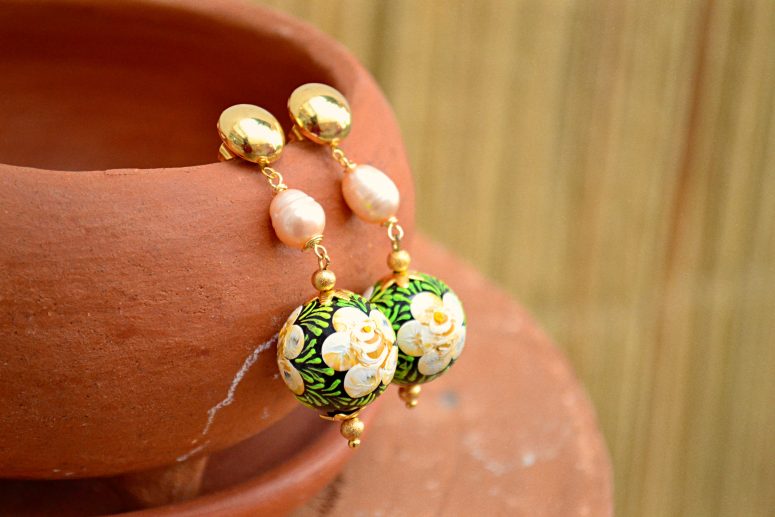 Aretes semi largos de tipo broquel con perla de río y esférica pintada a mano por artesanas originarias de Chiapa de Corzo. Engarzado y con componentes de chapa de oro.
