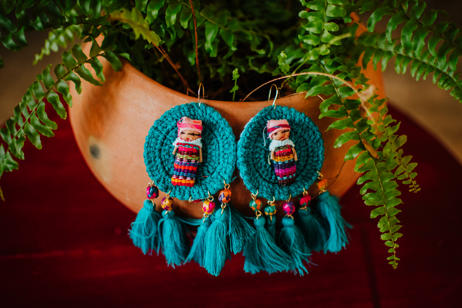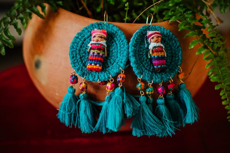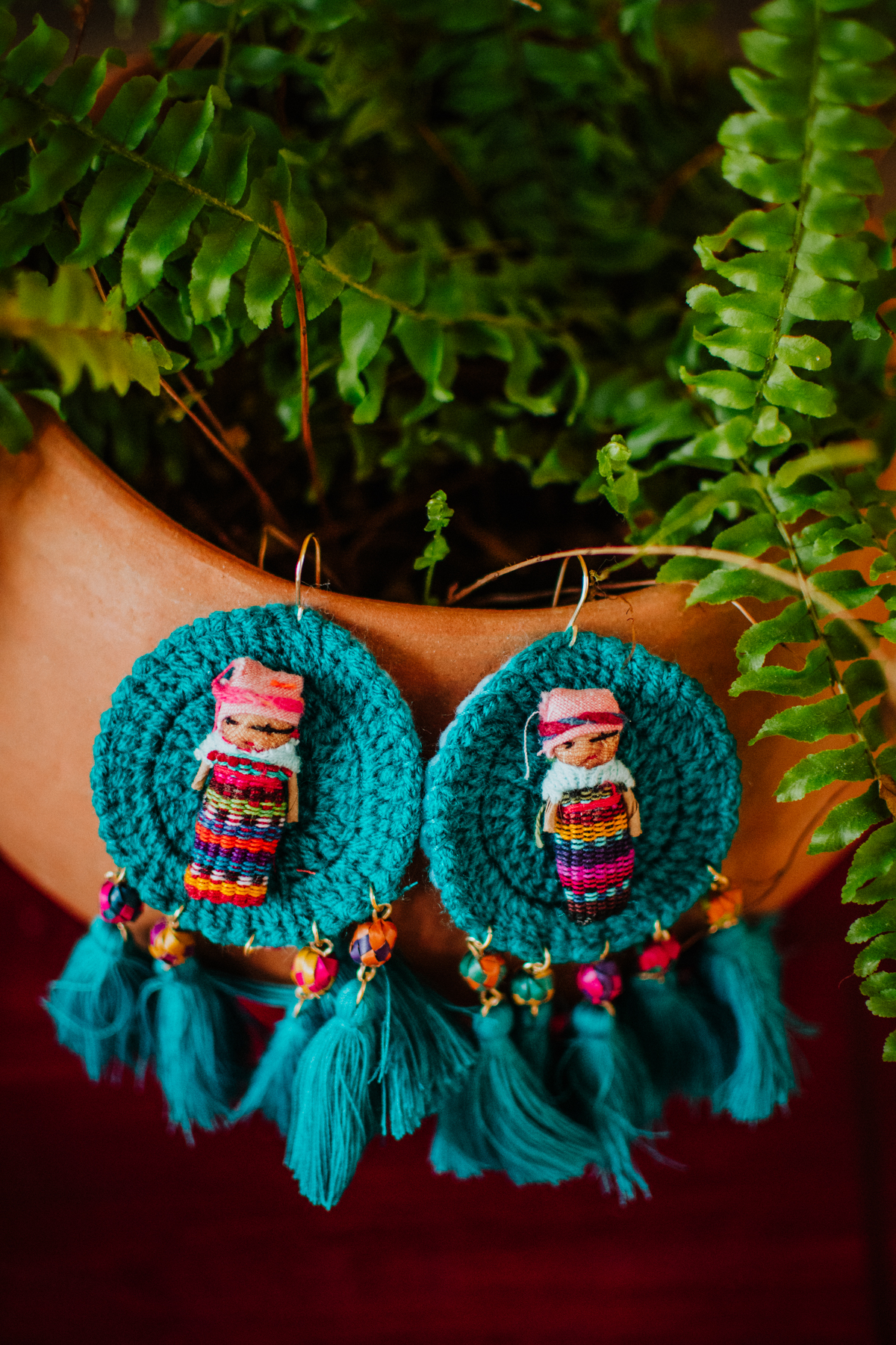 Maxi aretes con gancho africano, circulo tejido con hilos de algodón y pompones con piezas de palma tejidas y teñidas por artesanos de Guerrero. Muñequitas quitapenas incrustadas en los círculos tejidos.