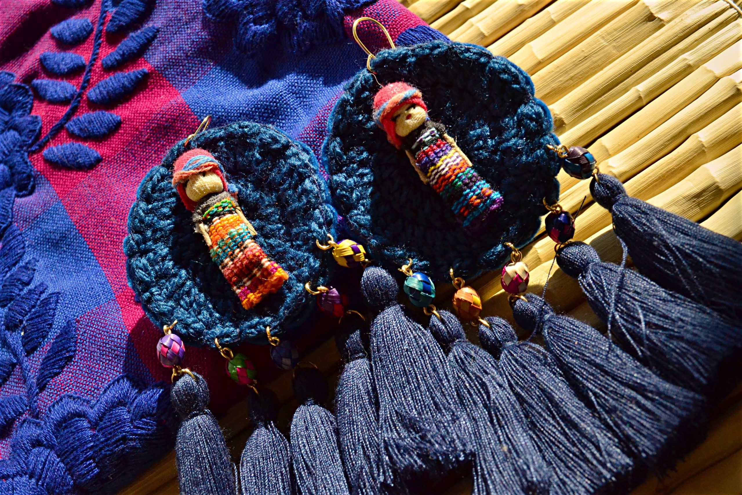 Maxi aretes con gancho africano, circulo tejido con hilos de algodón y pompones con piezas de palma tejidas y teñidas por artesanos de Guerrero. Muñequitas quitapenas incrustadas en los círculos tejidos.