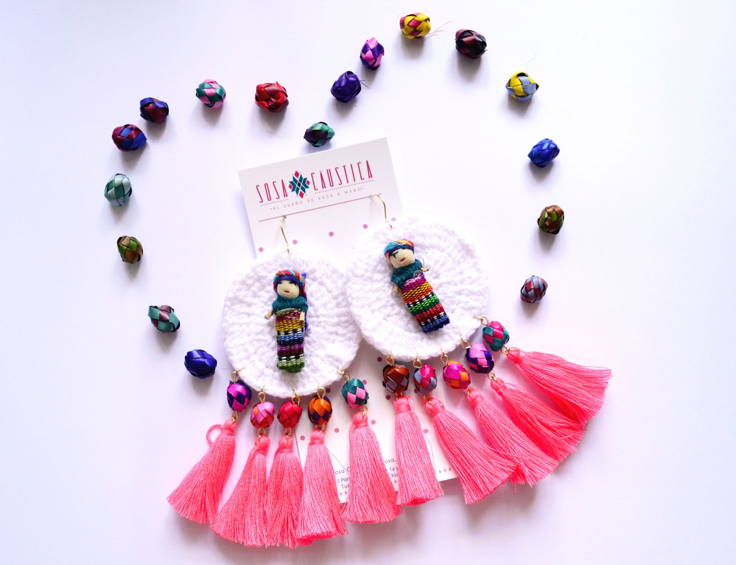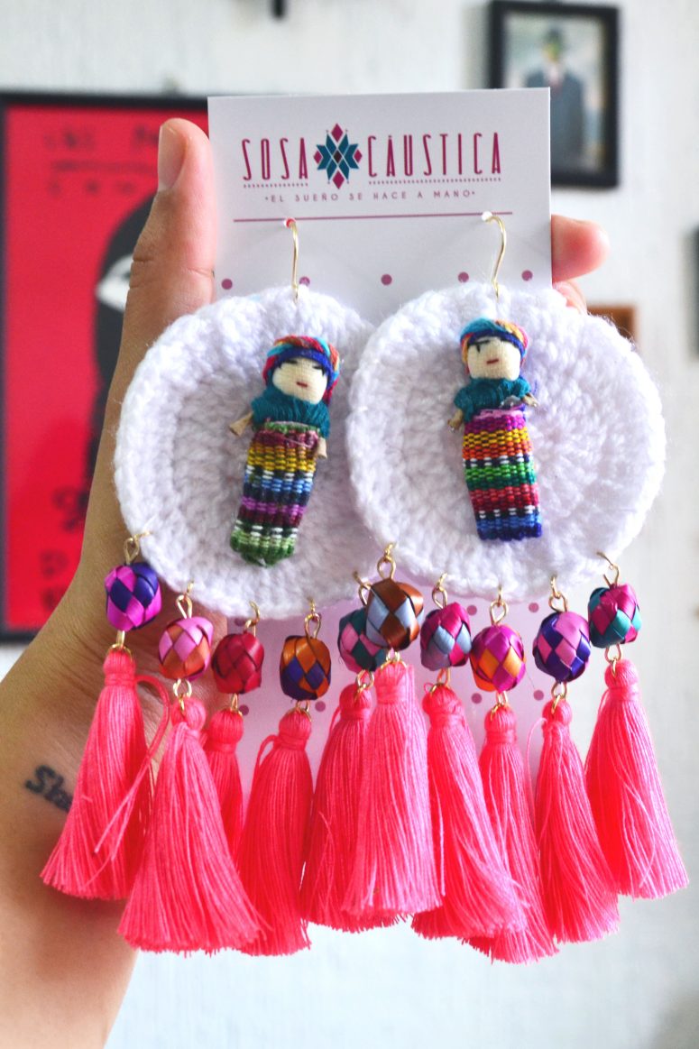 Maxi aretes con gancho africano, circulo tejido con hilos de algodón y pompones con piezas de palma tejidas y teñidas por artesanos de Guerrero. Muñequitas quitapenas incrustadas en los círculos tejidos.