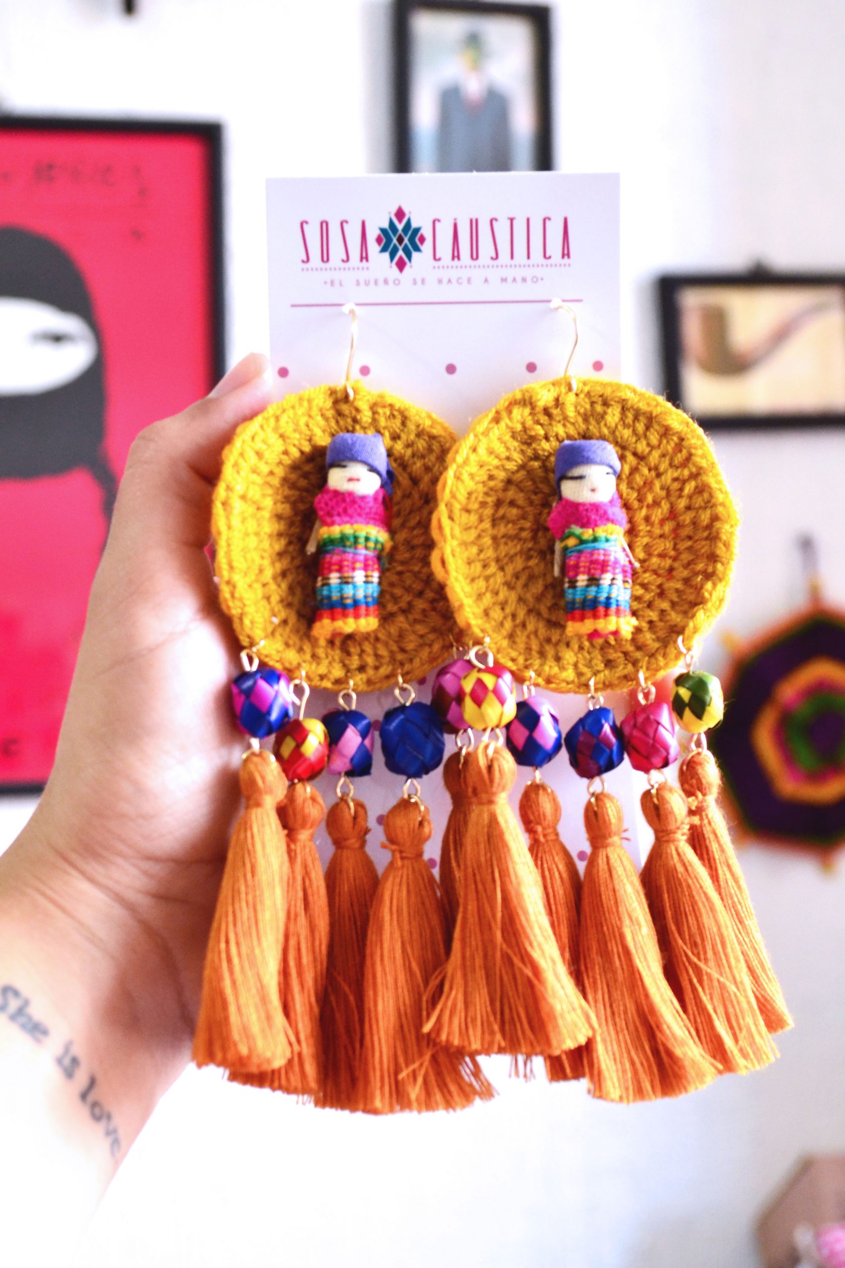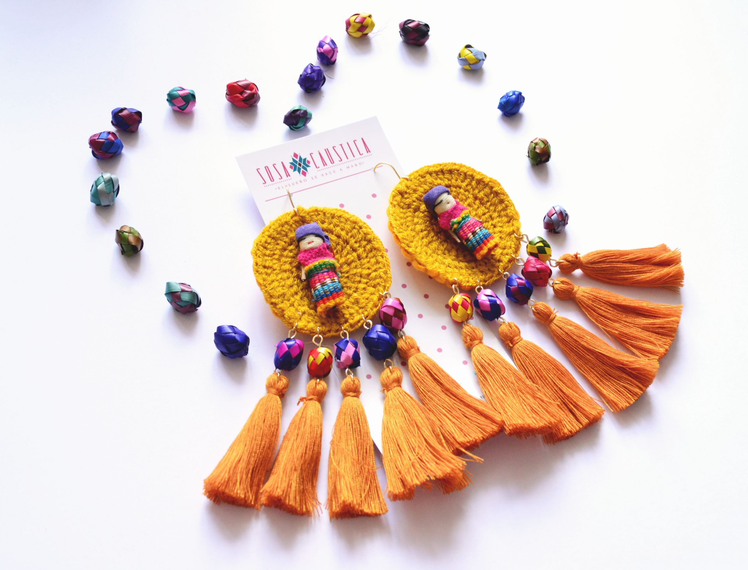 Maxi aretes con gancho africano, circulo tejido con hilos de algodón y pompones con piezas de palma tejidas y teñidas por artesanos de Guerrero. Muñequitas quitapenas incrustadas en los círculos tejidos.