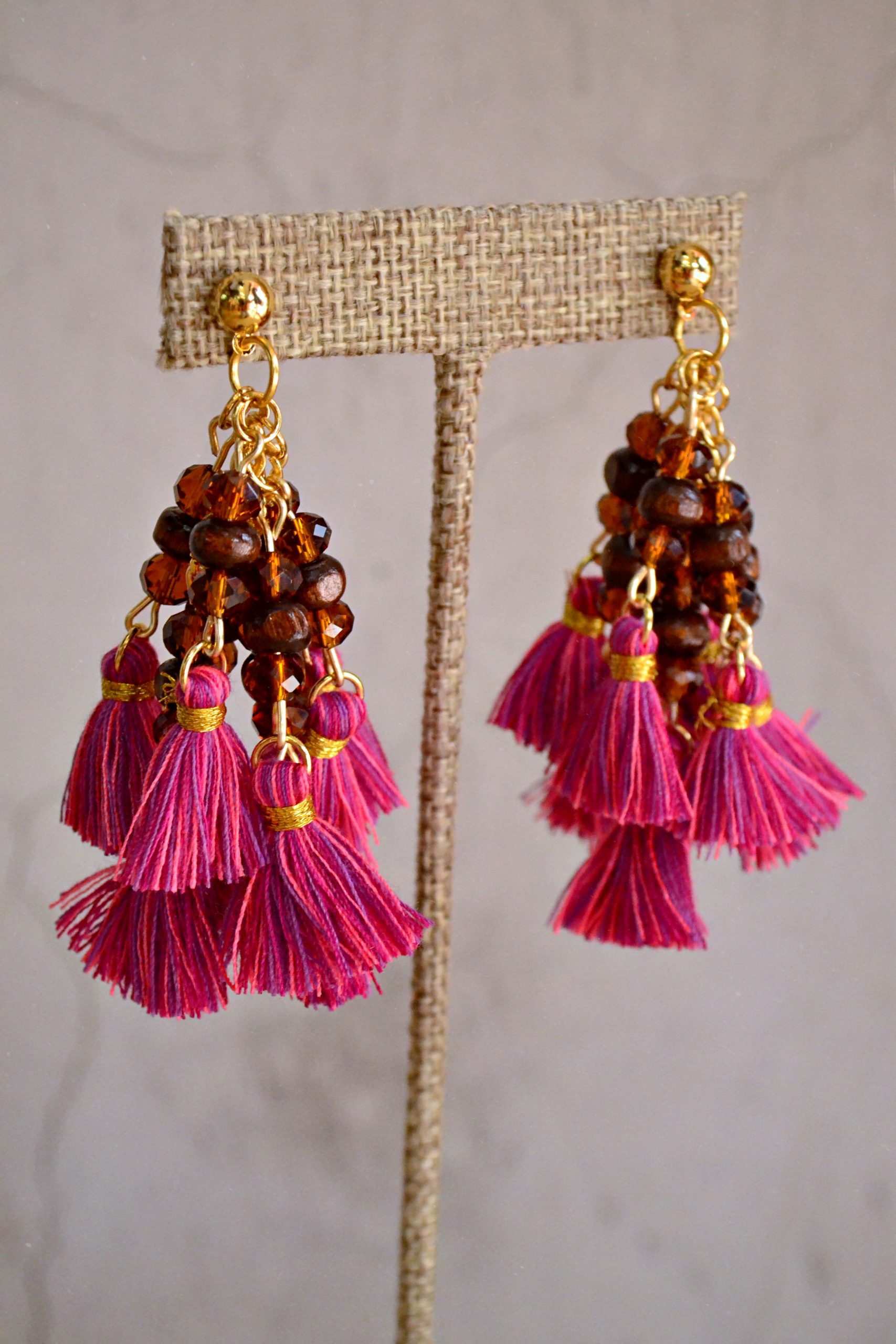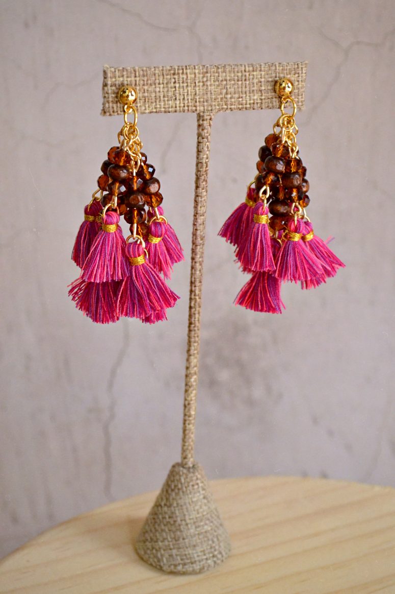 Aretes con broquel y racimo de pompones, tiene cuentas de madera y cristales facetados. Los hilos son de algodón y los componentes de chapa de oro.