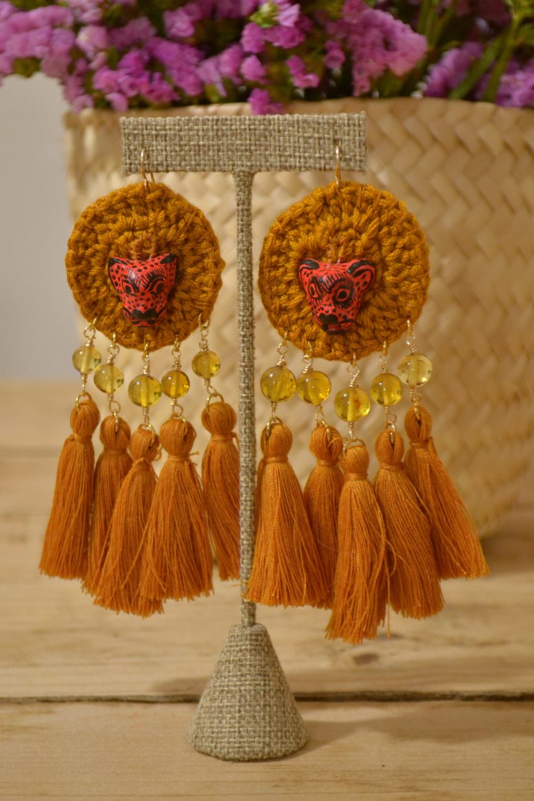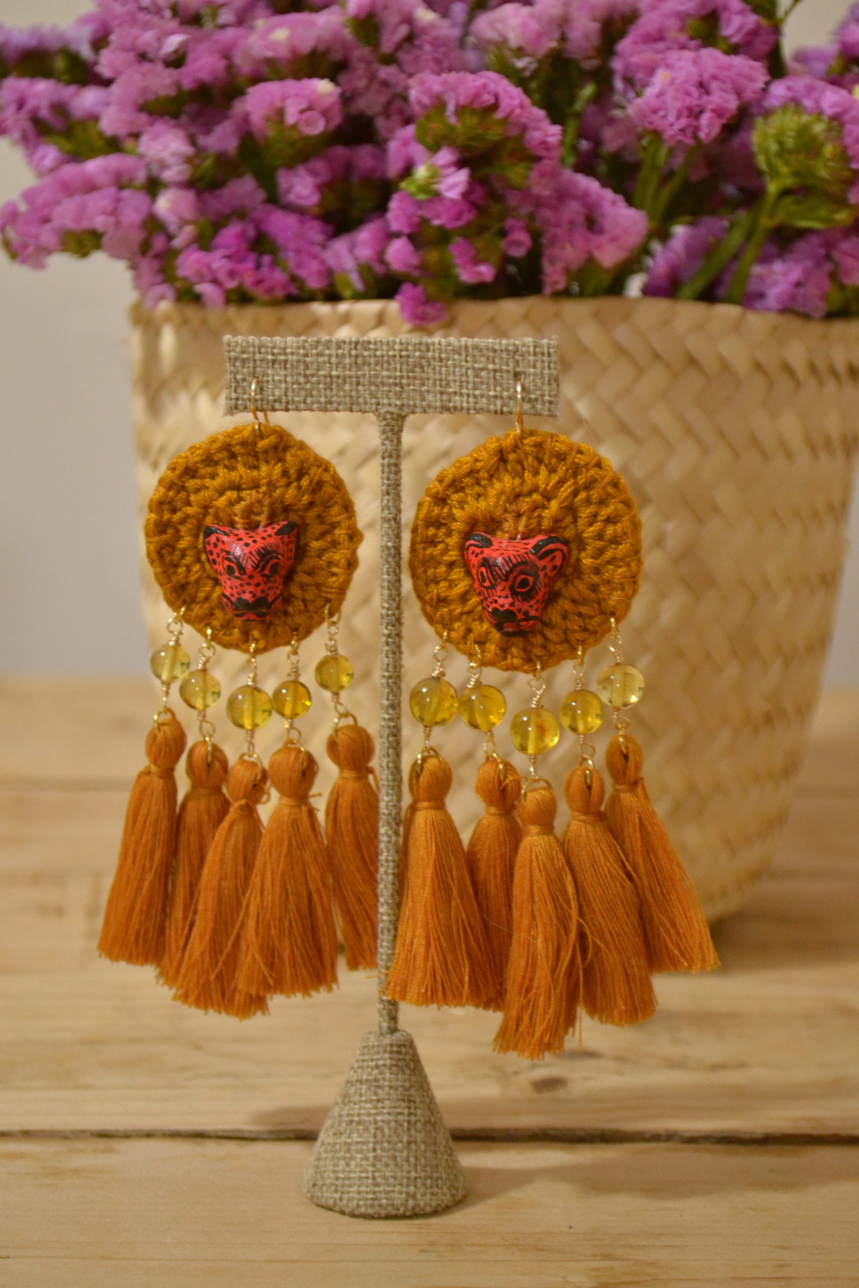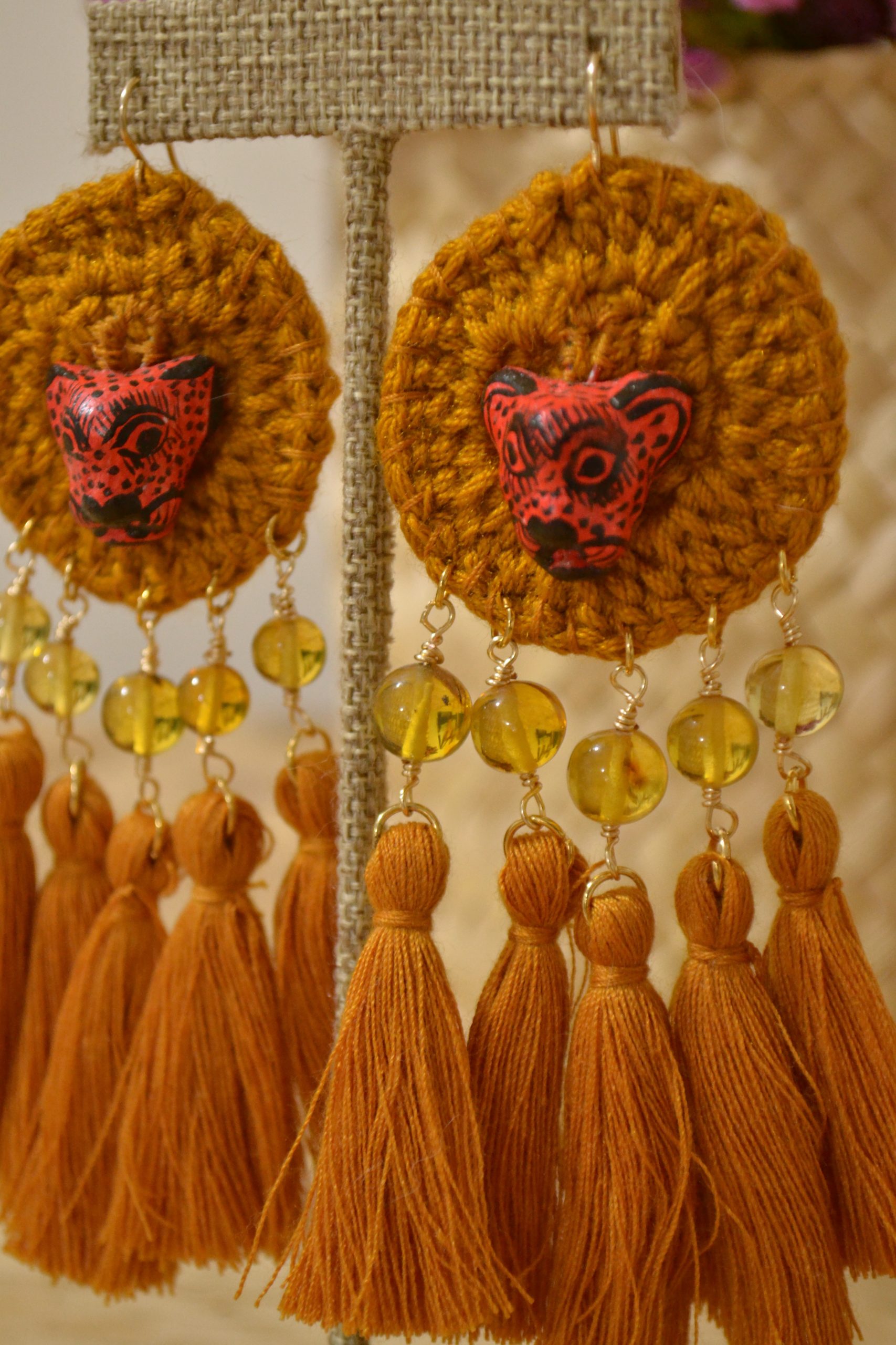 Maxi aretes tejido a crochet con cabecitas de jaguares moldeadas y decoradas a mano por la artesana Paulina Bautista, originaria de Amatenango Del Valle. Cuenta con esferas de ámbar auténtico de Simojovel y pompones de hilo de algodón. Componentes de chapa de oro.
