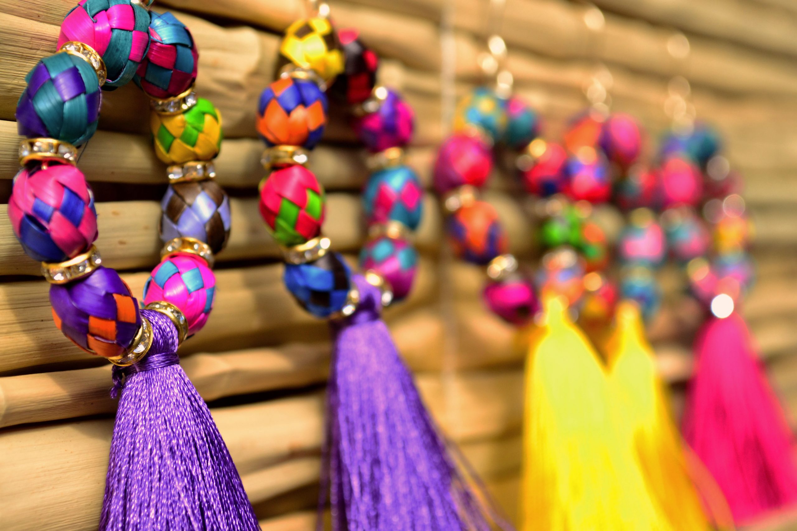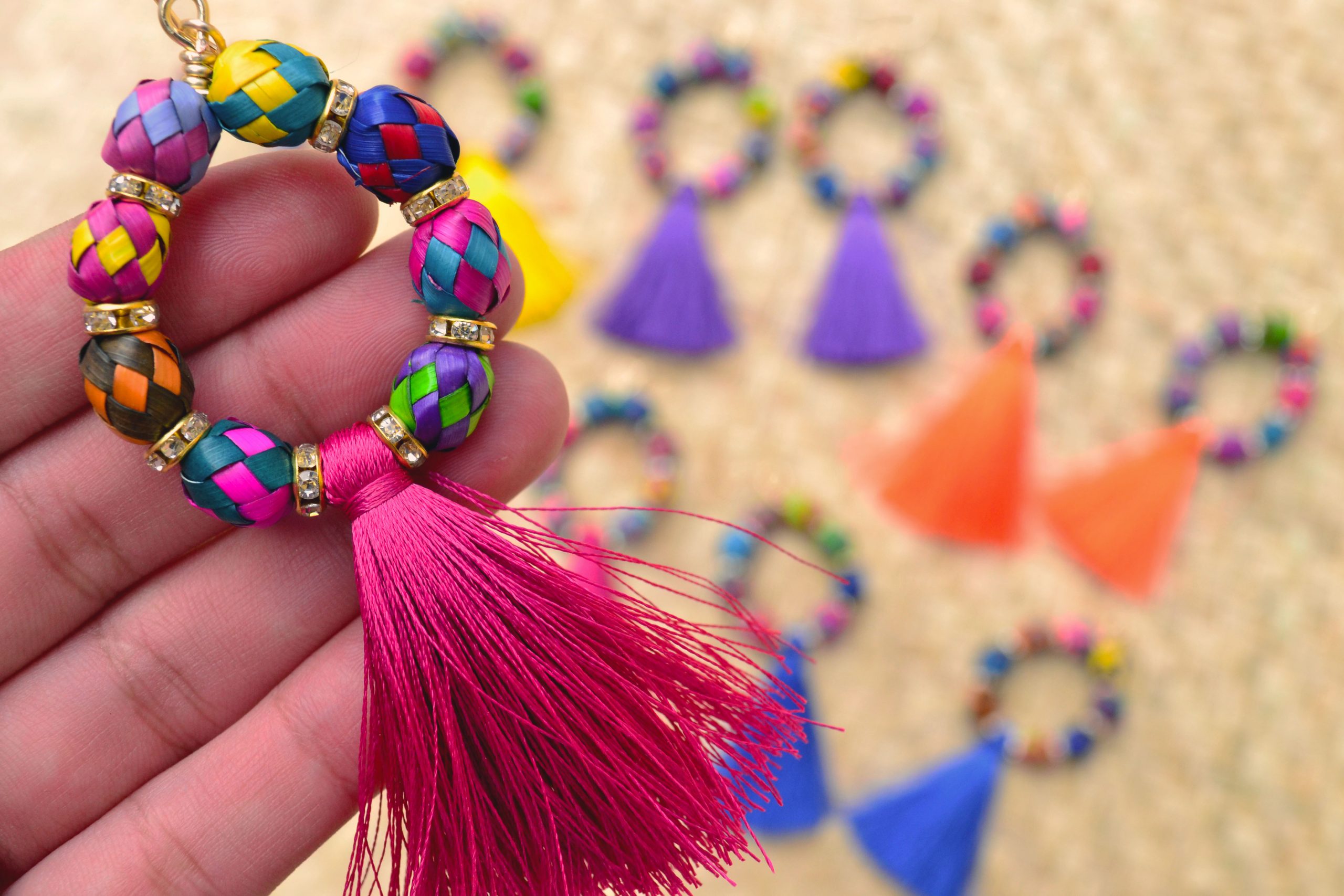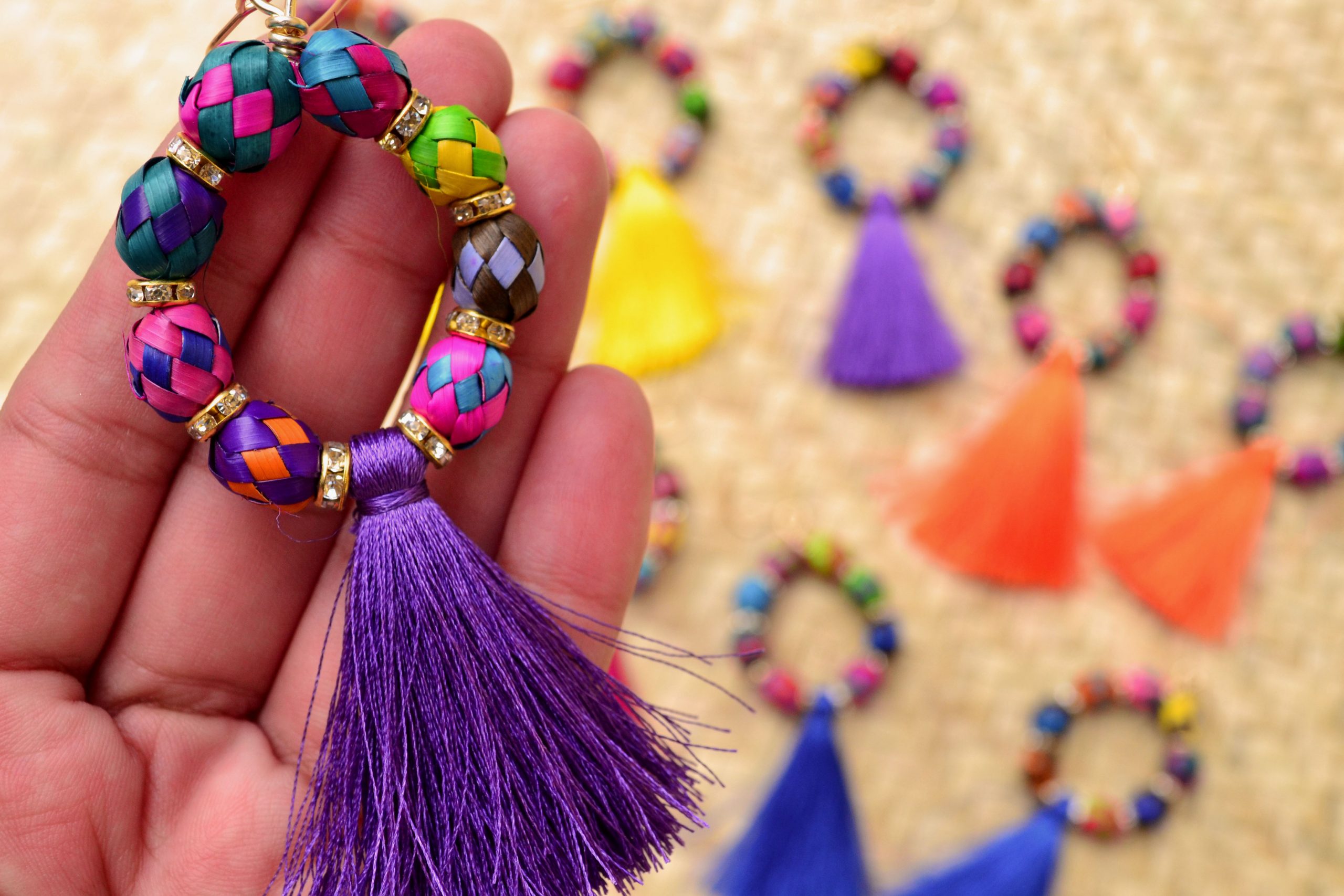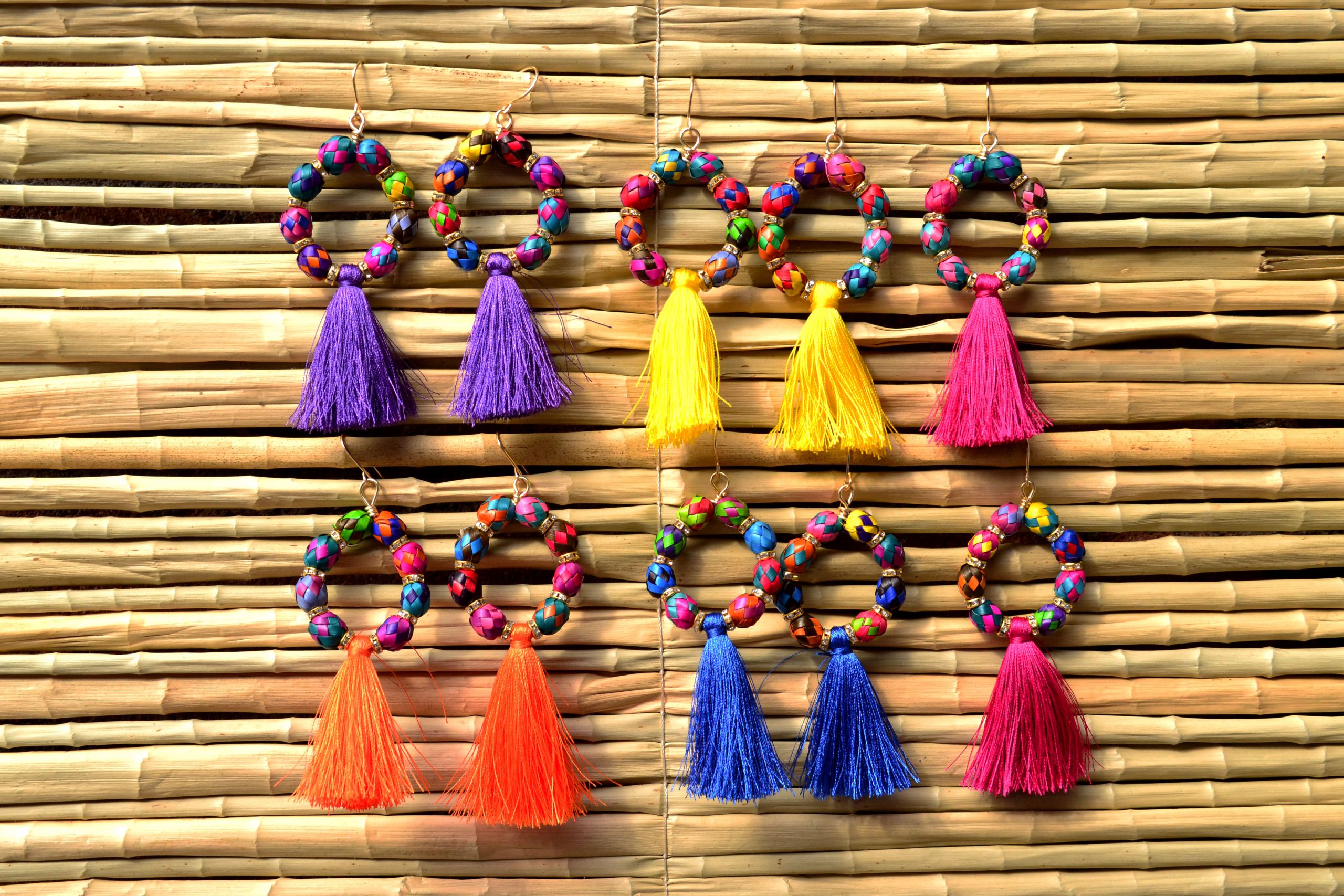 Aretes con gancho africano y pieza de palma tejida y teñida por artesanos  de Guerrero, simula unas arracadas. Al centro cuenta con un pompón de hilos de seda que puede elegir en el color de tu preferencia.