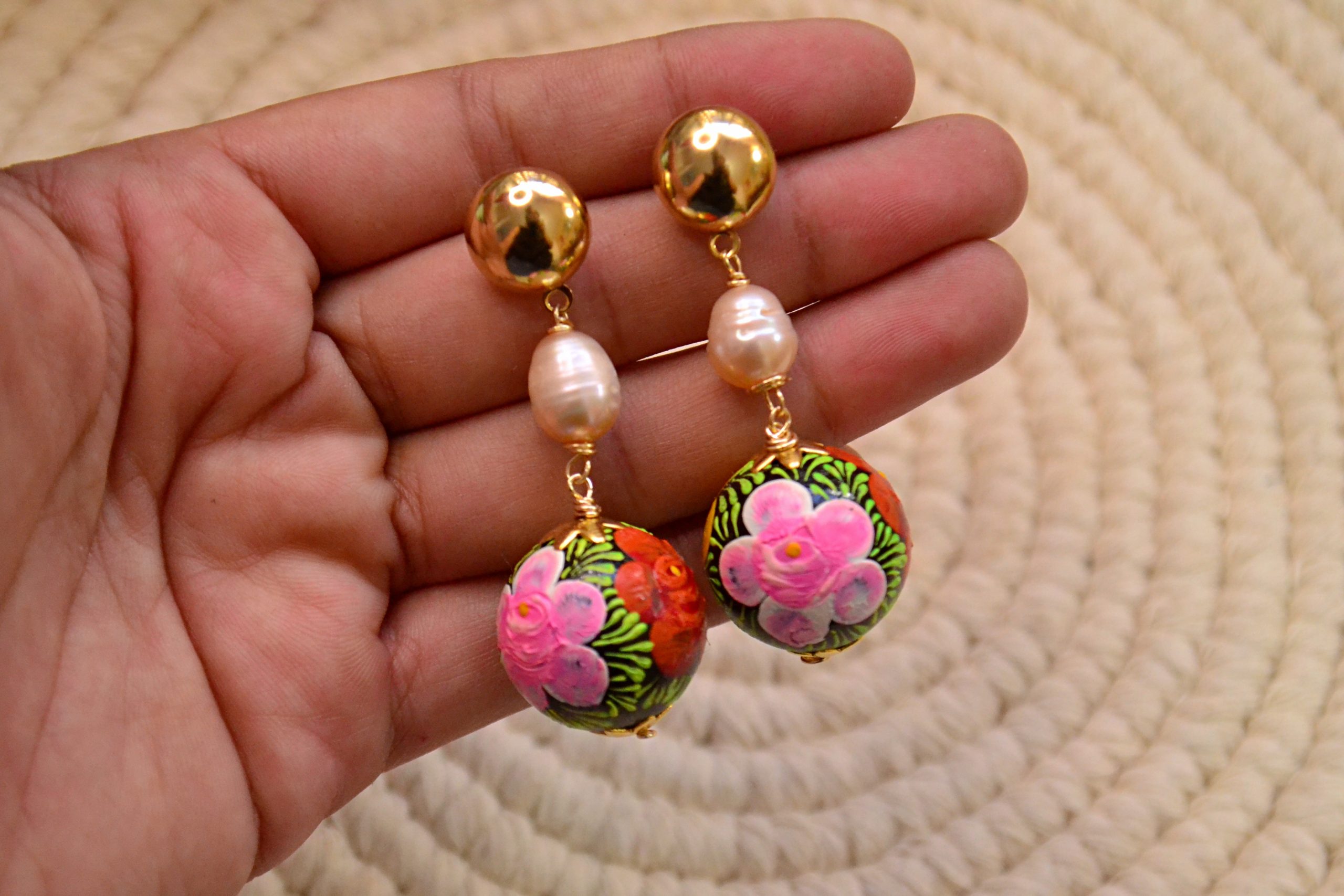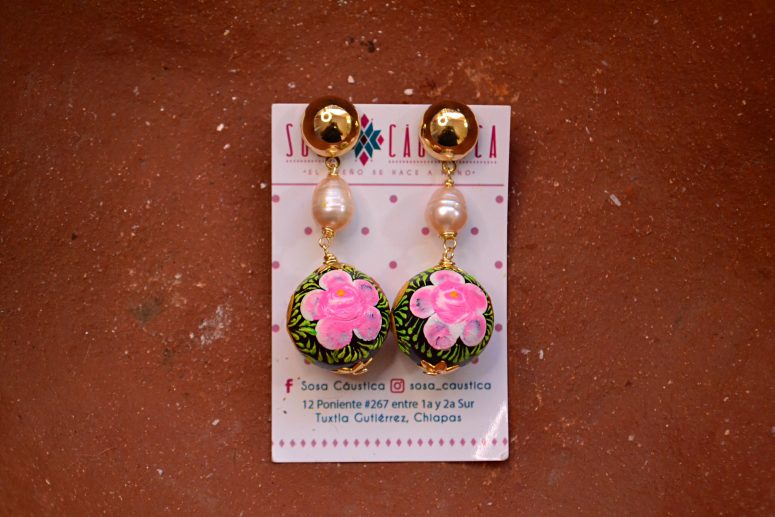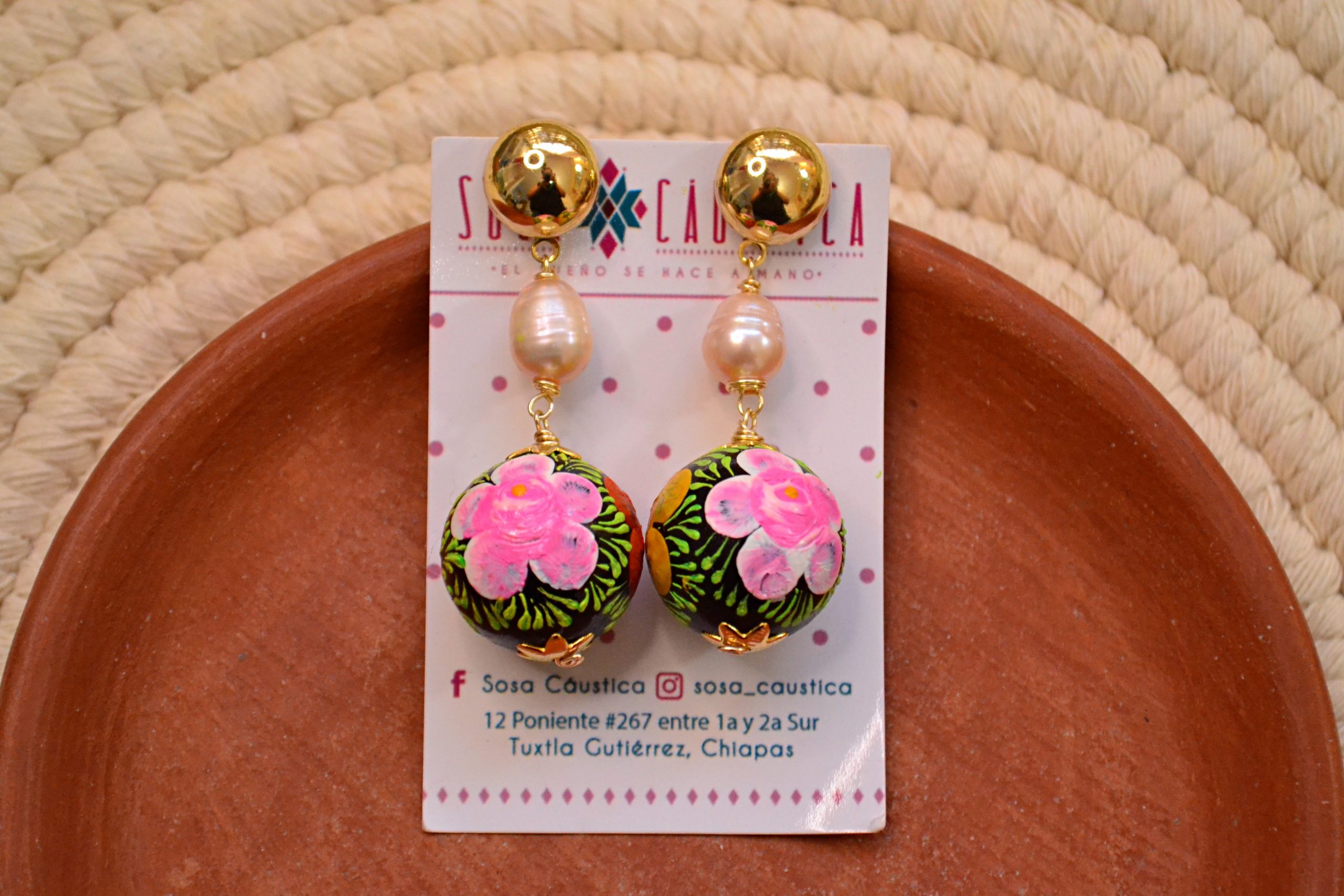 Aretes de broquel grande con perlas de río engarzadas y esferas decoradas con la técnica tradicional de Chiapa de Corzo. Todos los componentes (broqueles, alambre, esferitas, etc.) son de chapa de oro.
