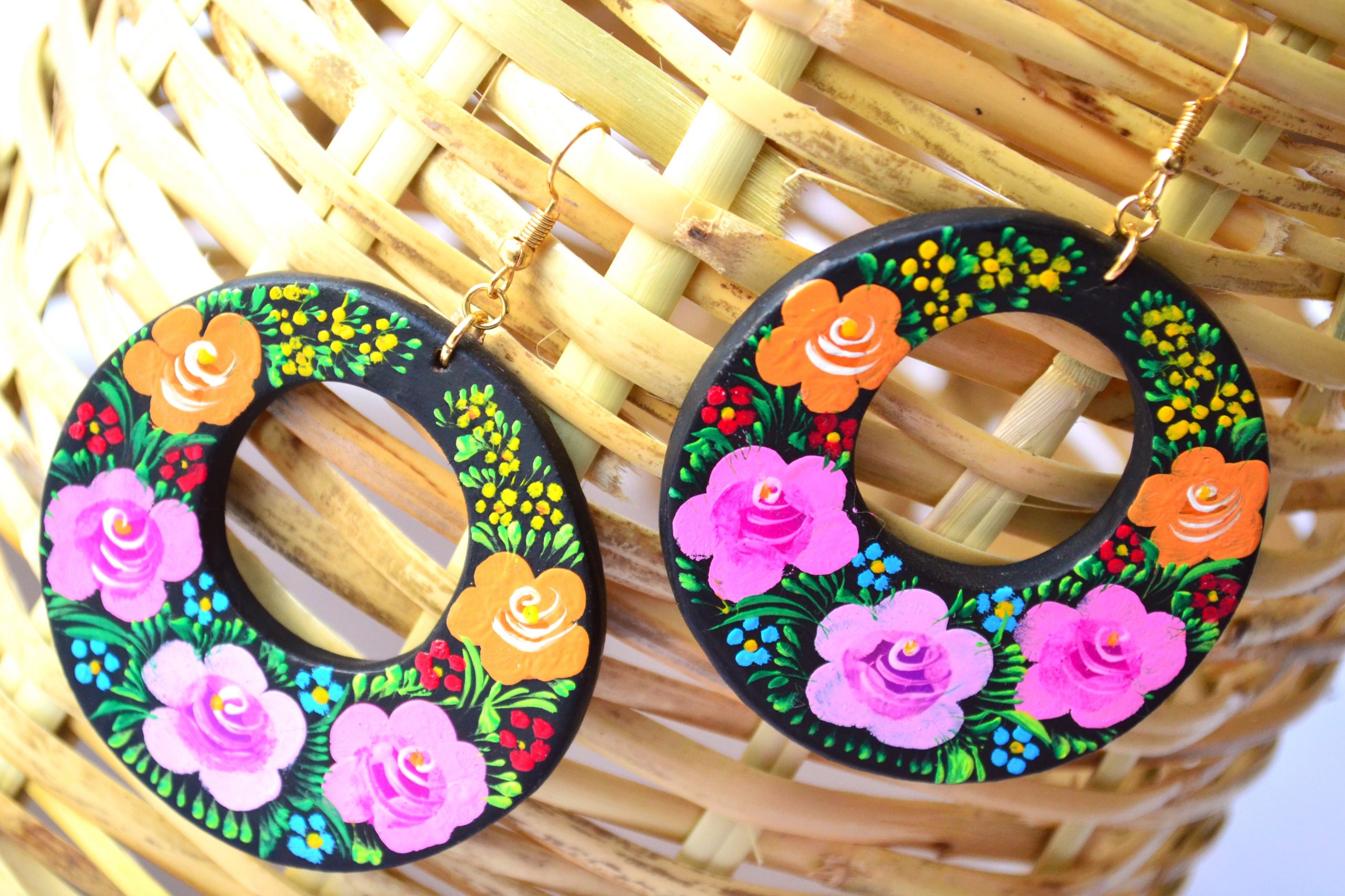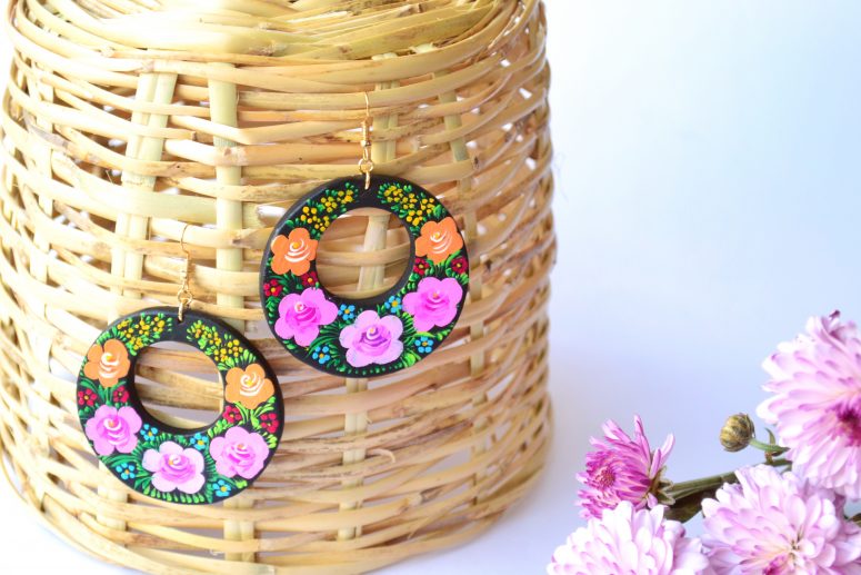 Arracadas de madera pintadas con la técnica tradicional de Chiapa de Corzo, Chiapas. Con gancho africano de chapa de oro.