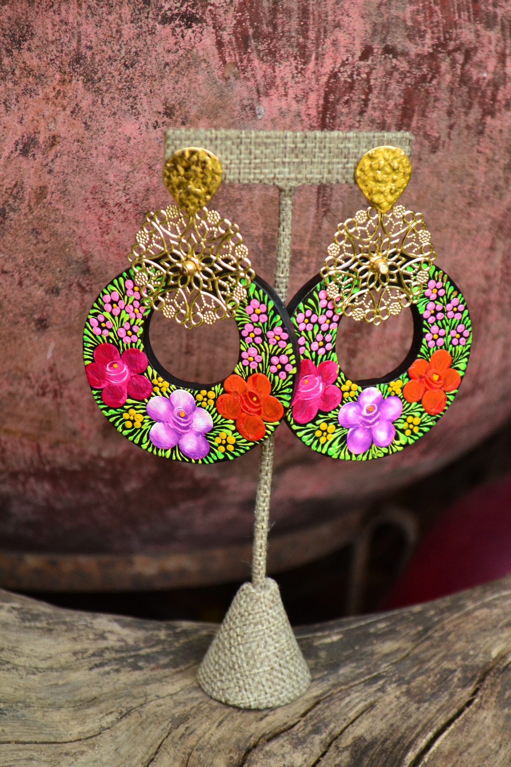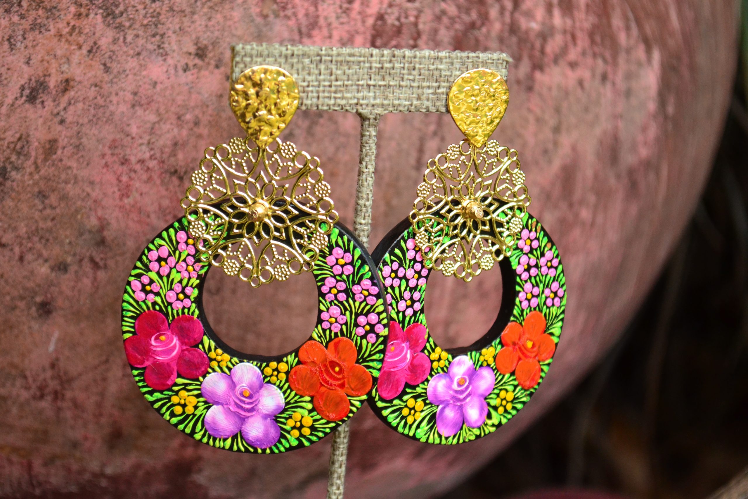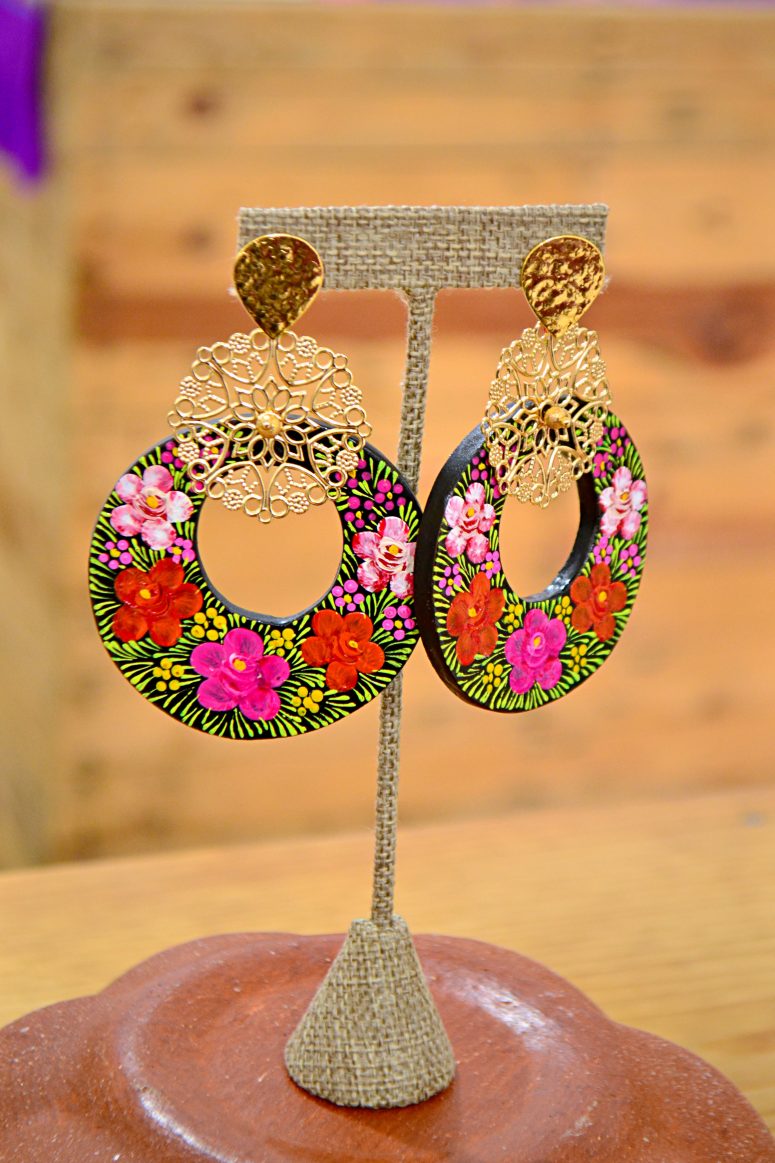 Aretes de broquel de tamaño grande con arracada de madera pintada con el decorado tradicional de Chiapa de Corzo. Componentes de chapa de oro.