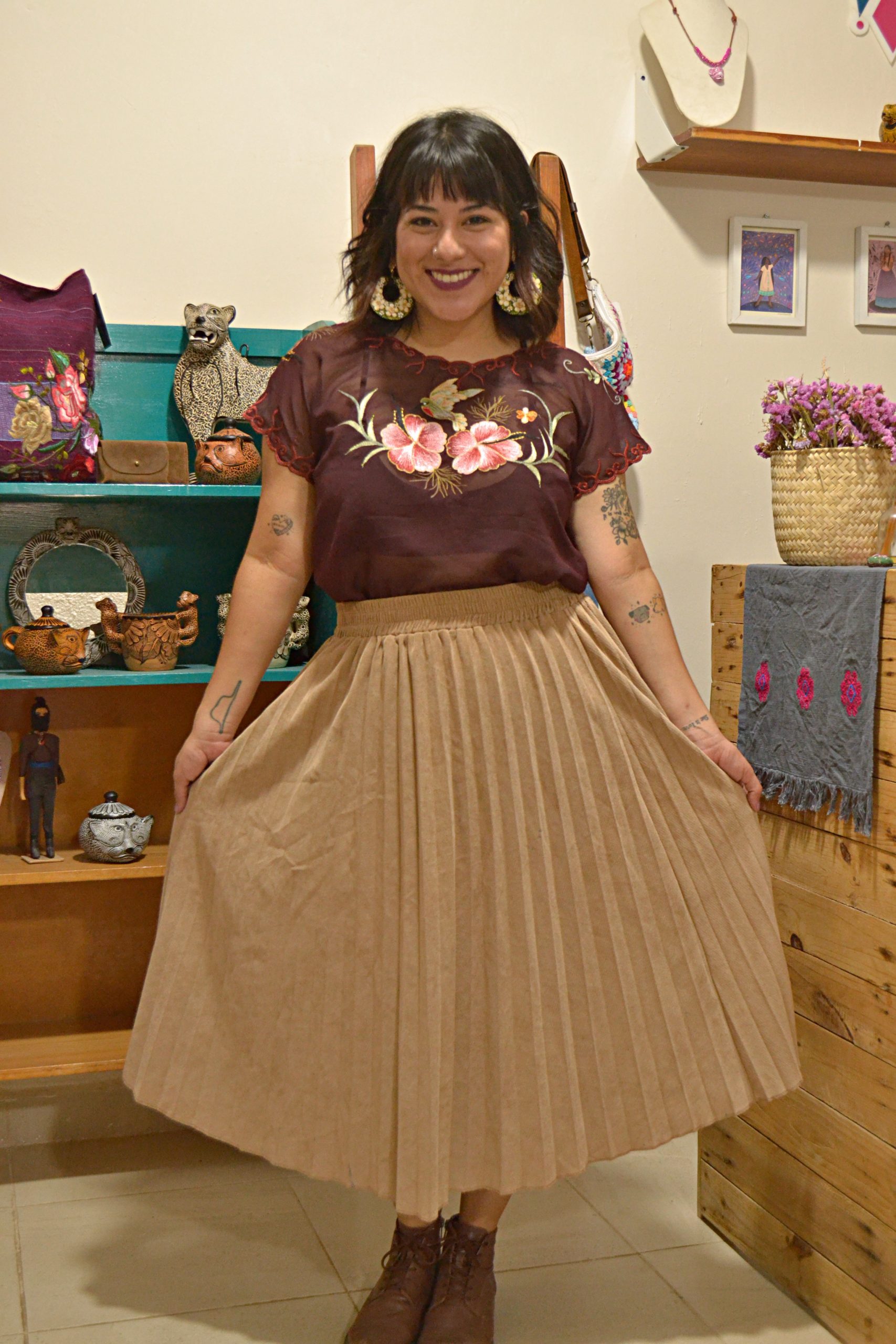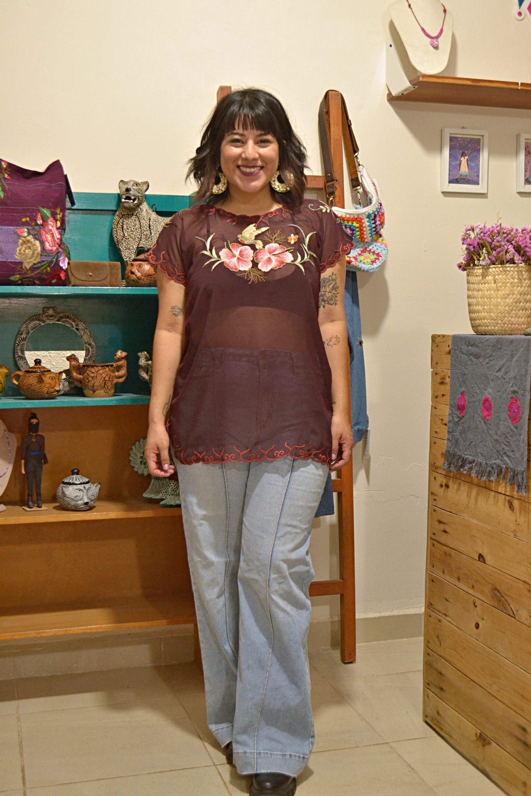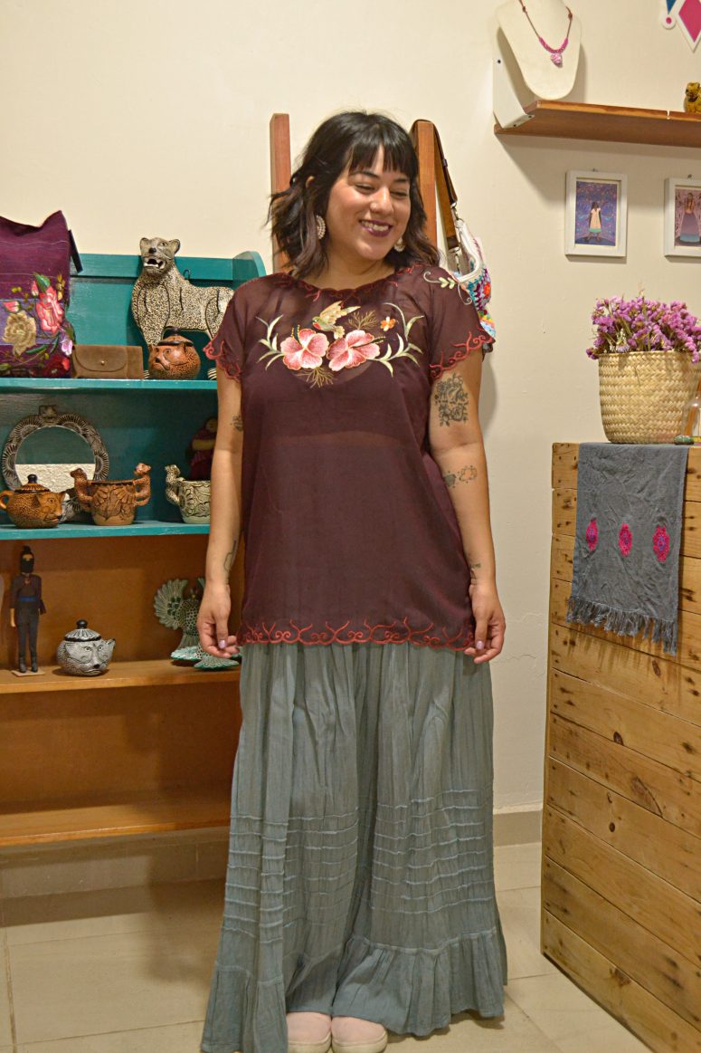 Blusa de gasa con bordado de flores y colibríes hecho con máquinas de pedal por artesanas de Jech Chentic, Zinacantán en Chiapas.