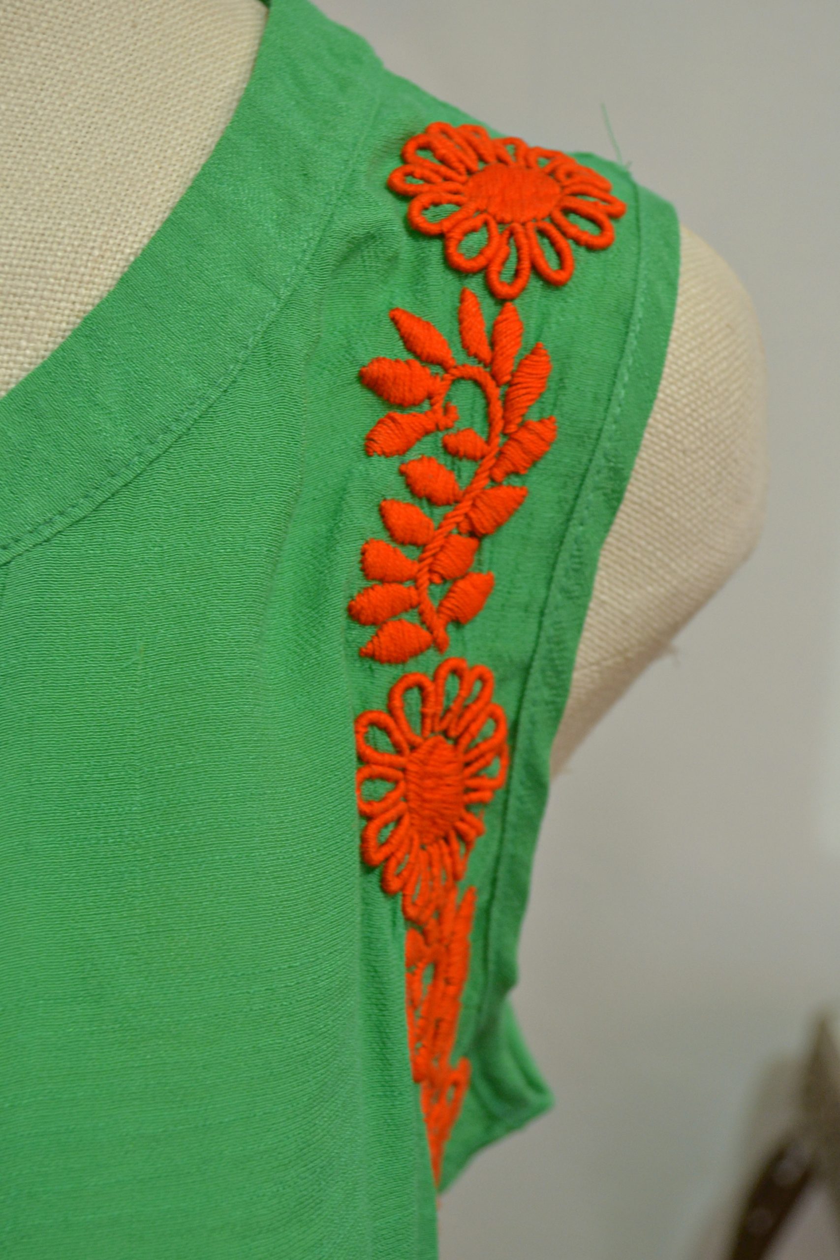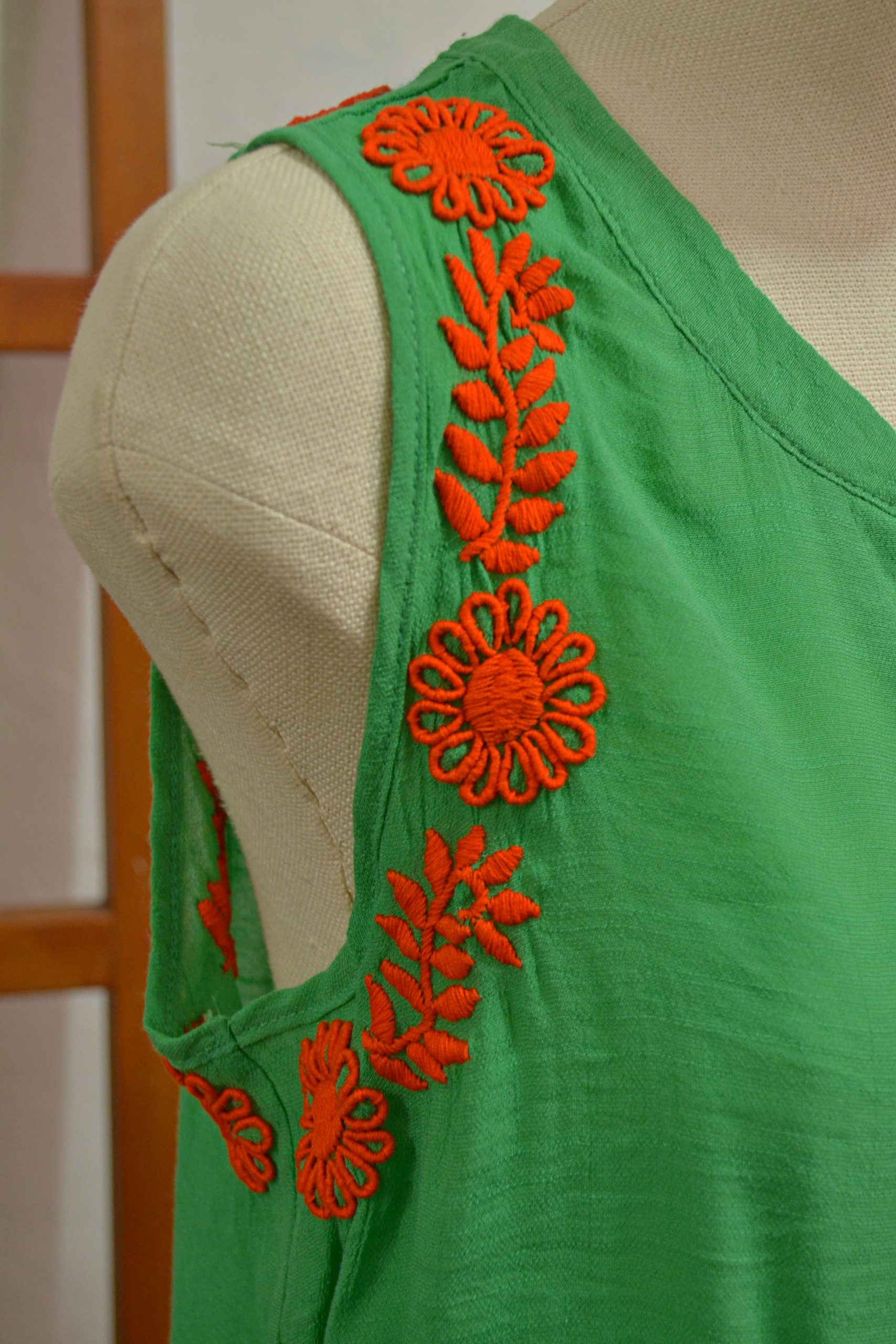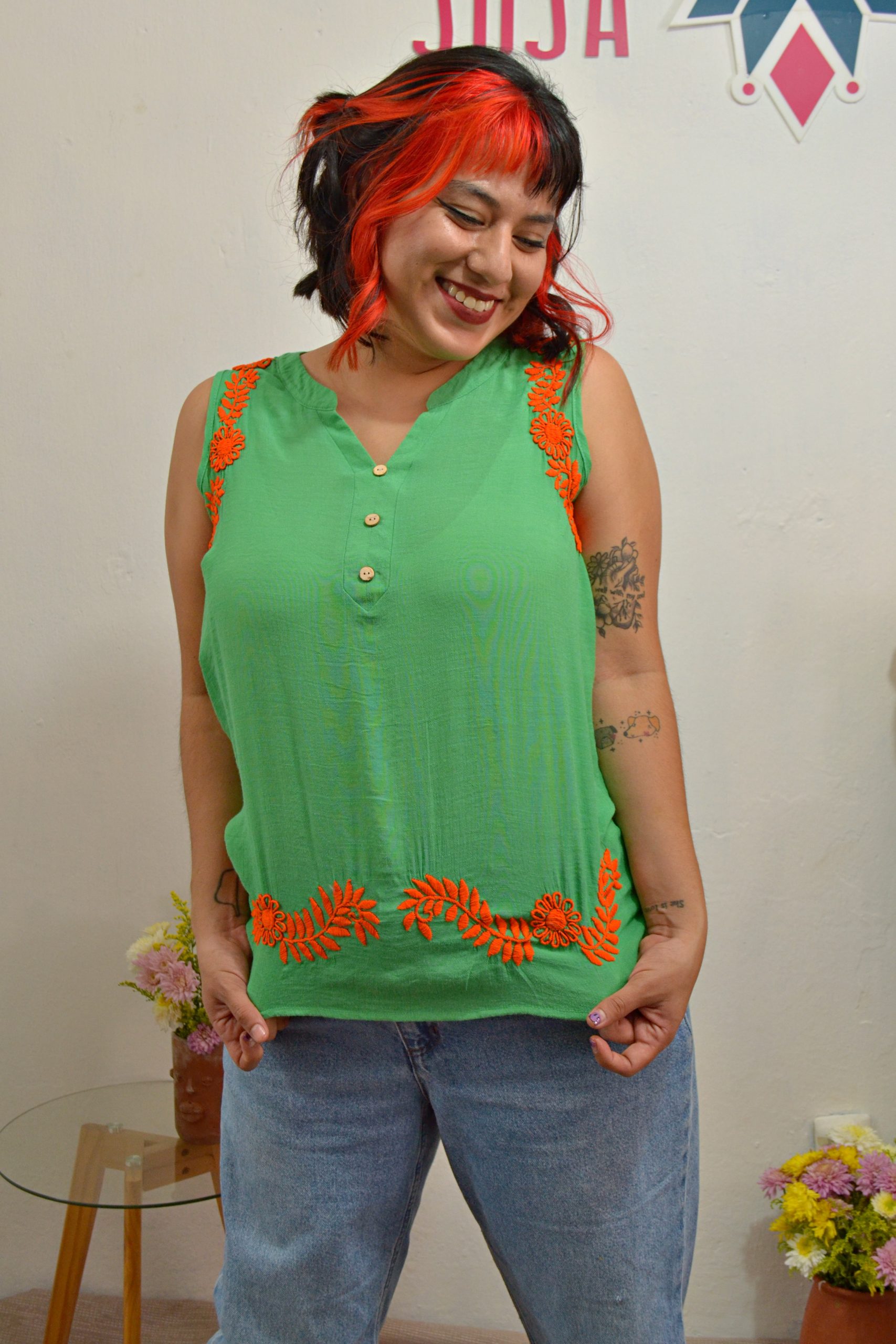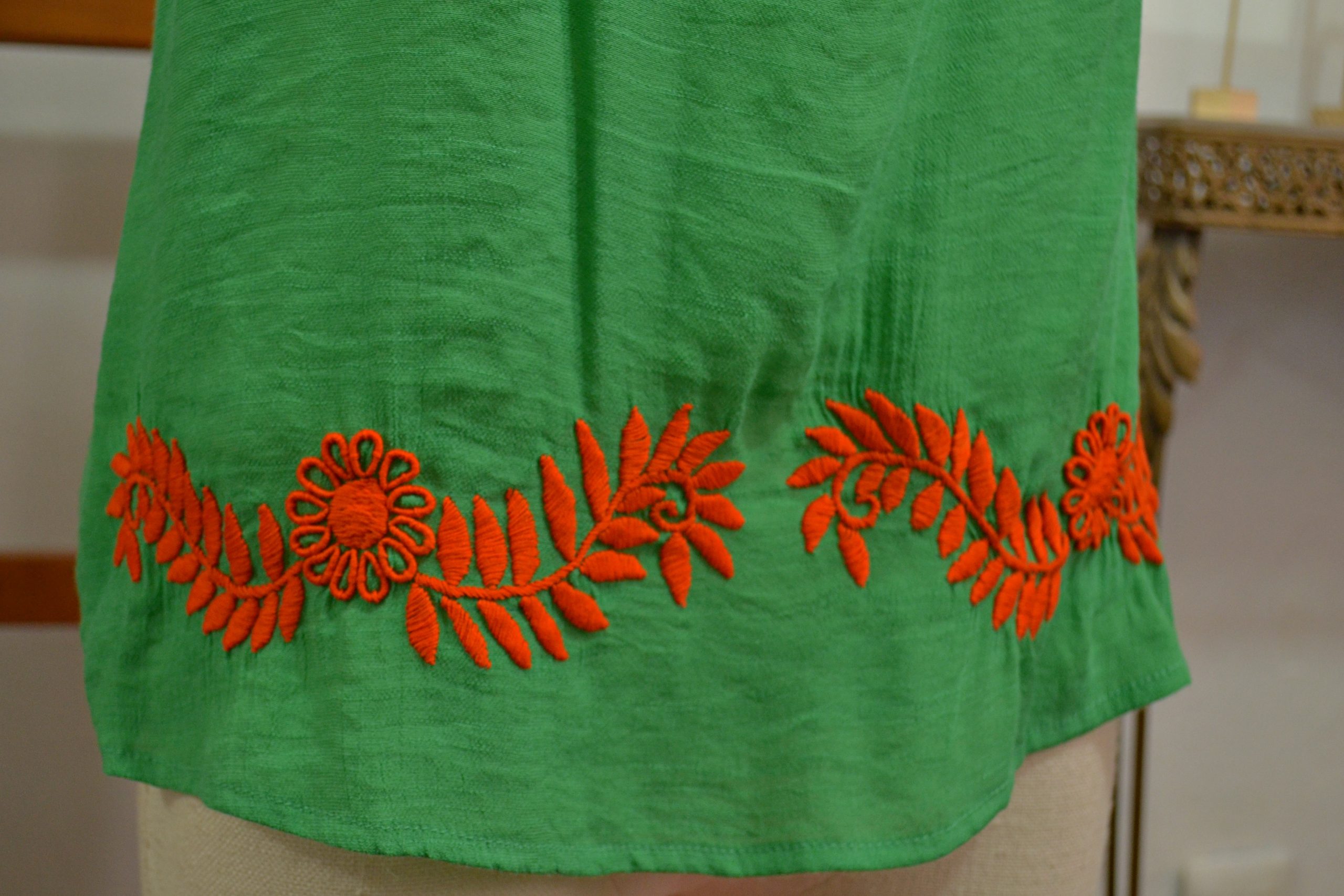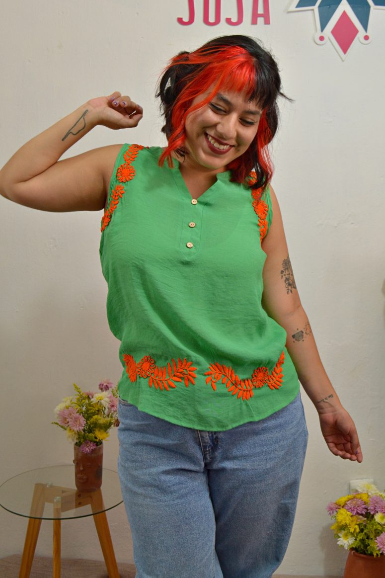 Blusa talla Grande: Prenda pre-amada, a esta prenda se le ha dado una segunda oportunidad interviniéndola con el bordado de margaritas hecho a mano por la artesana Juana Aguilar, originaria de Aguacatenango, Chiapas.