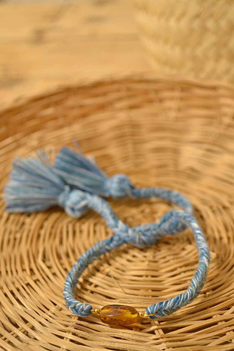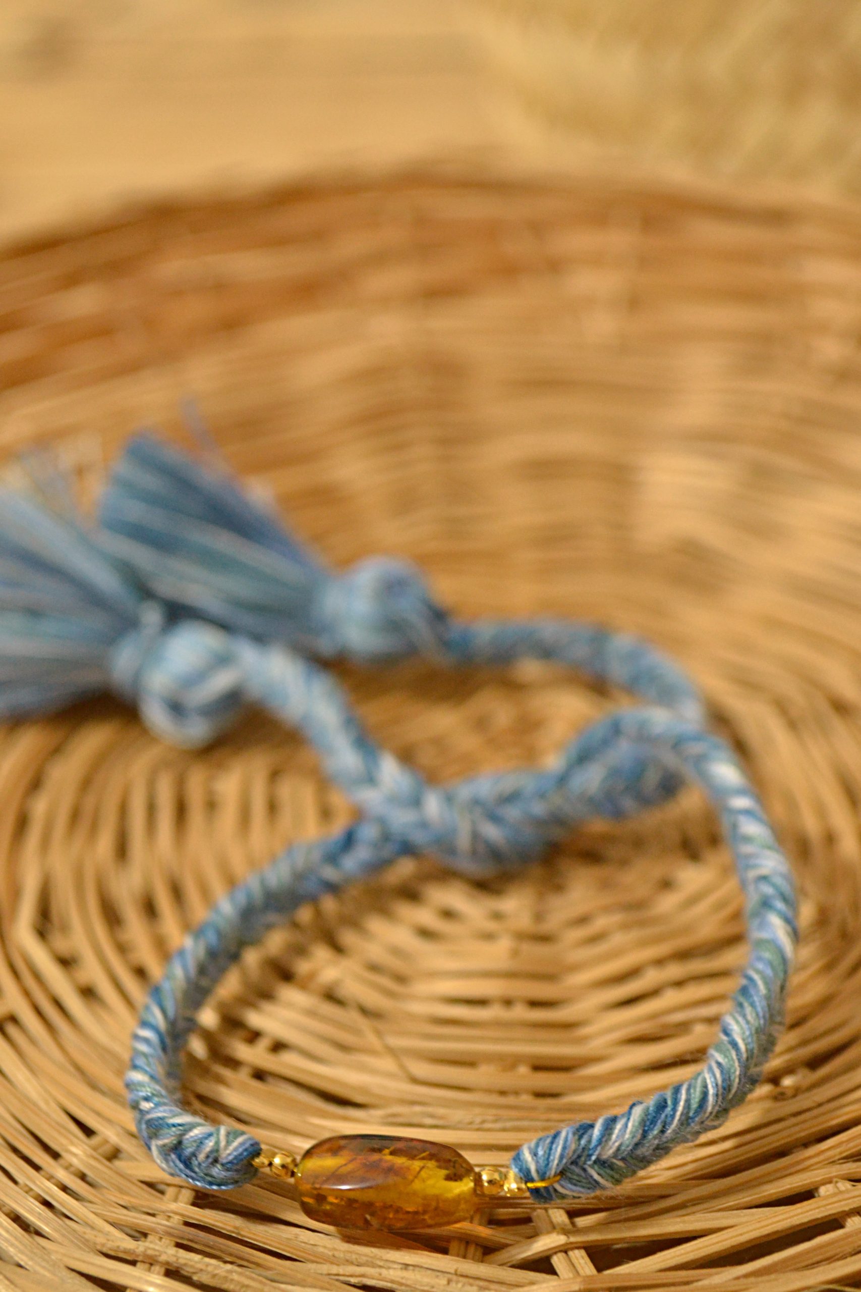 Pulsera ajustable de trenzas de espiga elaboradas con hilos de algodón, el dije central es una pieza de ámbar auténtico de Simojovel, Chiapas. Los pompones gorditos al final de la pulsera le dan el toque único y divertido.