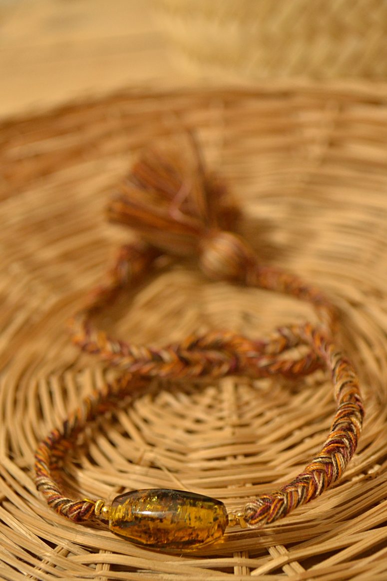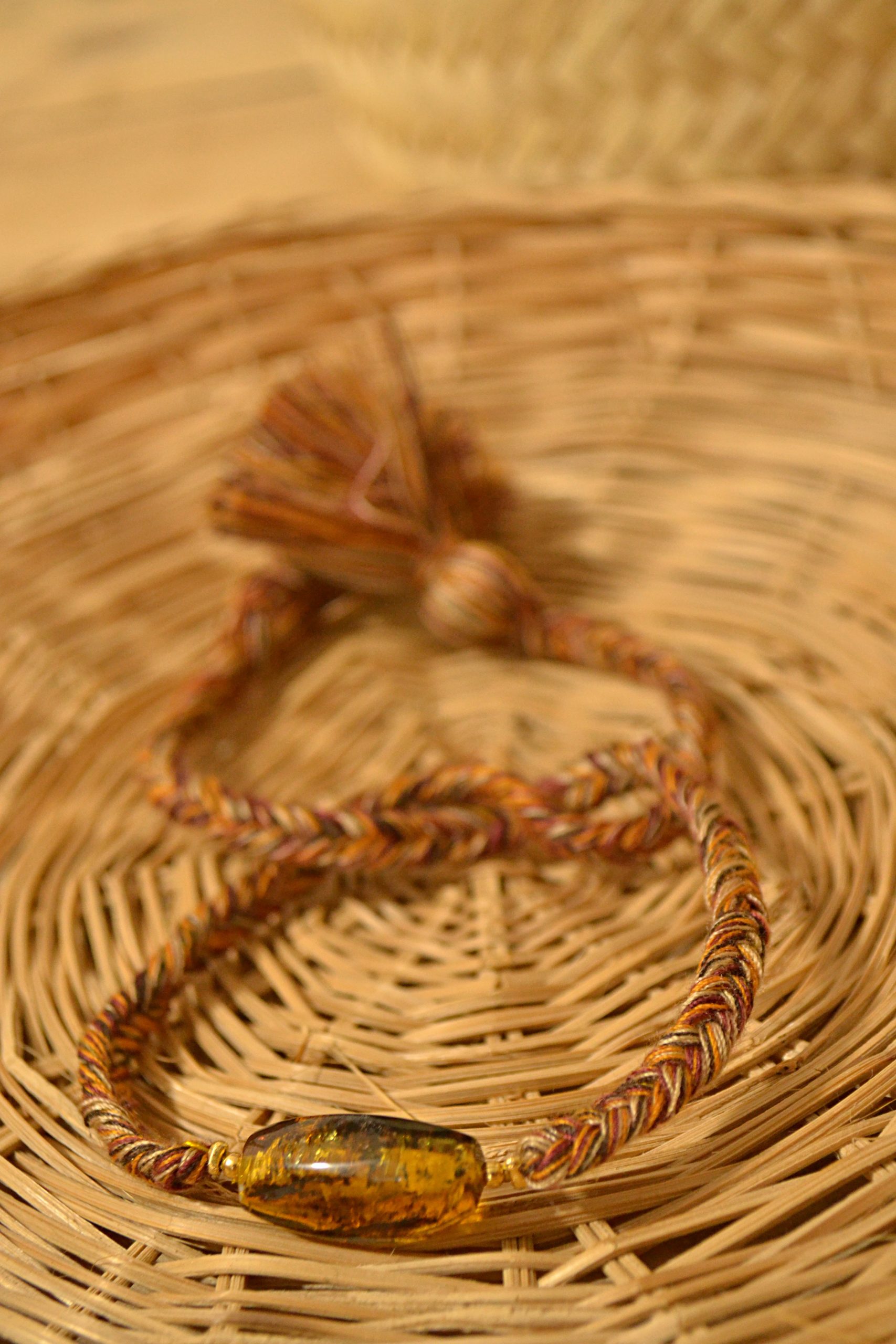 Pulsera ajustable de trenzas de espiga elaboradas con hilos de algodón, el dije central es una pieza de ámbar auténtico de Simojovel, Chiapas. Los pompones gorditos al final de la pulsera le dan el toque único y divertido.