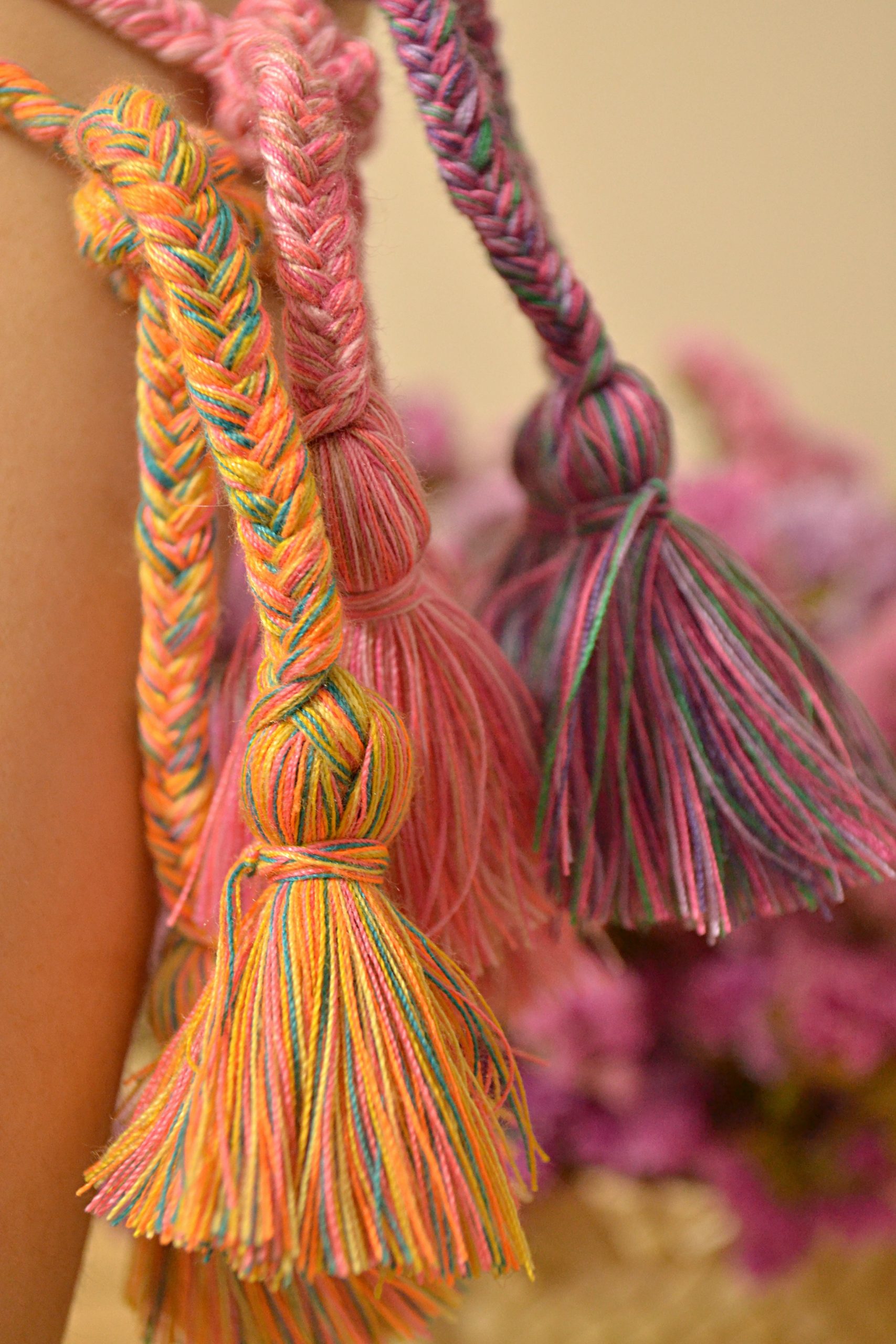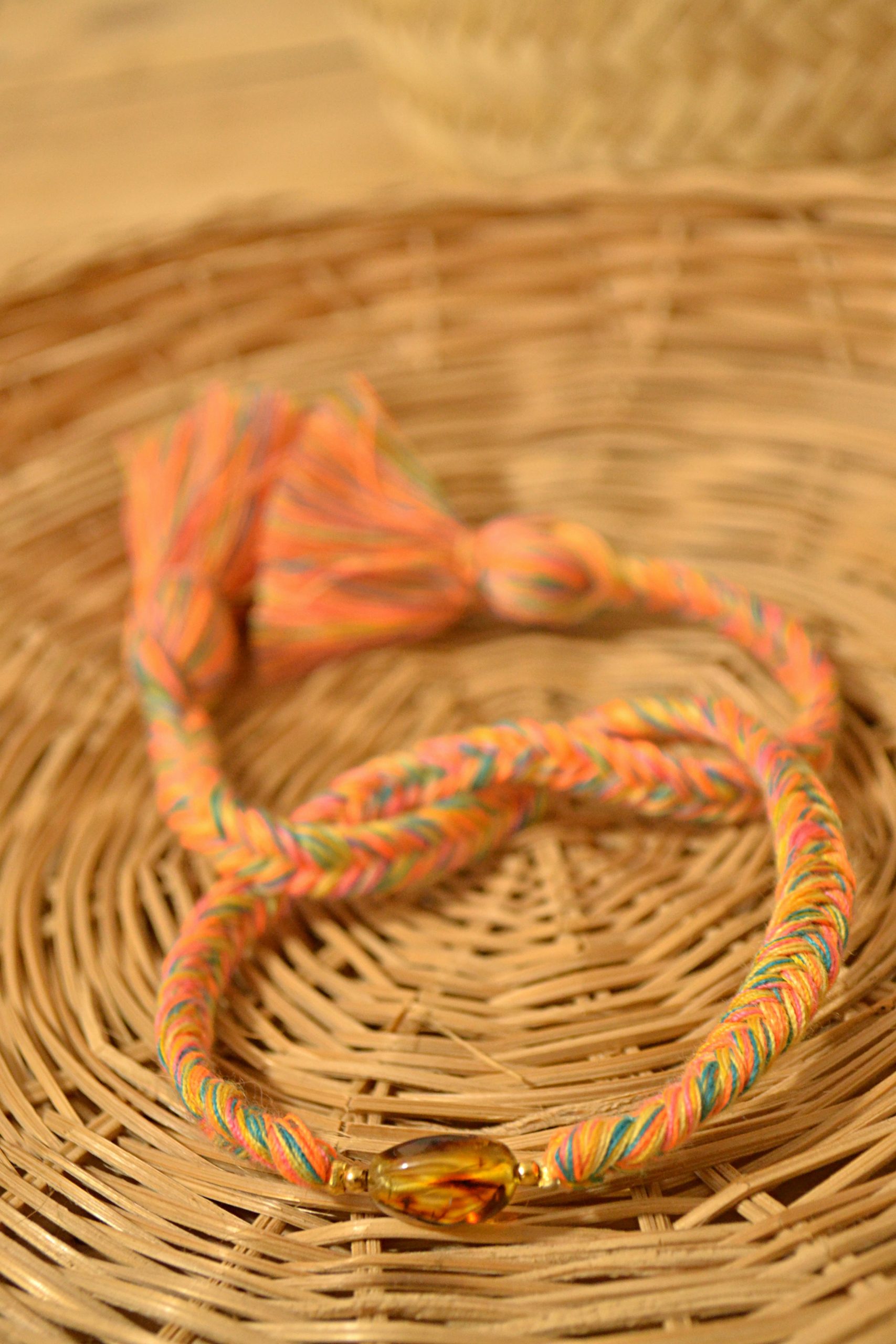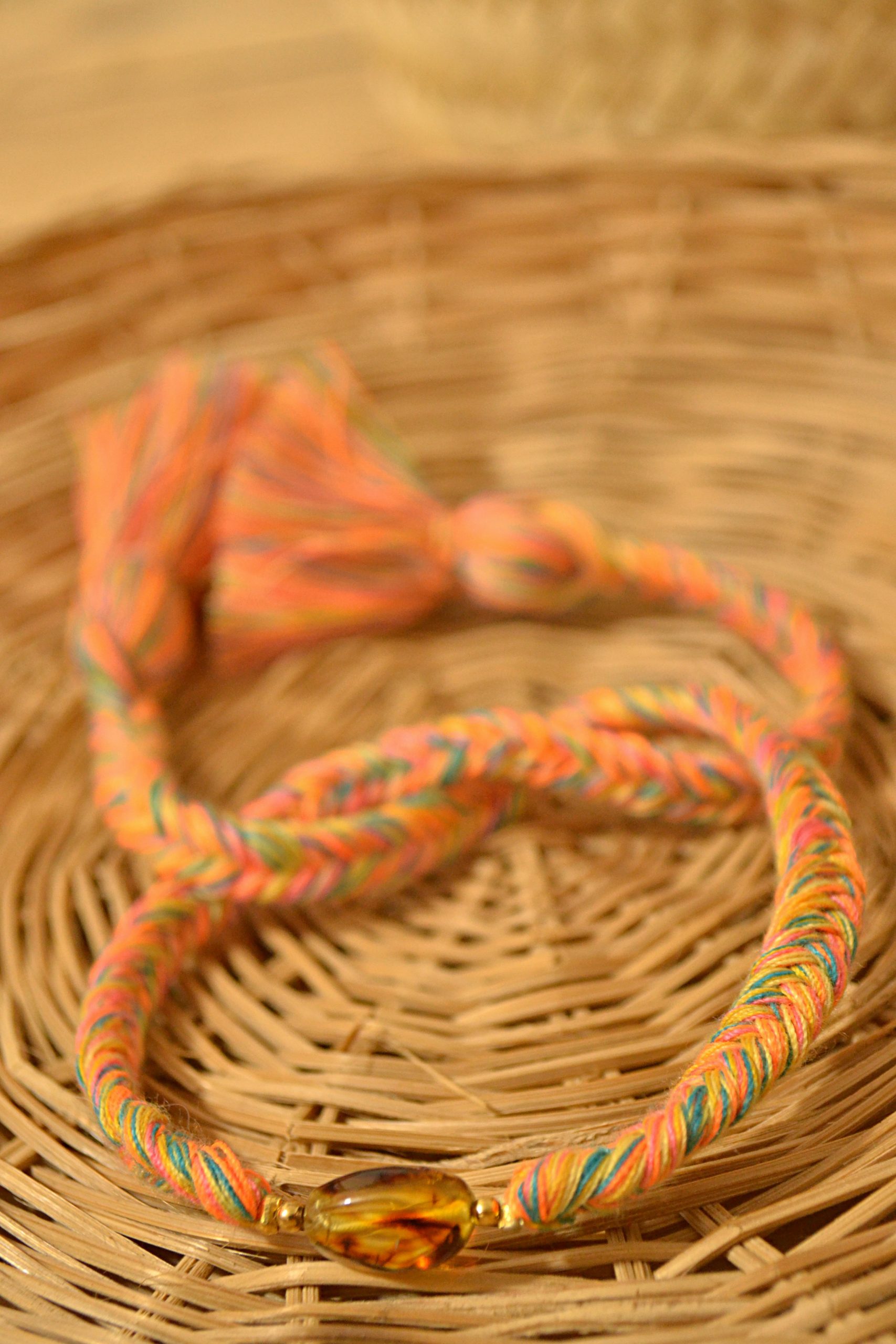 Pulsera ajustable de trenzas de espiga elaboradas con hilos de algodón, el dije central es una pieza de ámbar auténtico de Simojovel, Chiapas. Los pompones gorditos al final de la pulsera le dan el toque único y divertido.