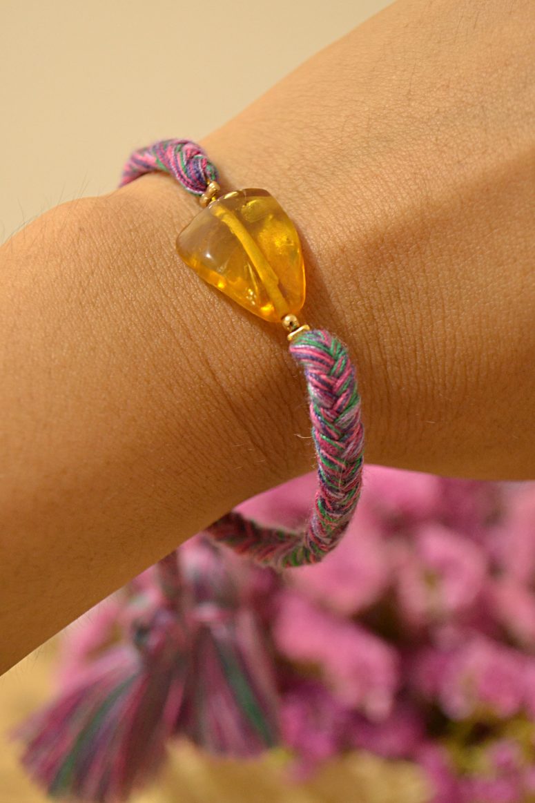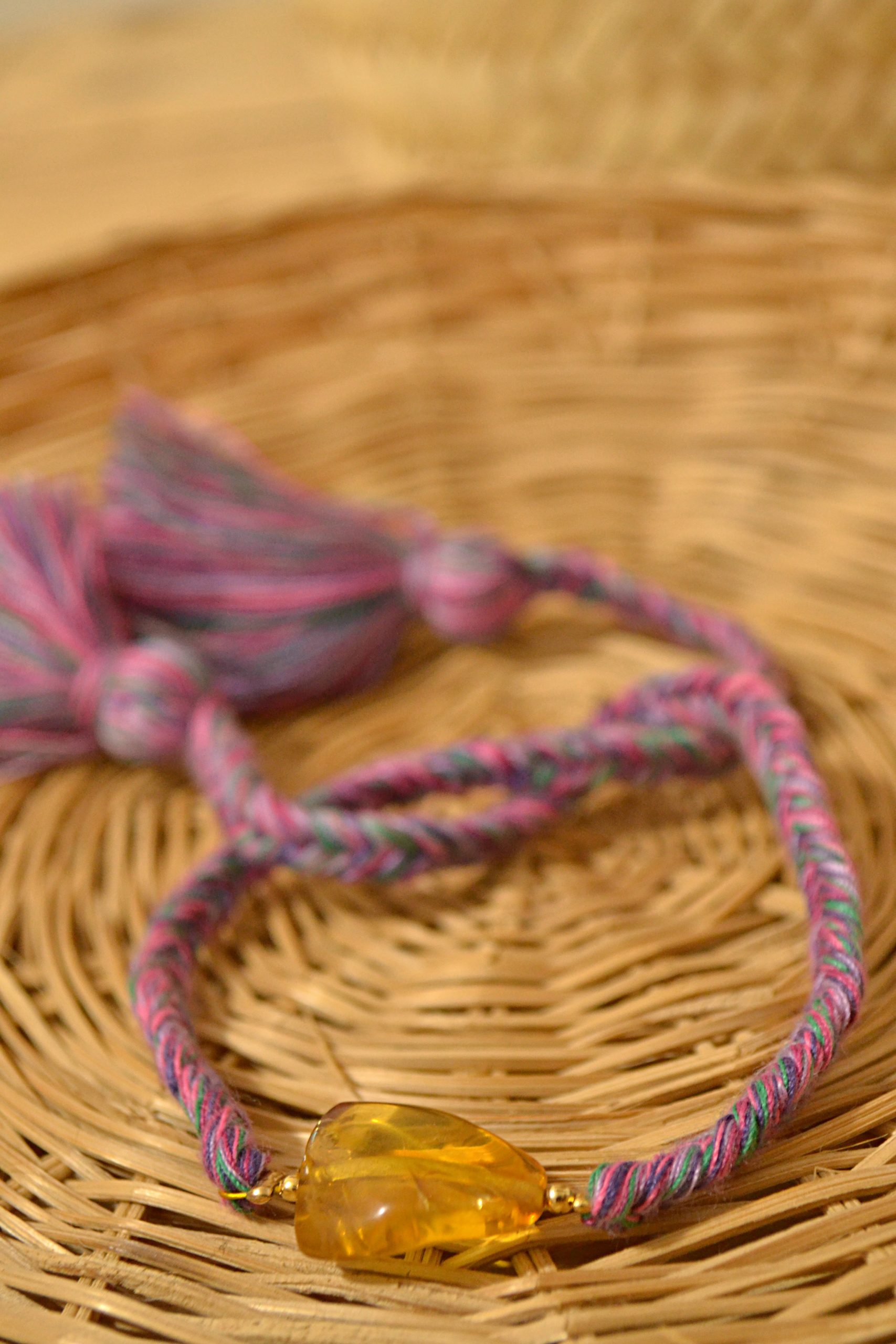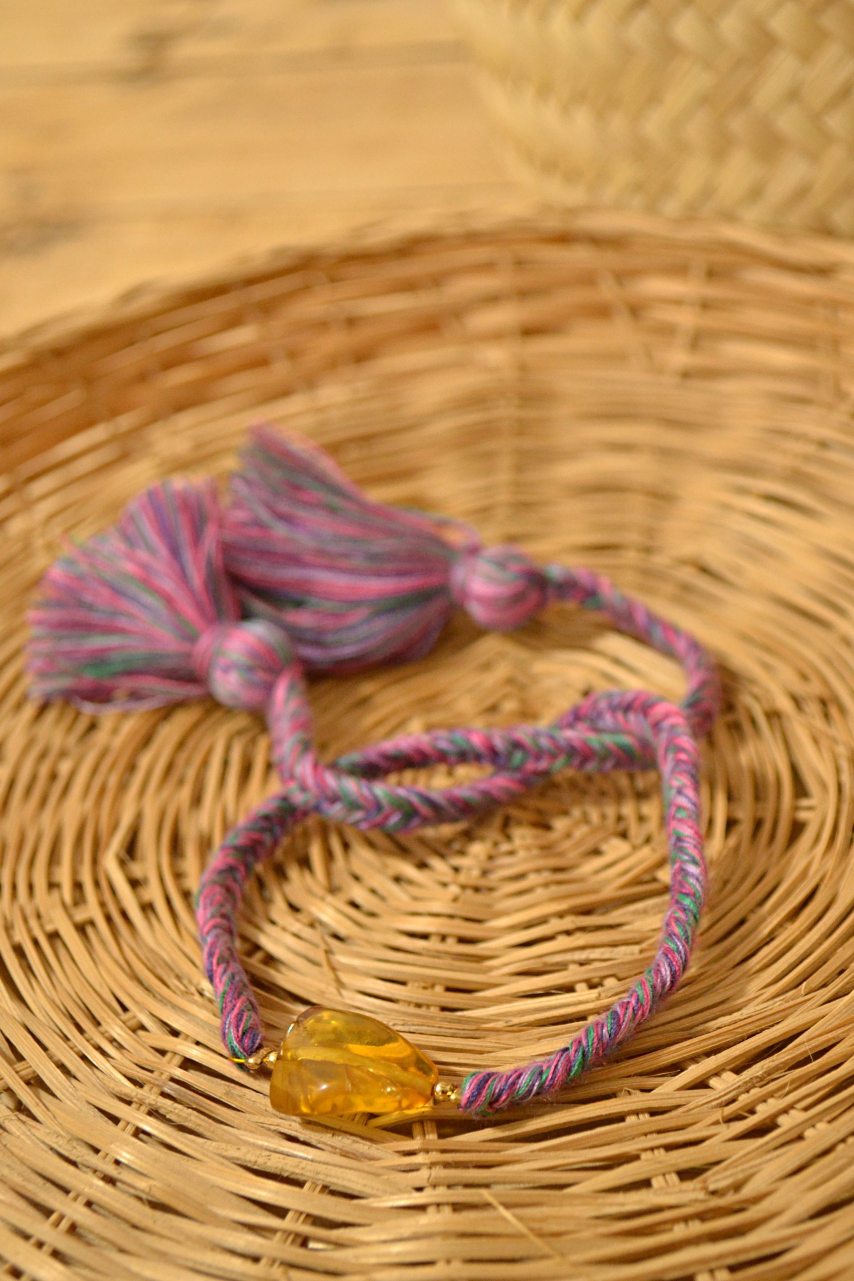 Pulsera ajustable de trenzas de espiga elaboradas con hilos de algodón, el dije central es una pieza de ámbar auténtico de Simojovel, Chiapas. Los pompones gorditos al final de la pulsera le dan el toque único y divertido.