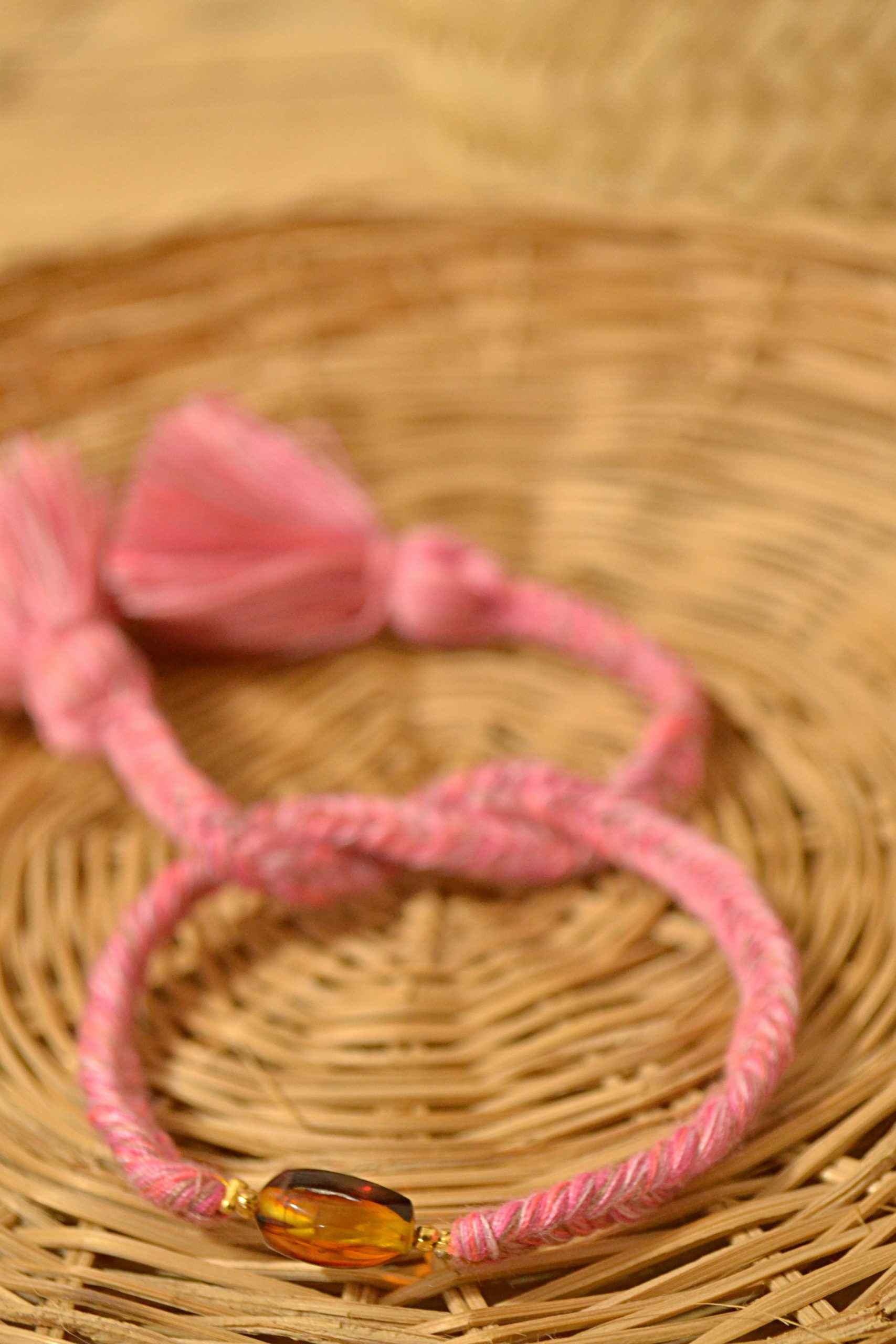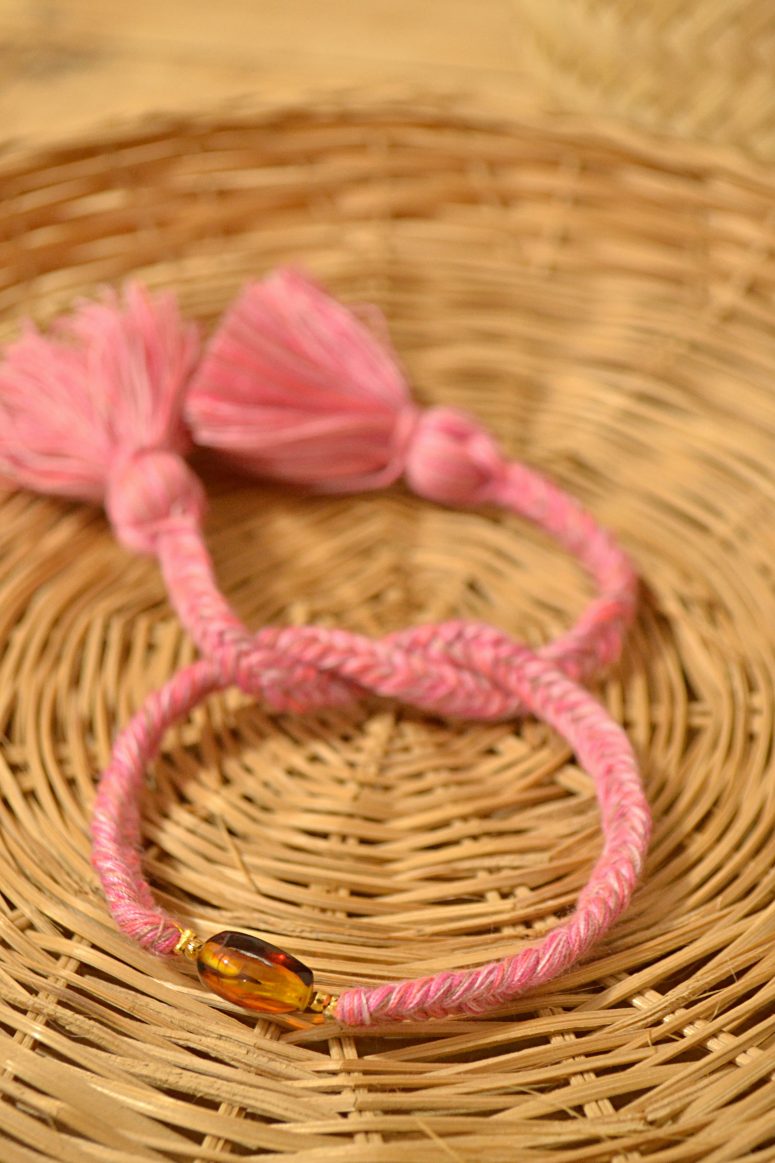 Pulsera ajustable de trenzas de espiga elaboradas con hilos de algodón, el dije central es una pieza de ámbar auténtico de Simojovel, Chiapas. Los pompones gorditos al final de la pulsera le dan el toque único y divertido.