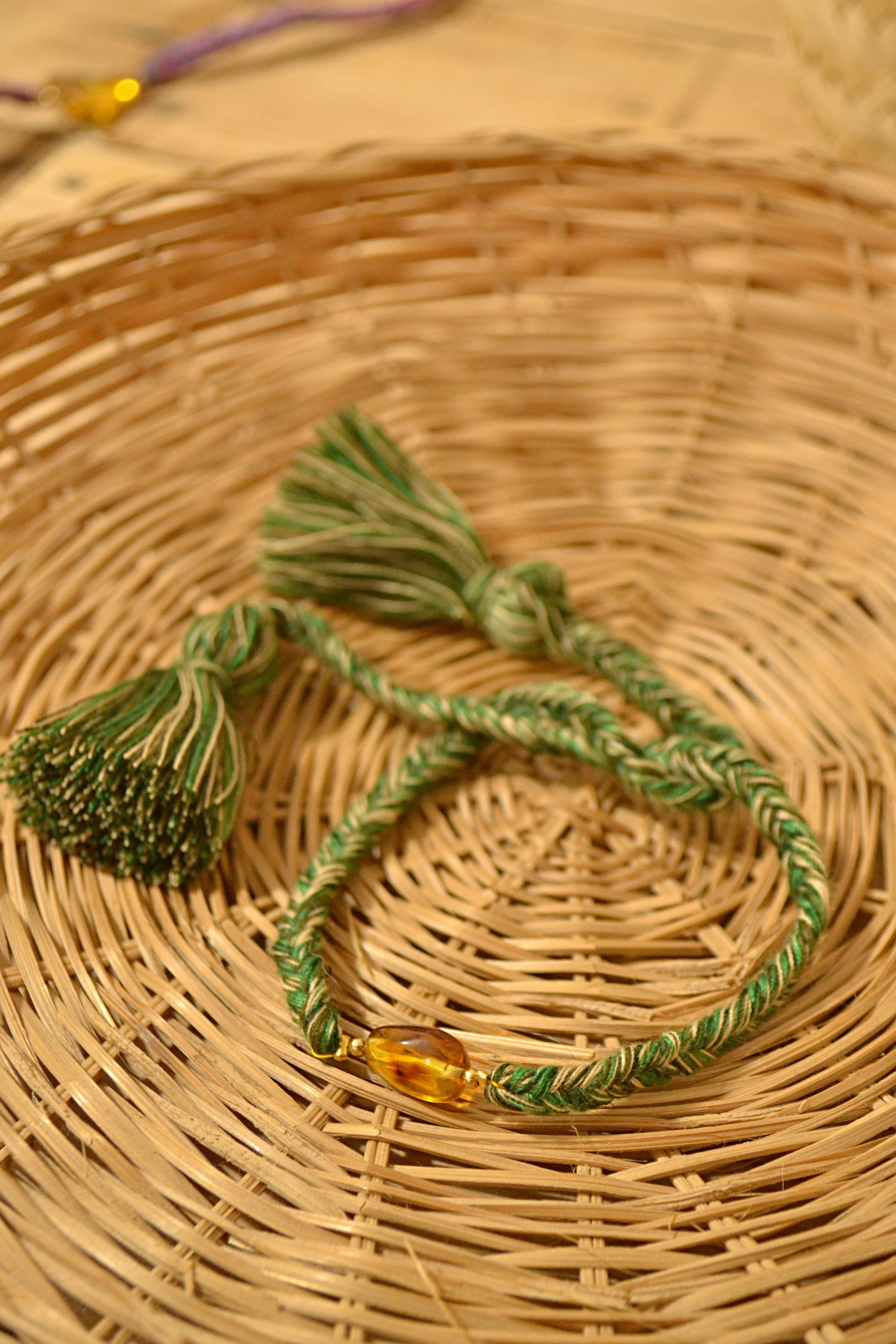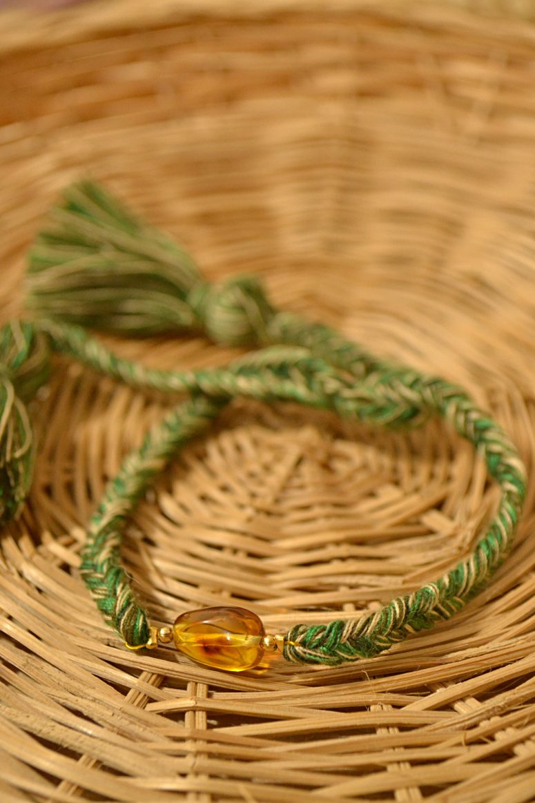 Pulsera ajustable de trenzas de espiga elaboradas con hilos de algodón, el dije central es una pieza de ámbar auténtico de Simojovel, Chiapas. Los pompones gorditos al final de la pulsera le dan el toque único y divertido.