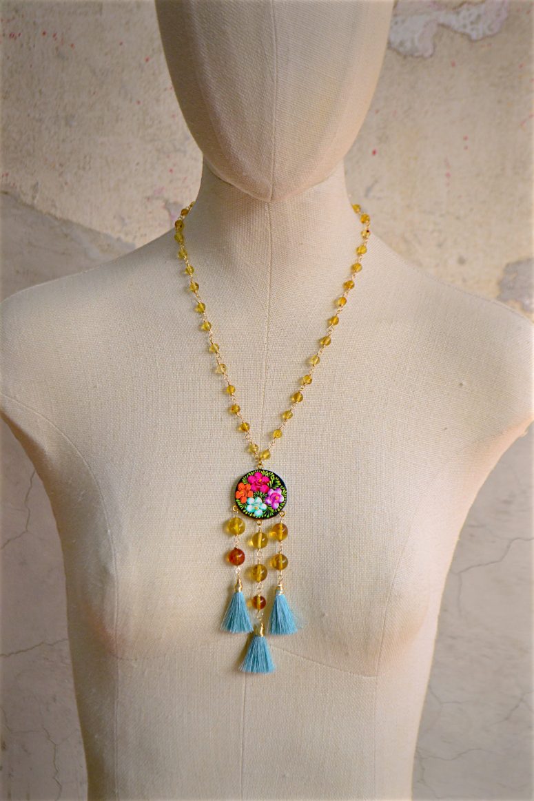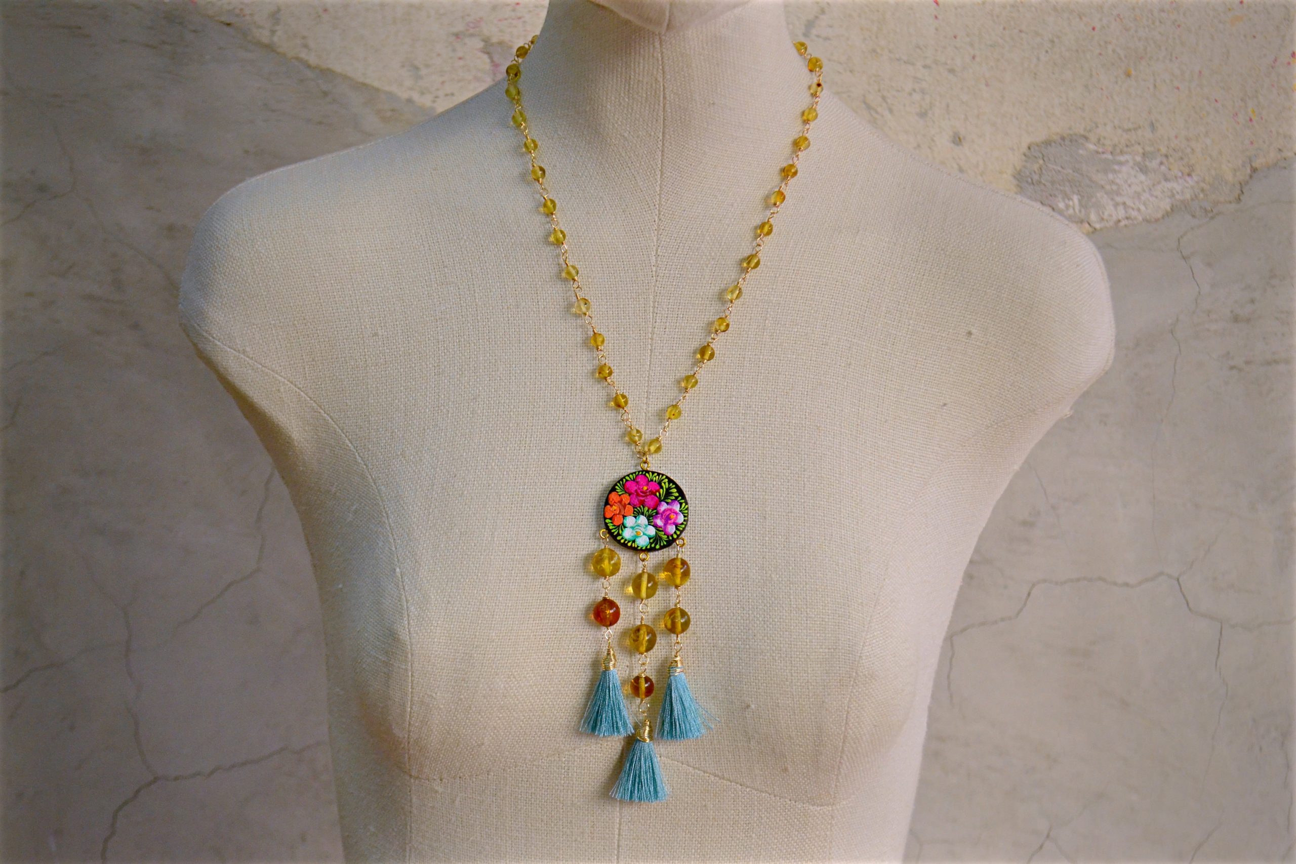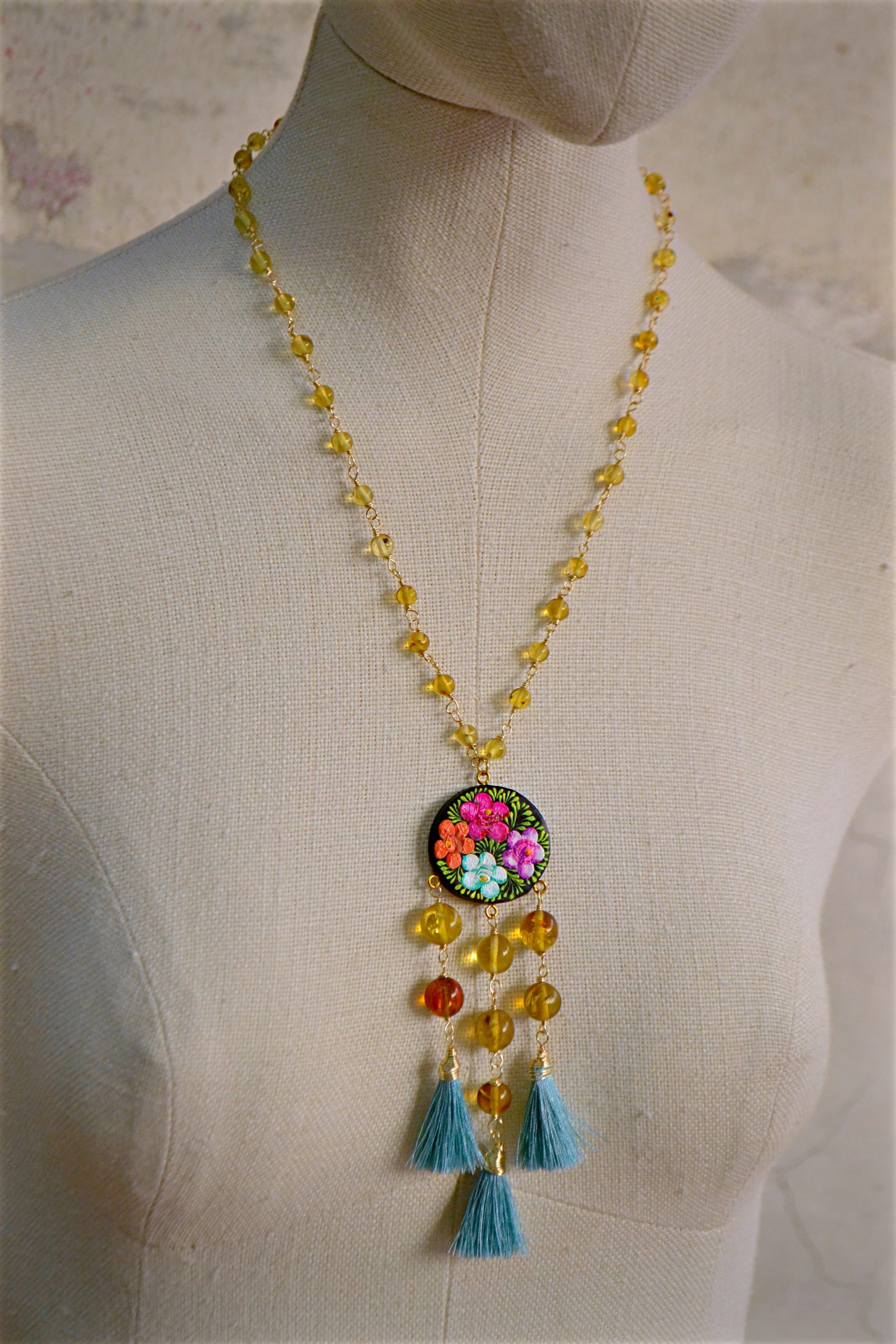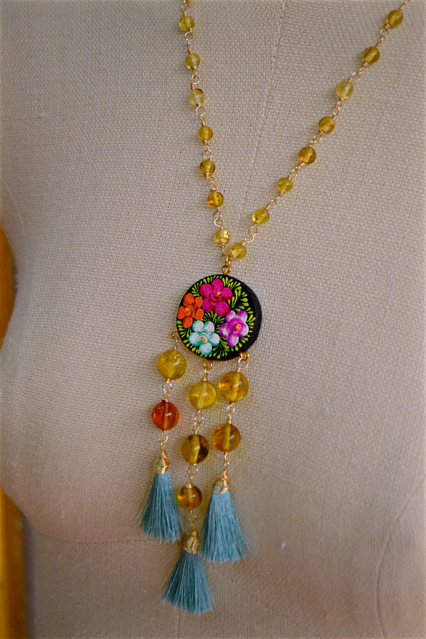 Collar semi corto elaborado con ámbar auténtico de Simojovel, Chiapas engarzado con alambre de chapa de oro. Dije central de madera pintado con la técnica tradicional de Chiapa de Corzo.