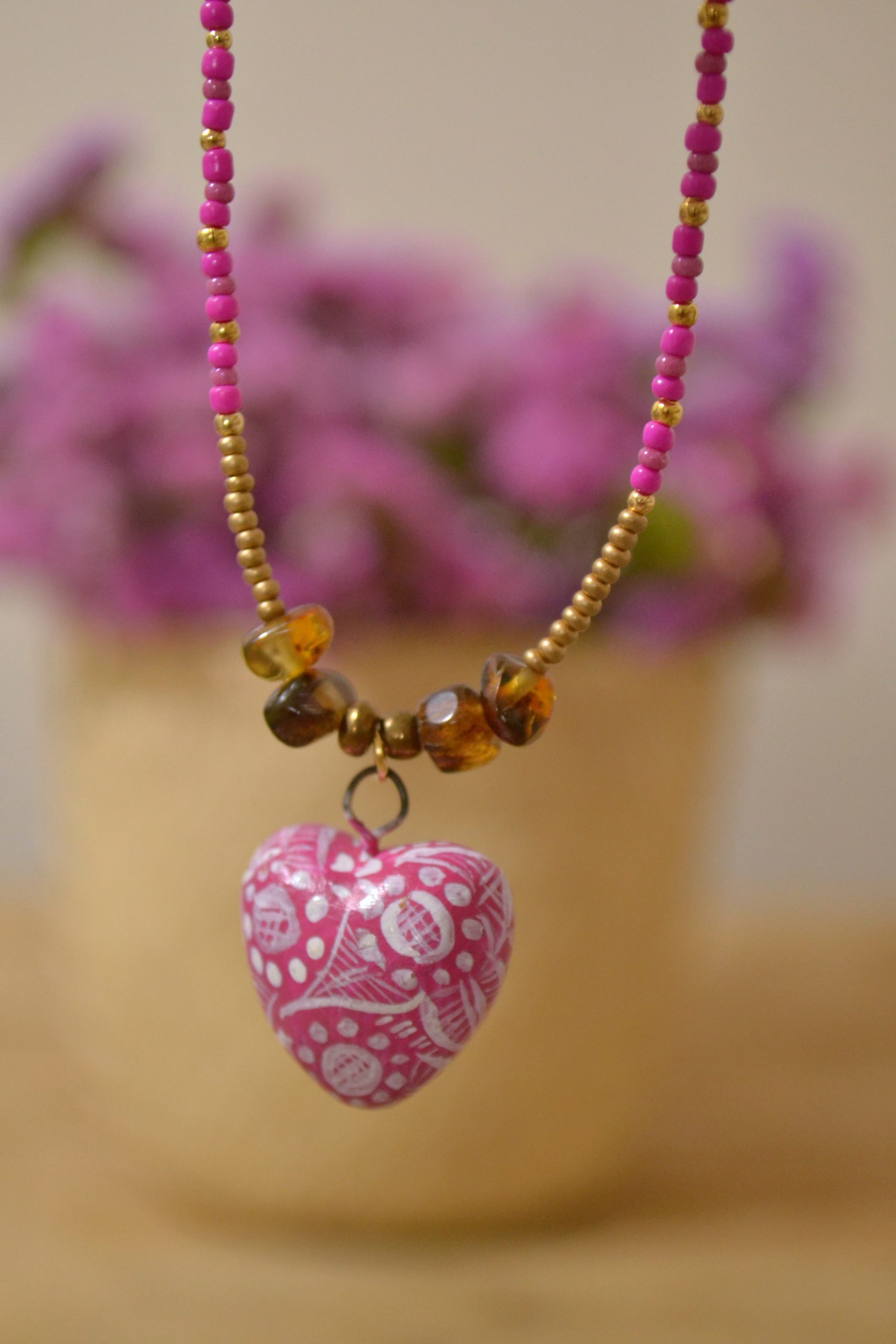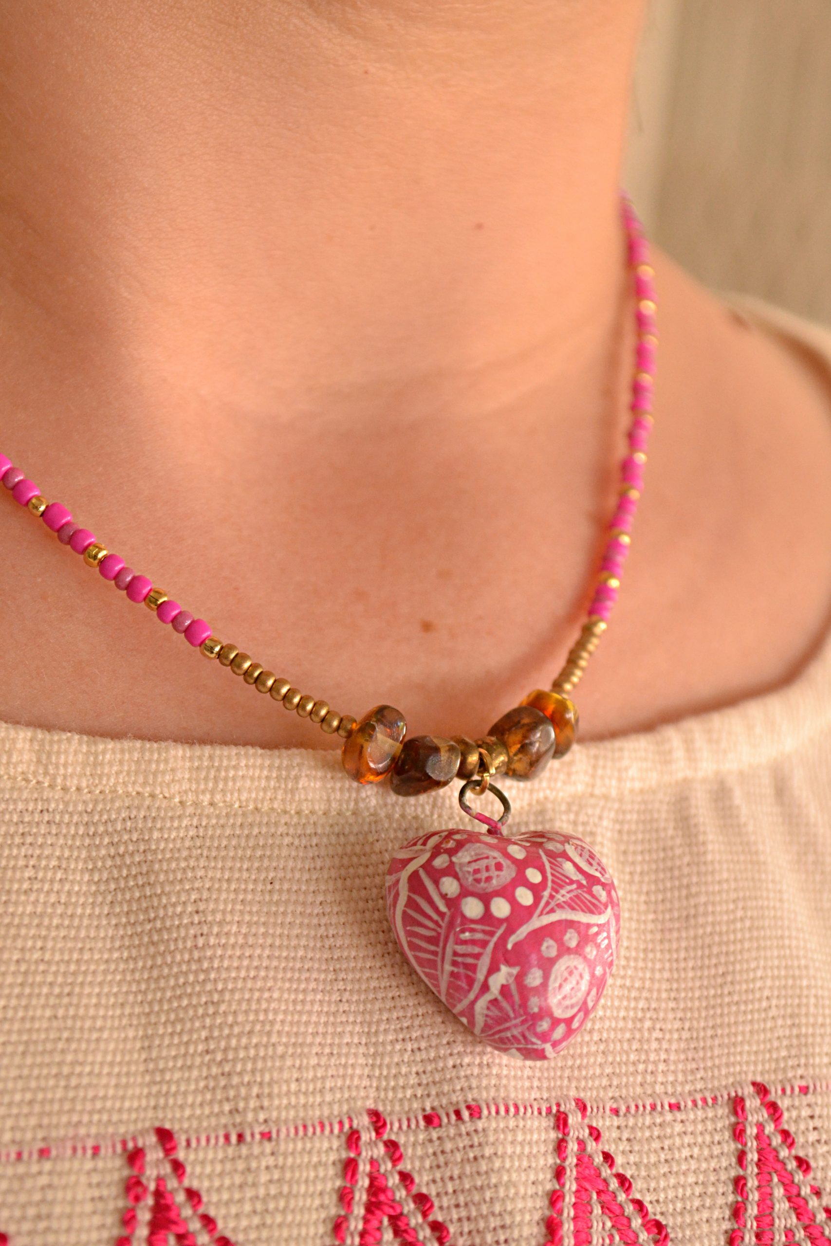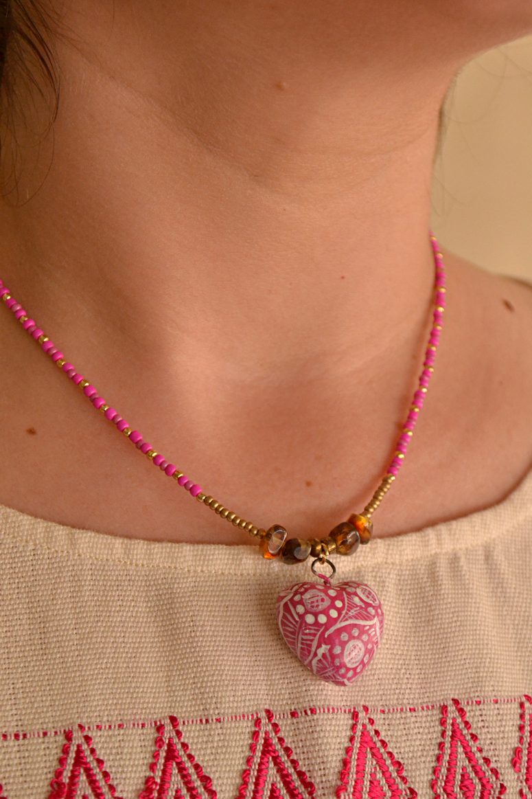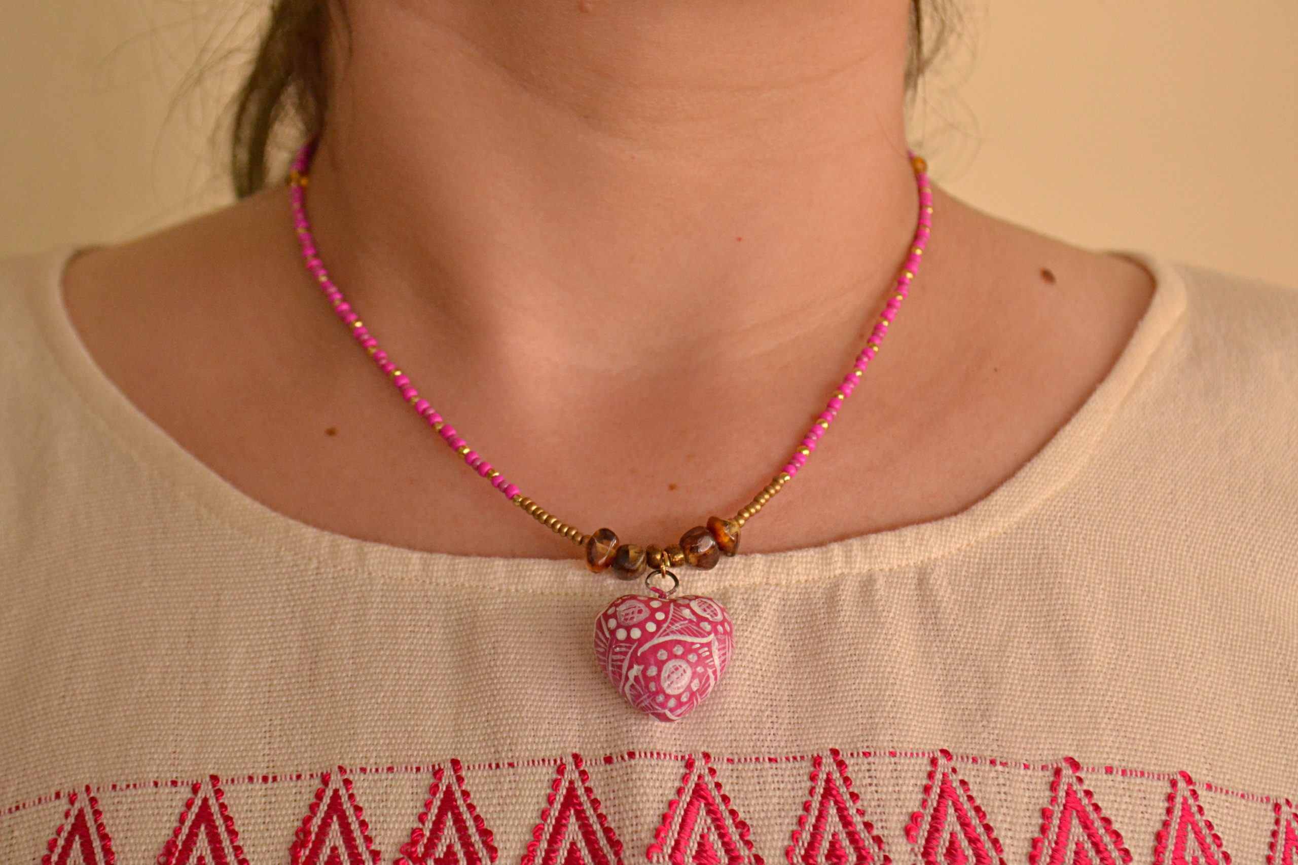 Collar  corto de chaquira en tamaño mini con piezas de ámbar auténtico de Simojovel, Chiapas. Como pieza principal cuenta con un dije de barro elaborado por la maestra artesana Paulina Bautista, originaria de Amatenango Del Valle, Chiapas.