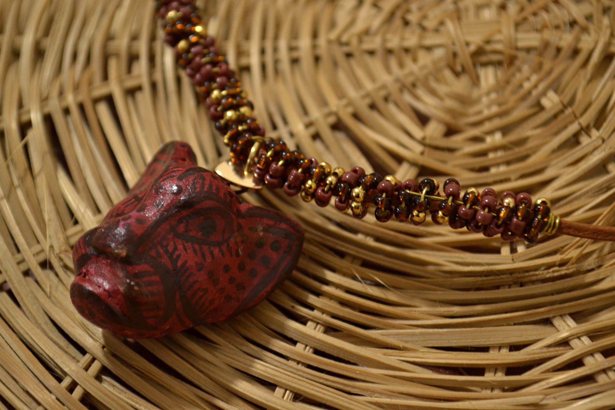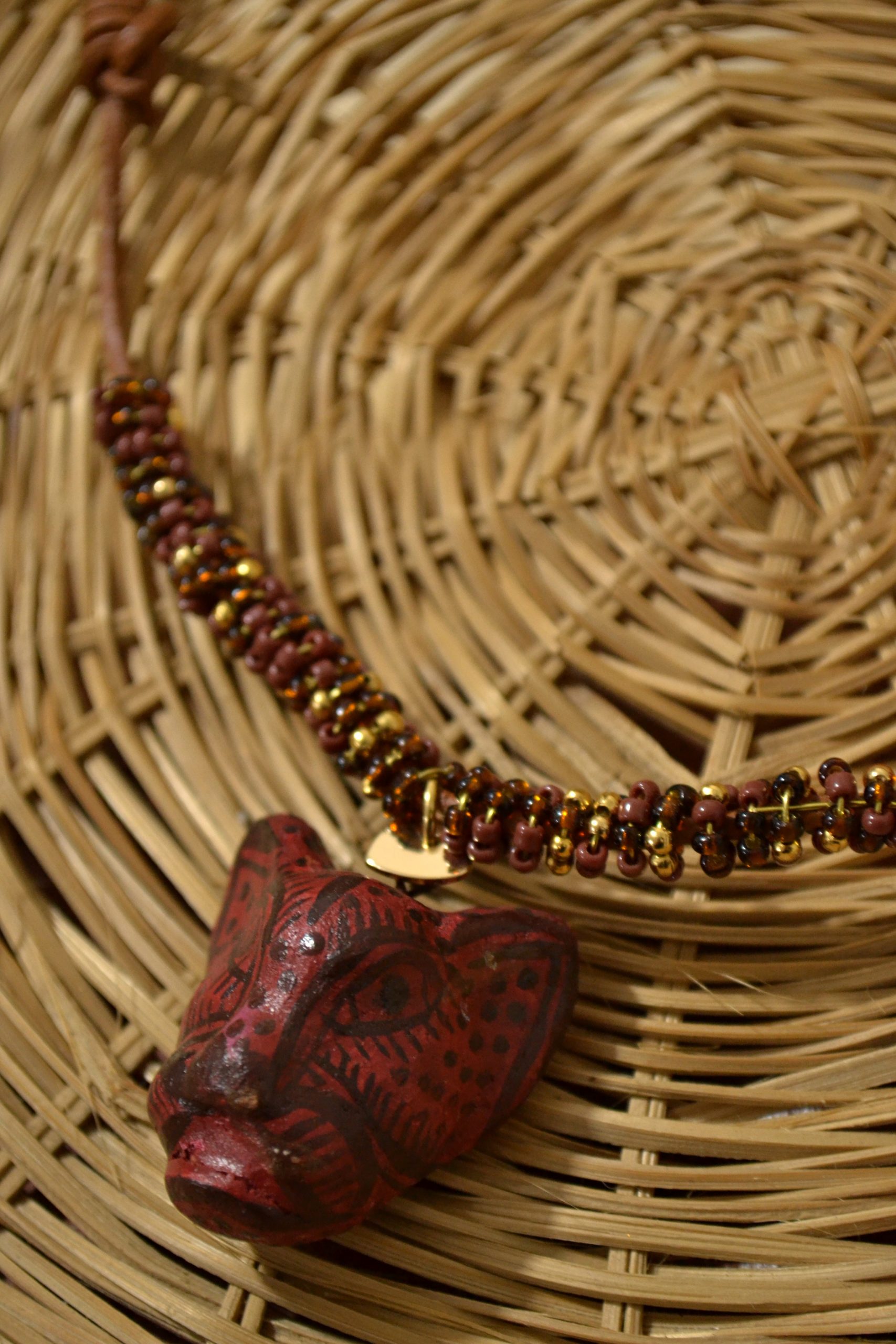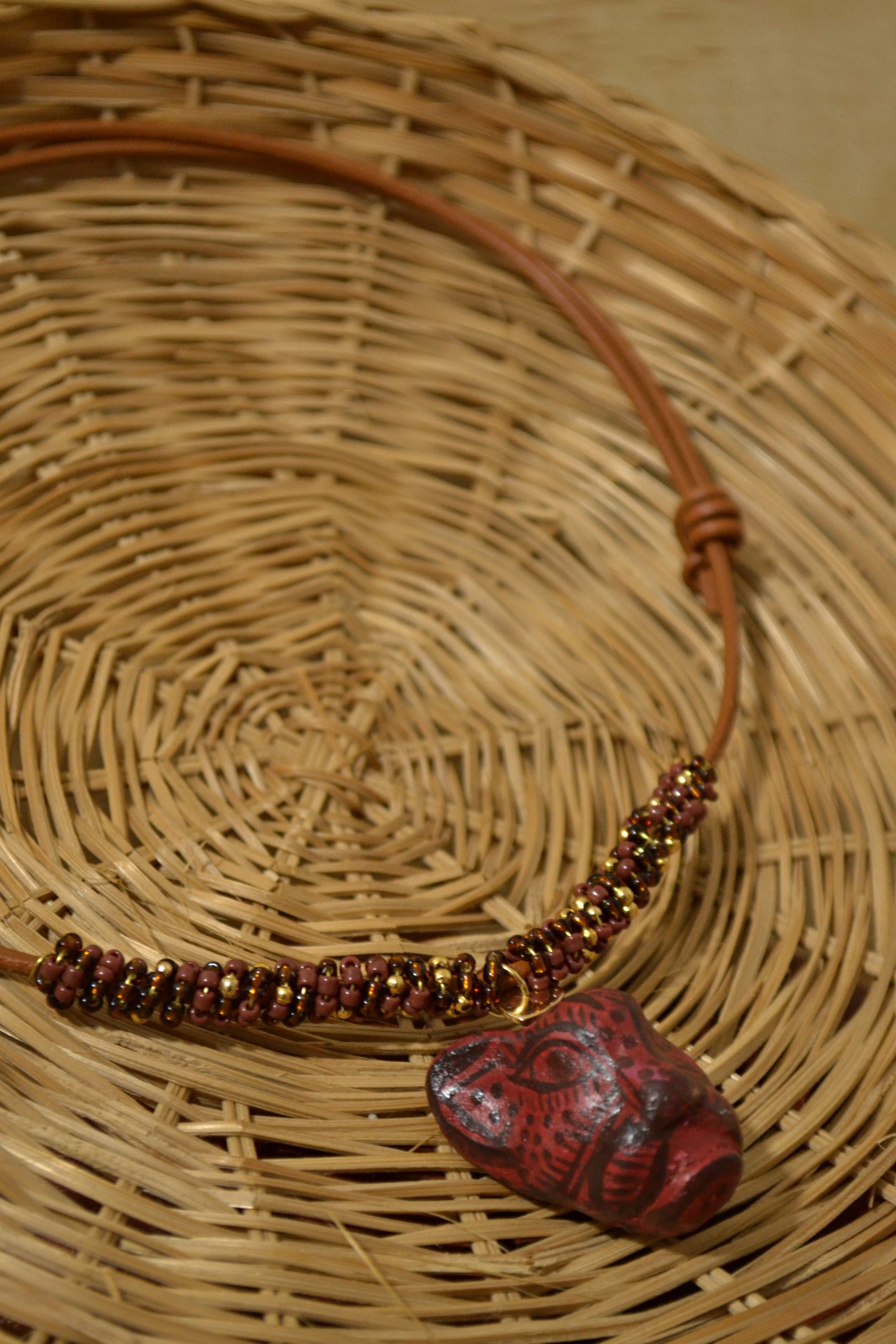 Collar de piel, ajustable con chaquiras engarzadas en alambre de latón y dije de de barro elaborado por artesanas de Amatenango, Chiapas.