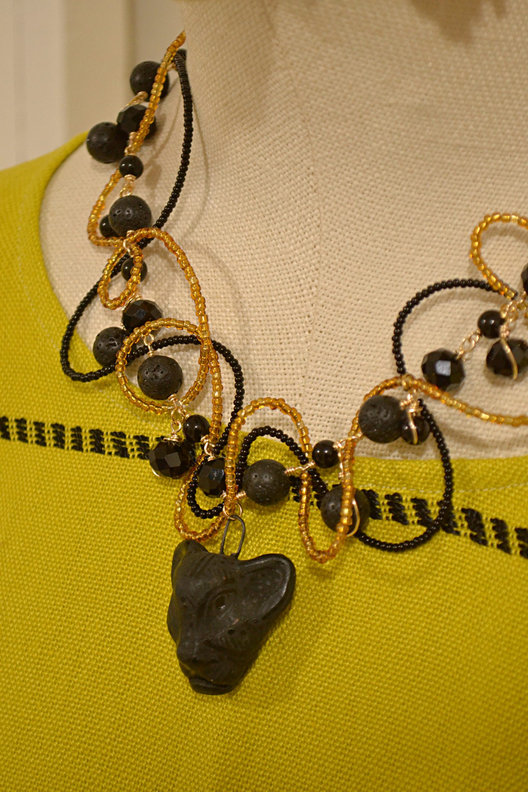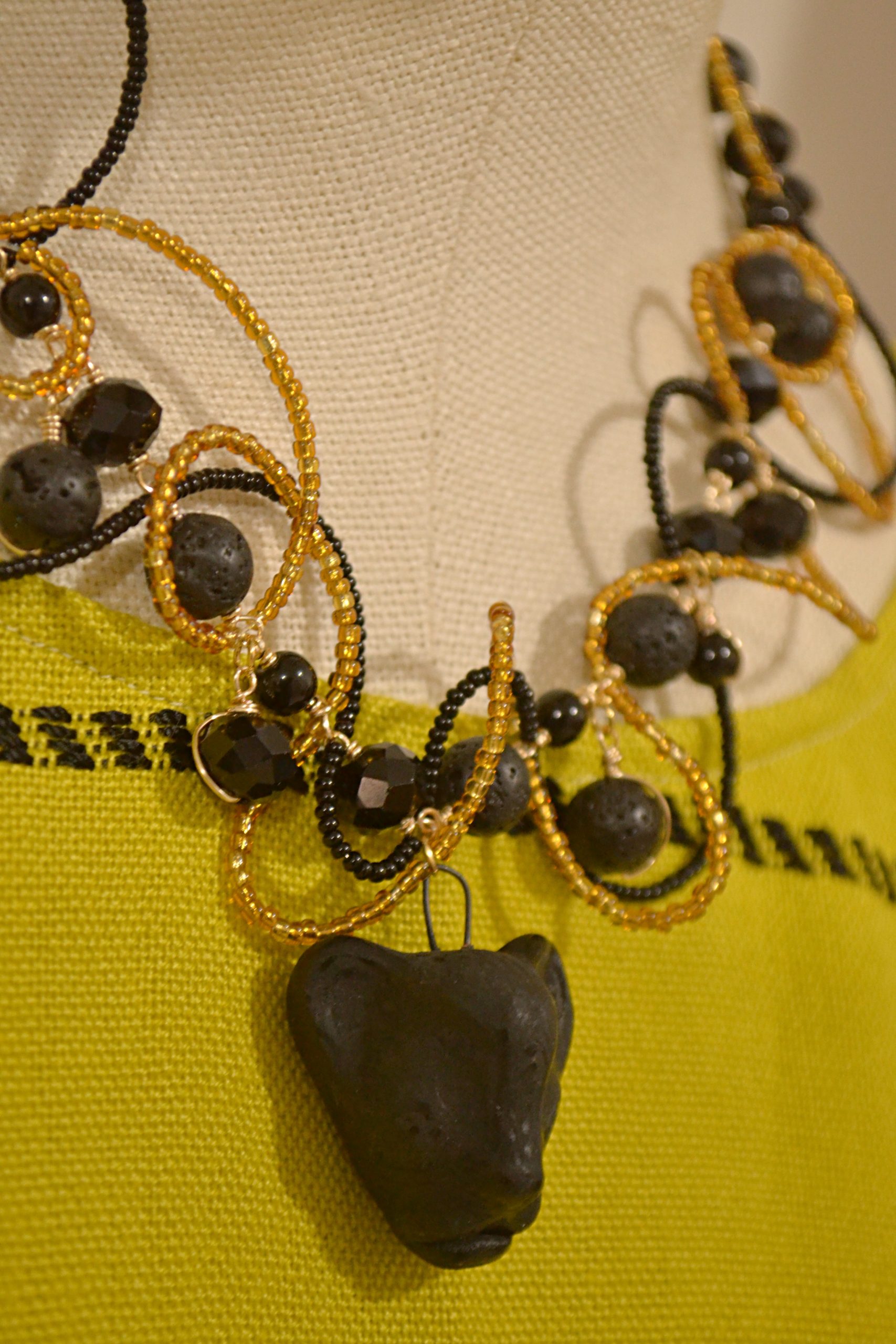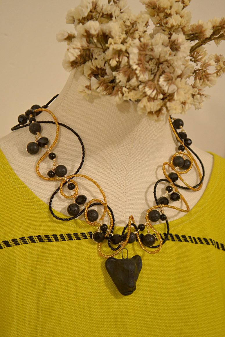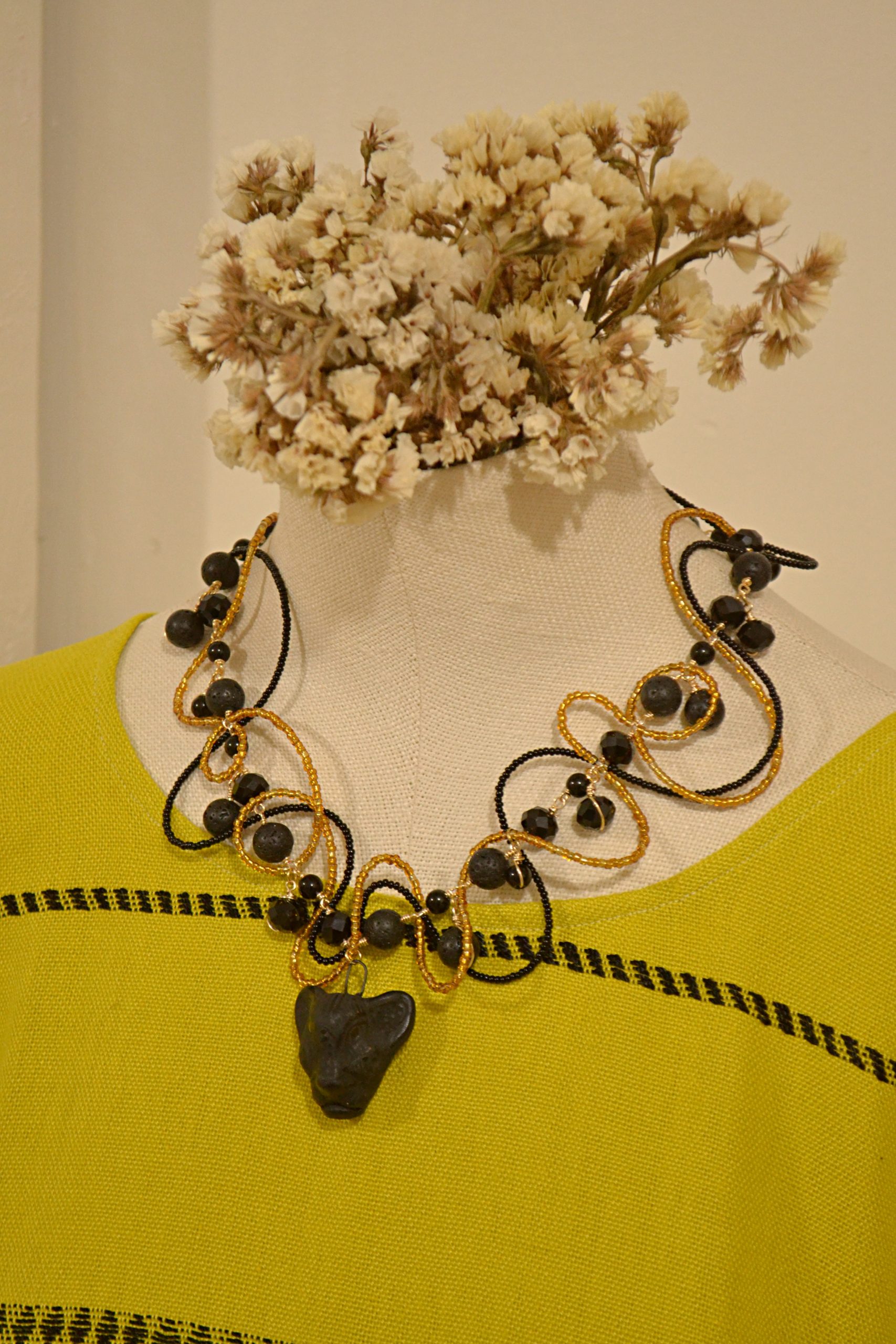 Collar semi corto de cristales engarzados en chapa de oro, con tiras de chaquira y dije principal de jaguar hecho con barro, moldeado y decorado por Paulina Bautista, maestra alfarera de Amatenango Del Valle, Chiapas.