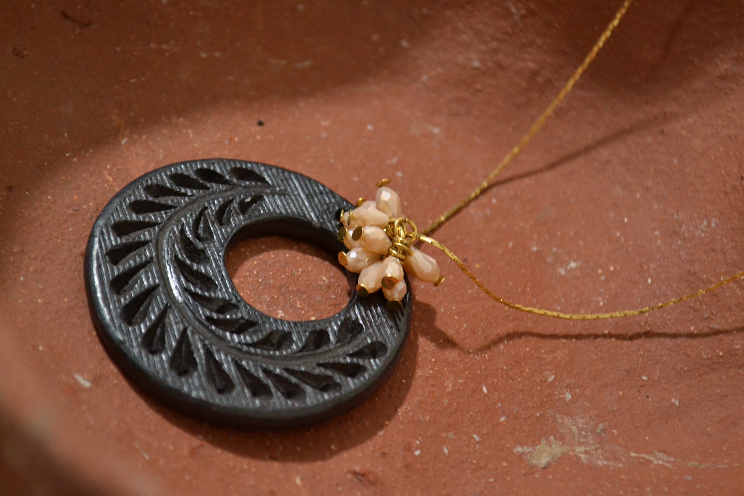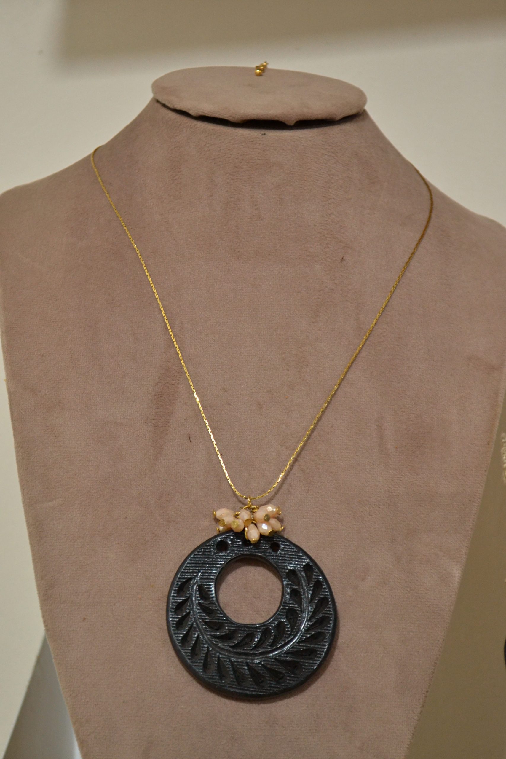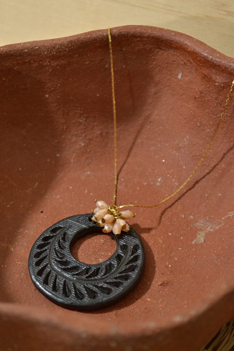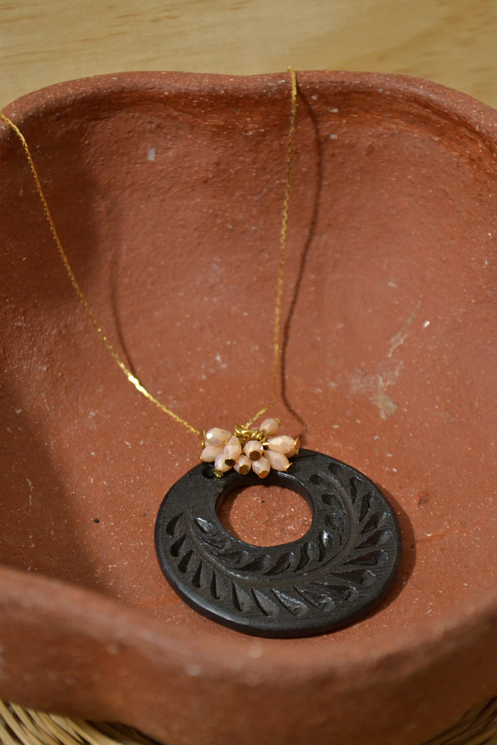 Collar  semi corto con cadena y componentes de chapa de oro y mini gotas de cristal engarzadas. Dije de barro negro, elaborado por artesanos de San Bartolo Coyotepec, Oaxaca.