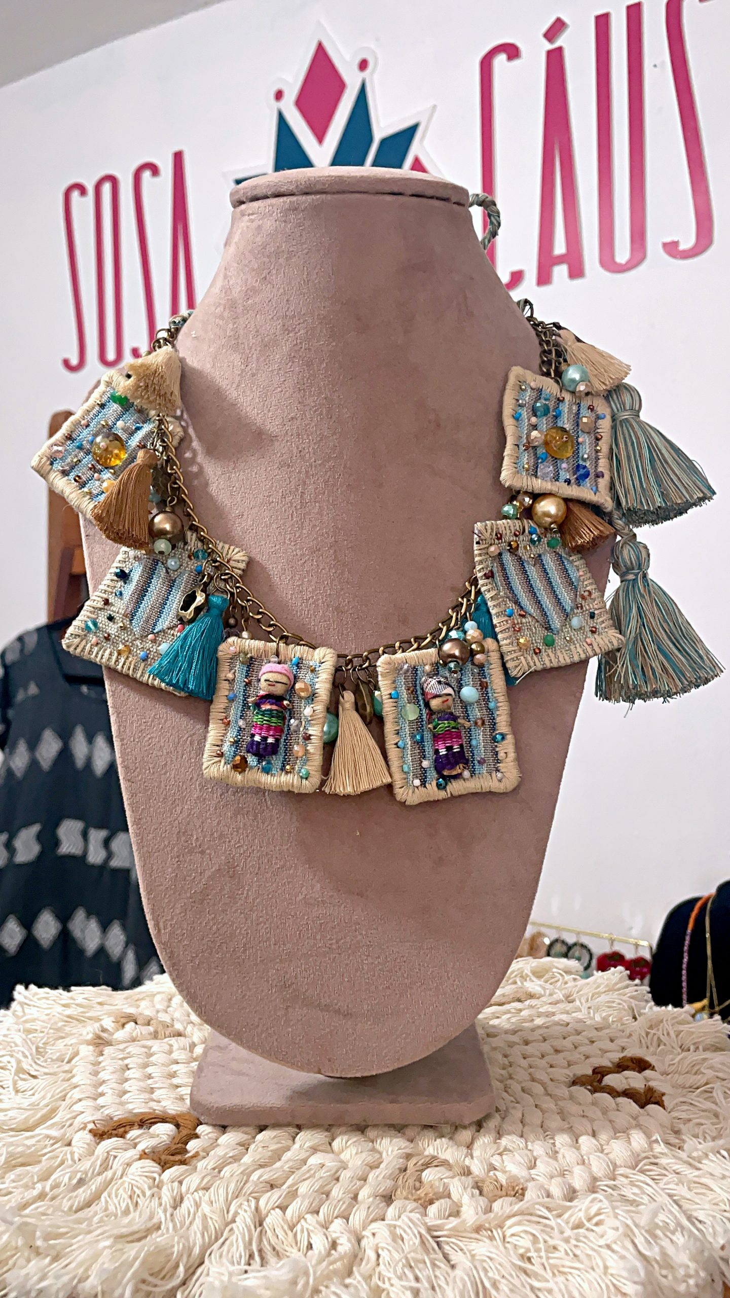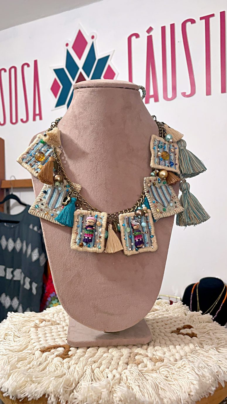 Collar hecho con plaquitas de telar de cintura con muñequitas quitapenas y cristales incrustados; el collar cuenta con diferentes piezas de madera, cristales y piedras naturales, es ajustable con trenzas de algodón.