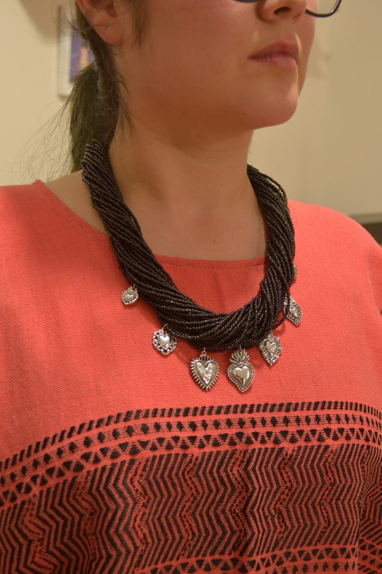 Collar de más de 30 hilos de chaquira en el tamaño más pequeño, insertadas una por una, con dijes de acero inoxidable en diferentes formas de corazones; esta pieza es ajustable gracias a las trenzas de hilos de algodón en la parte trasera.