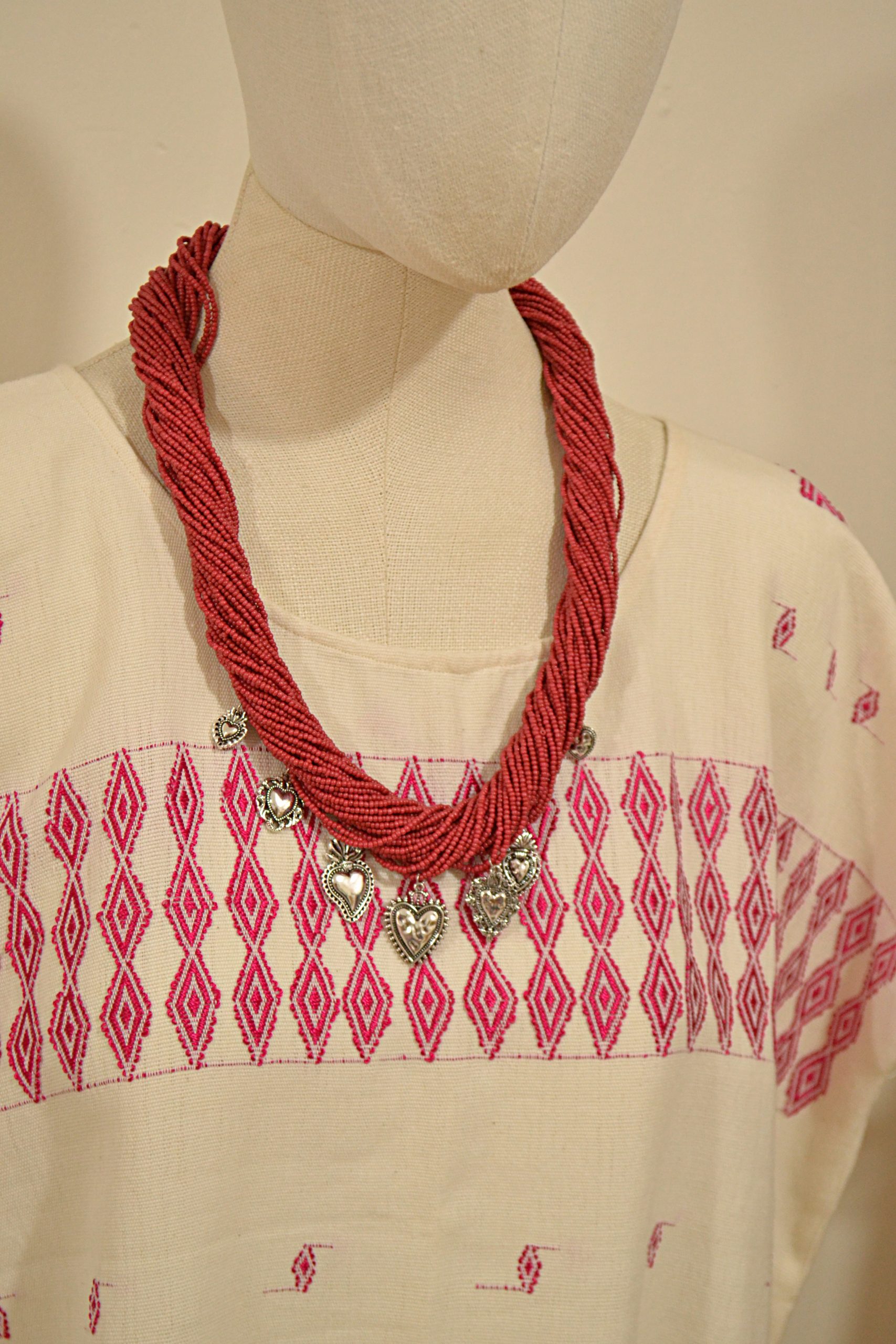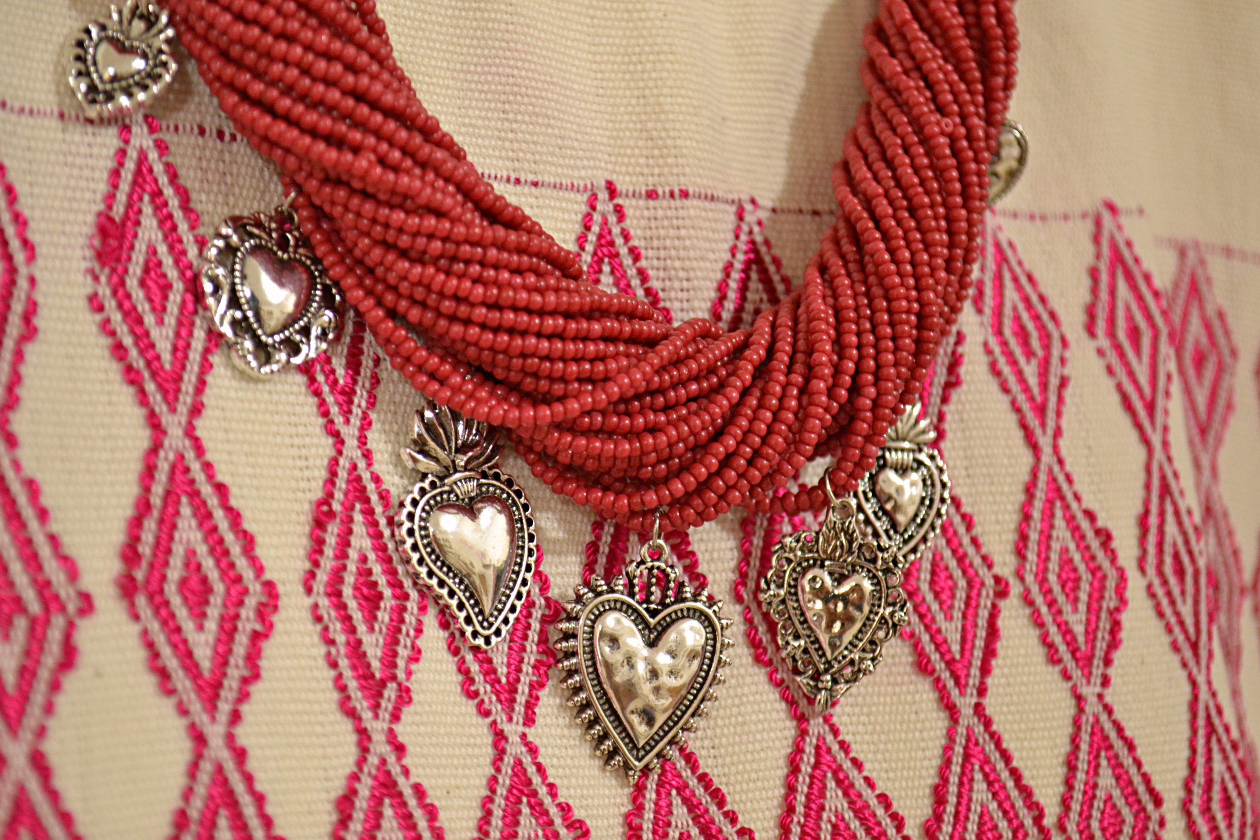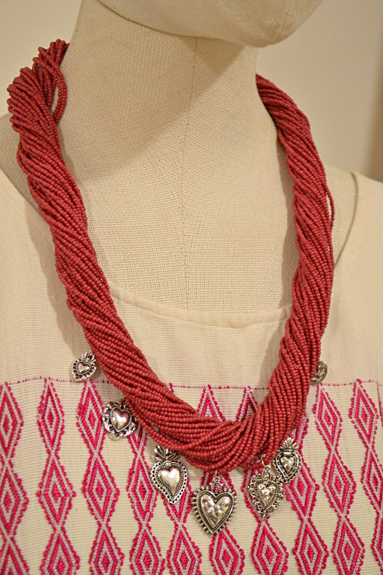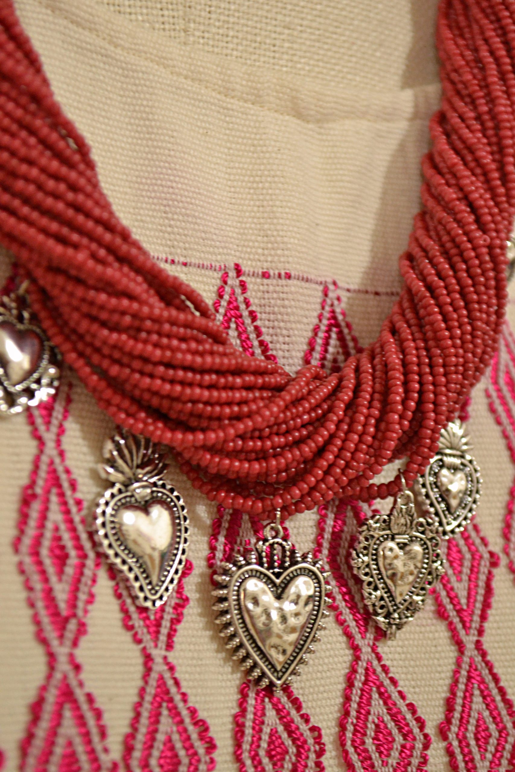 Collar de más de 10 hilos de chaquira en el tamaño más pequeño, insertadas una por una, con dijes de acero inoxidable; esta pieza es ajustable gracias a las trenzas de hilos de algodón en la parte trasera.