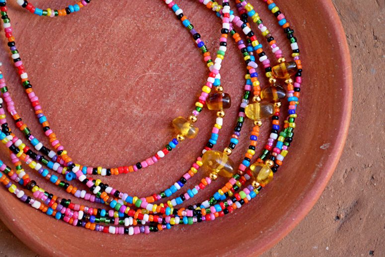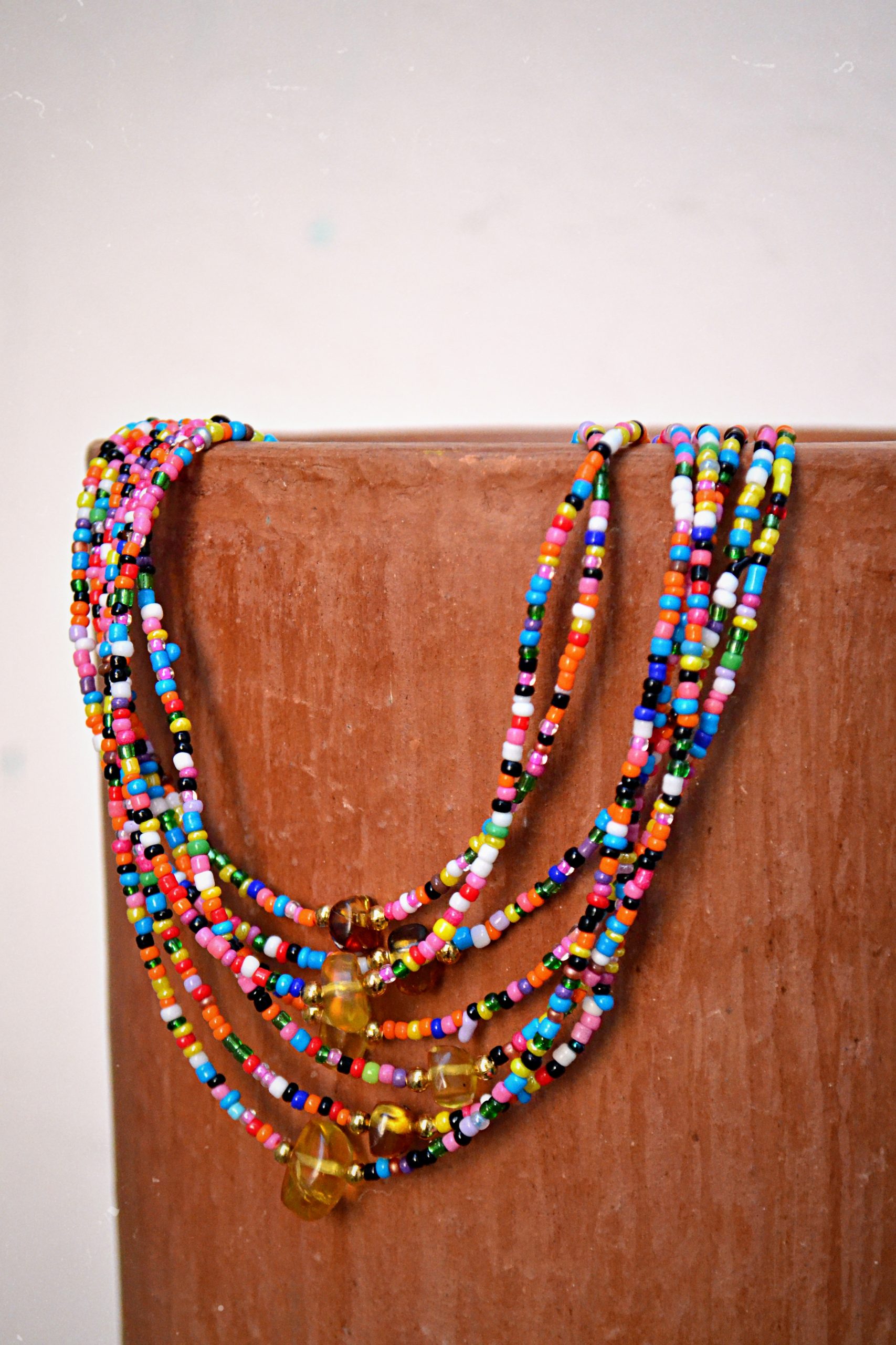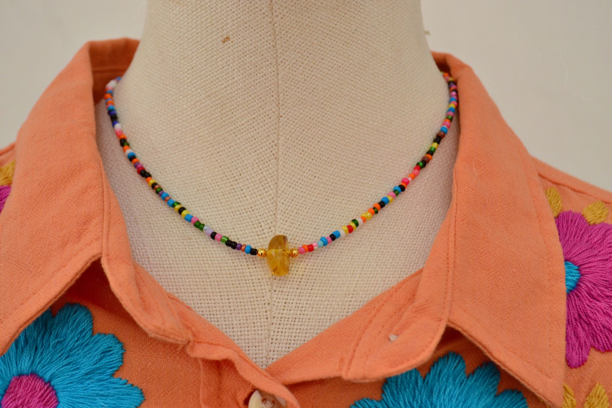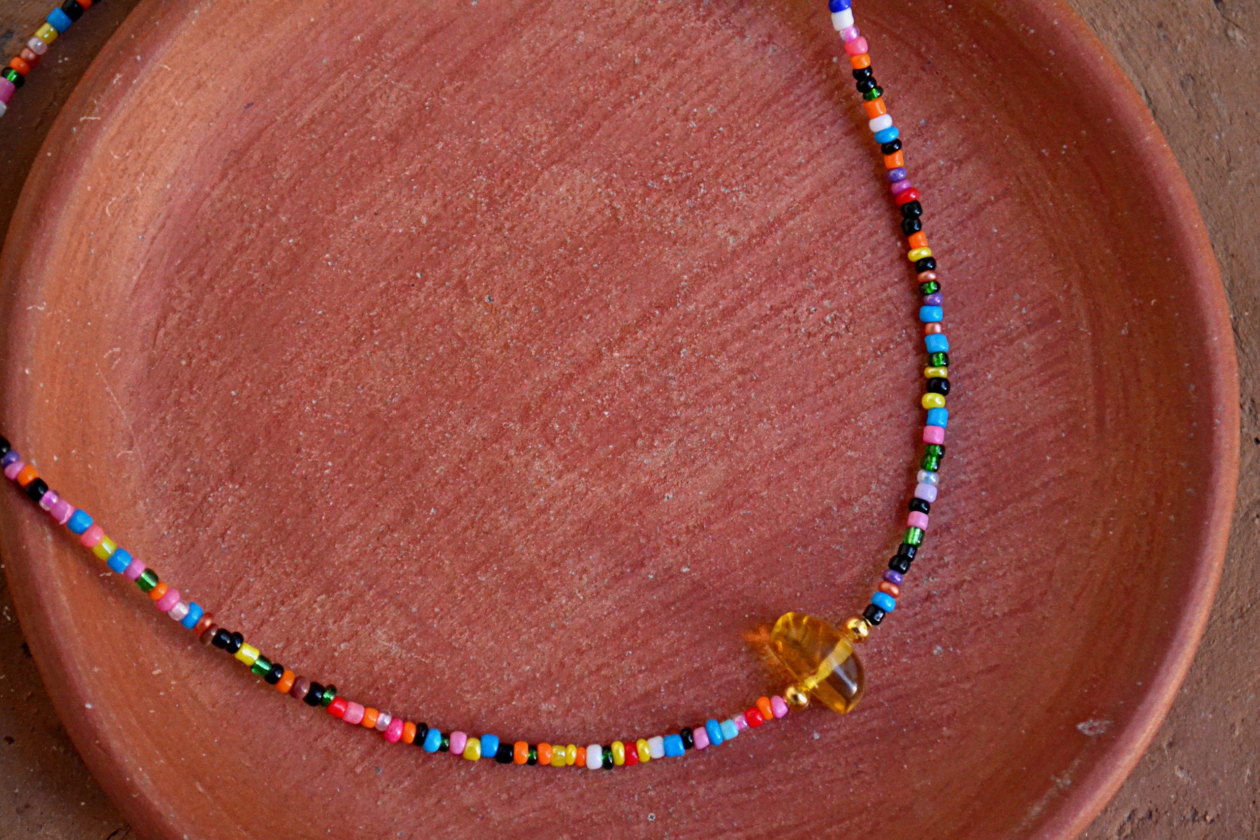 Collar corto de chaquiras minis con piedrita de ámbar. Se venden por separado.