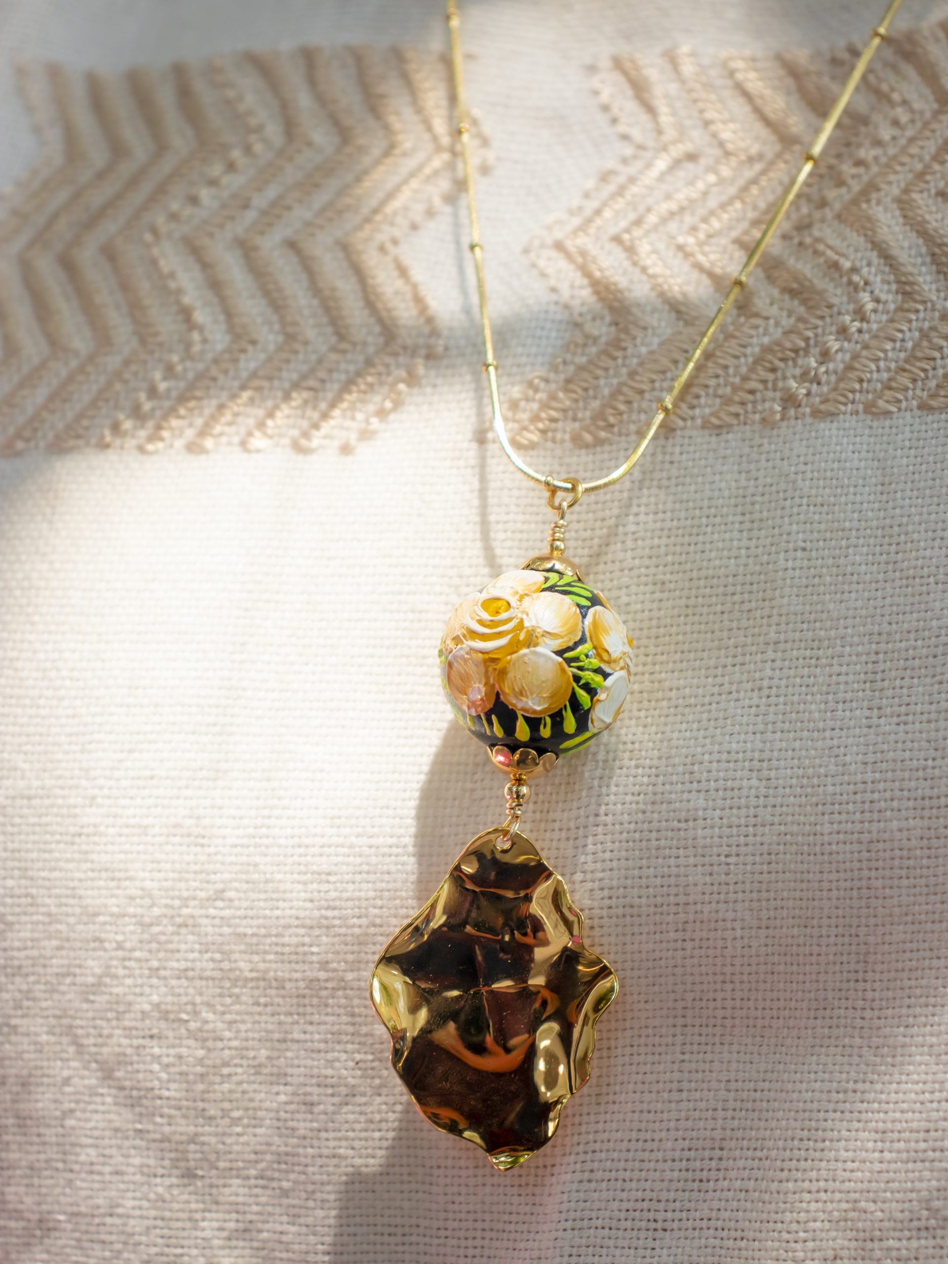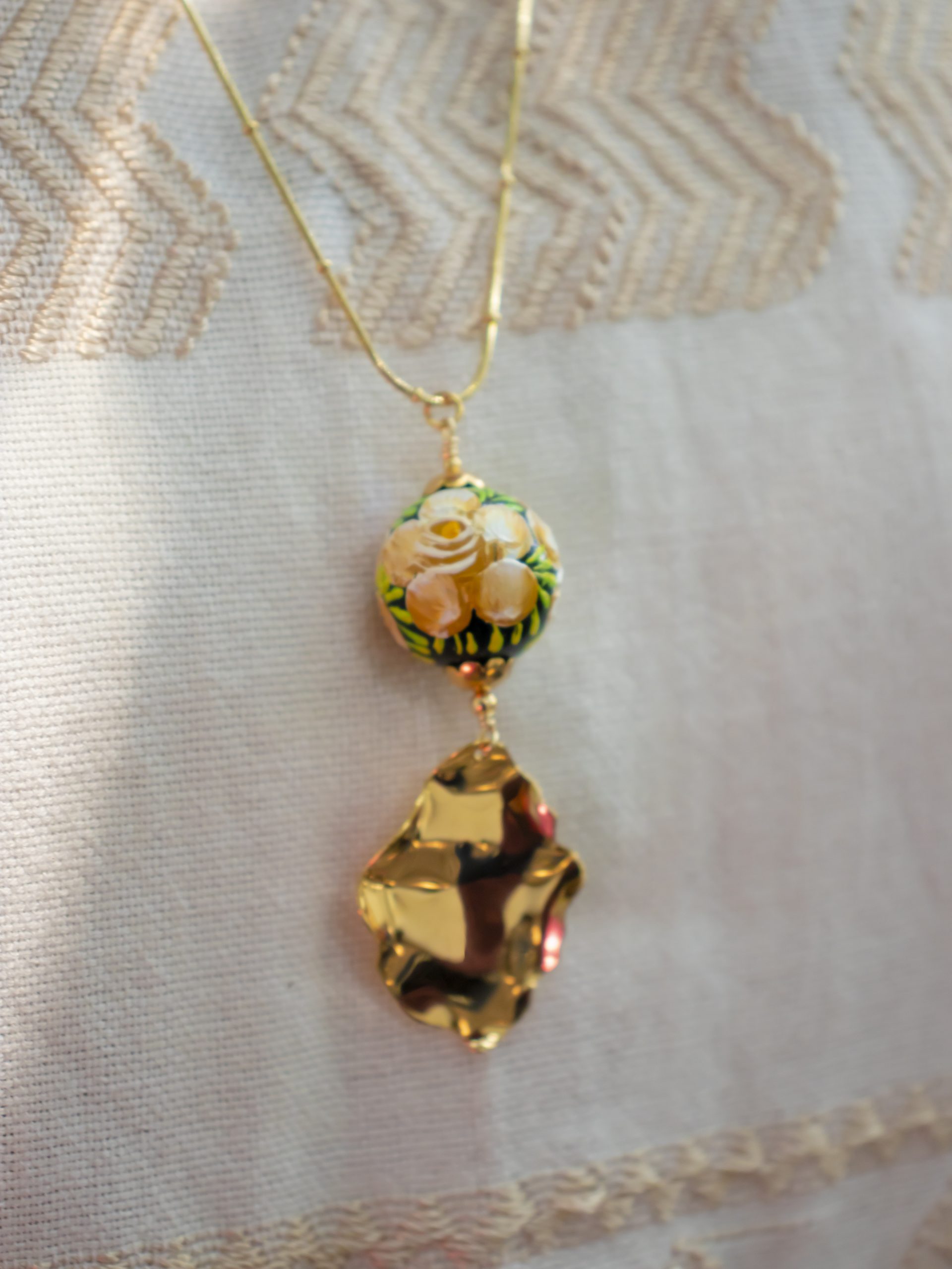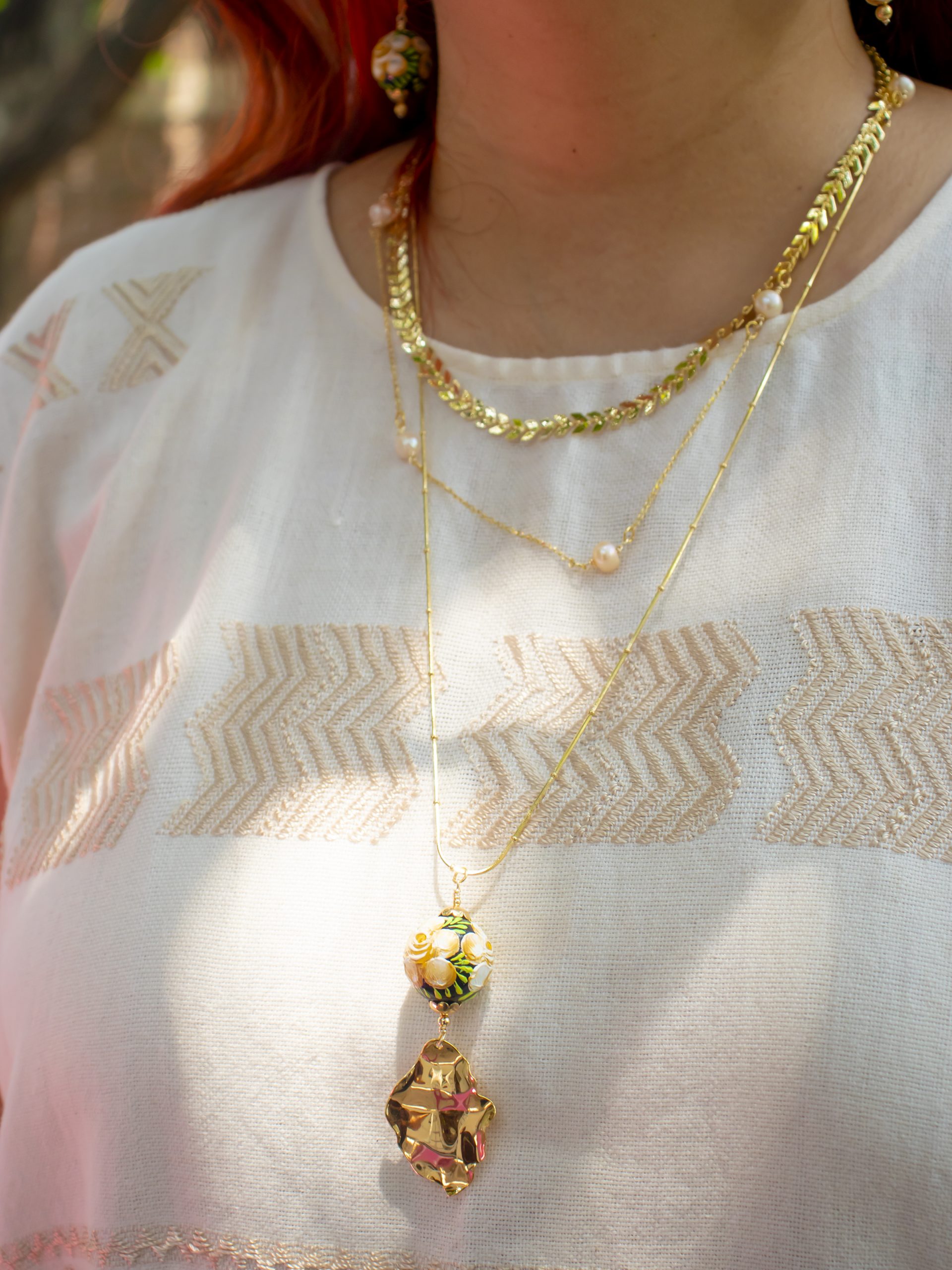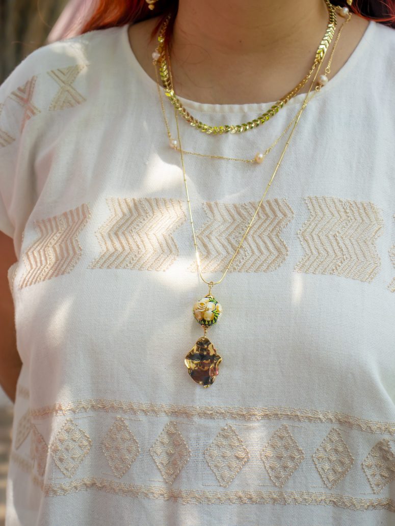 Collar de tres tipos de cadenas de acero inoxidable, perlas de río y pieza esférica decorada con la técnica tradicional de Chiapa de Corzo.