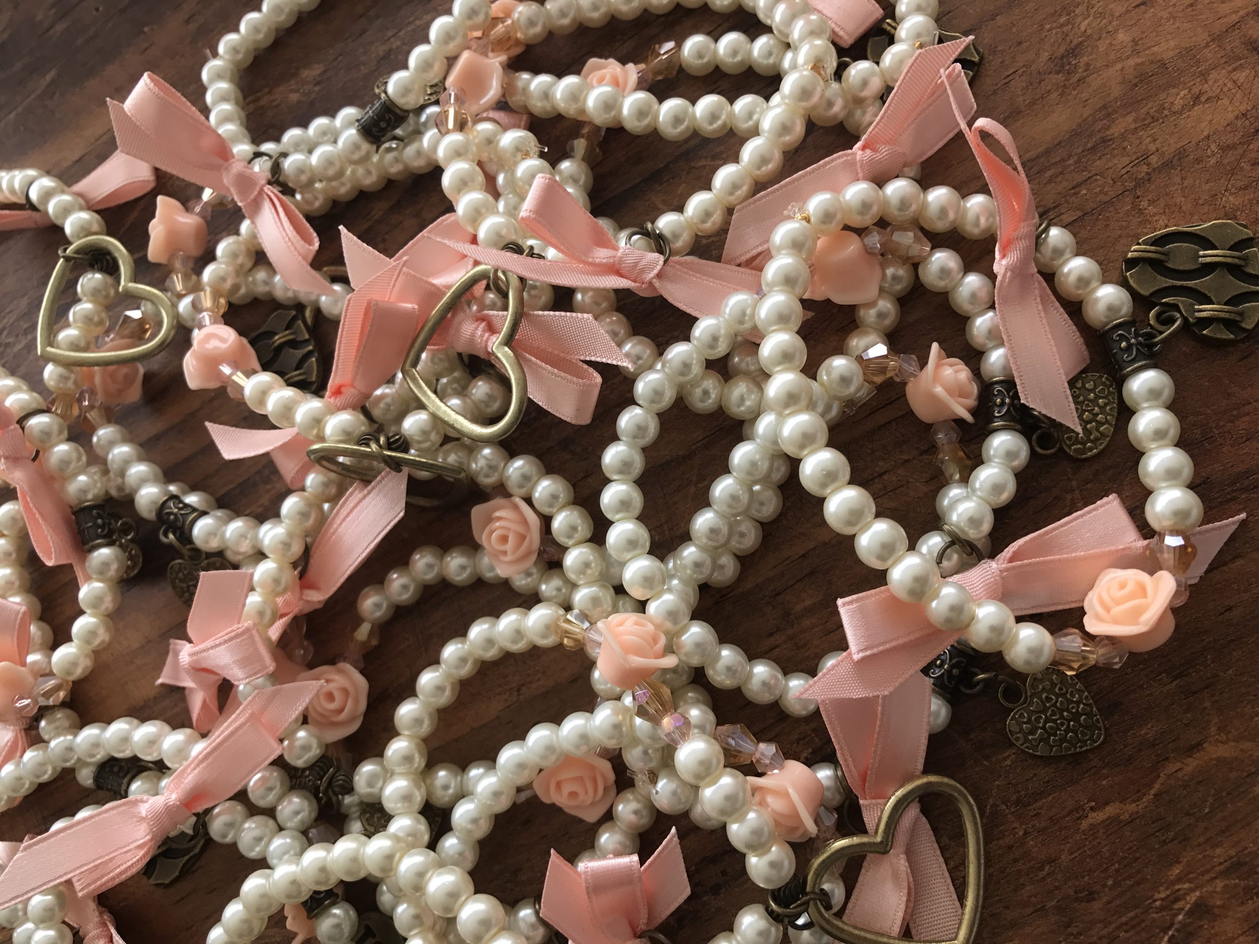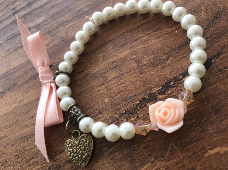 Pulseras elásticas de perlas con flor de acrílico y dijes en color oro antiguo.