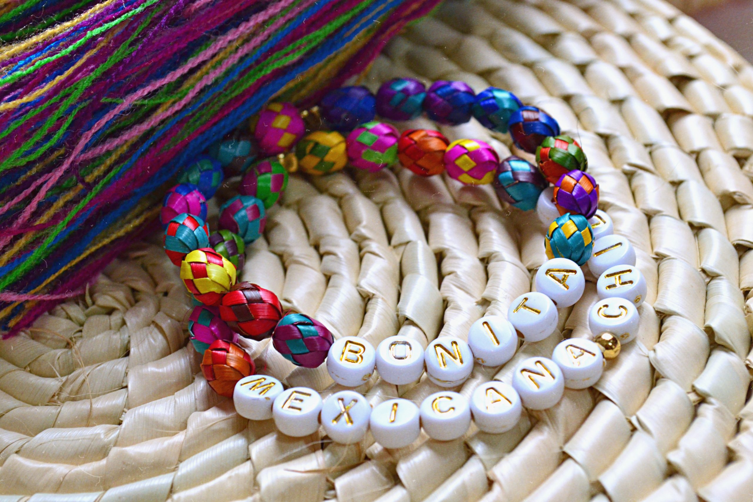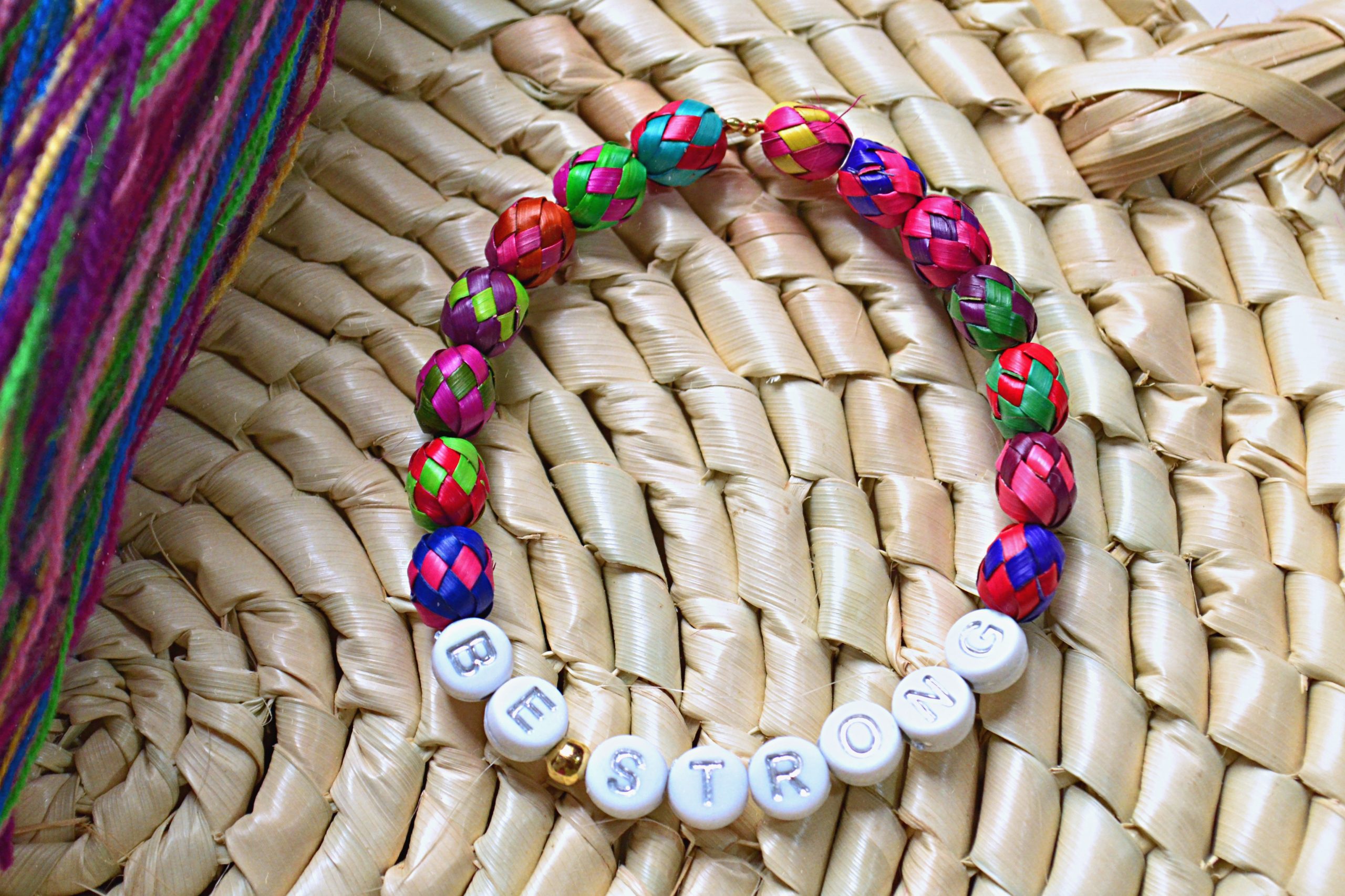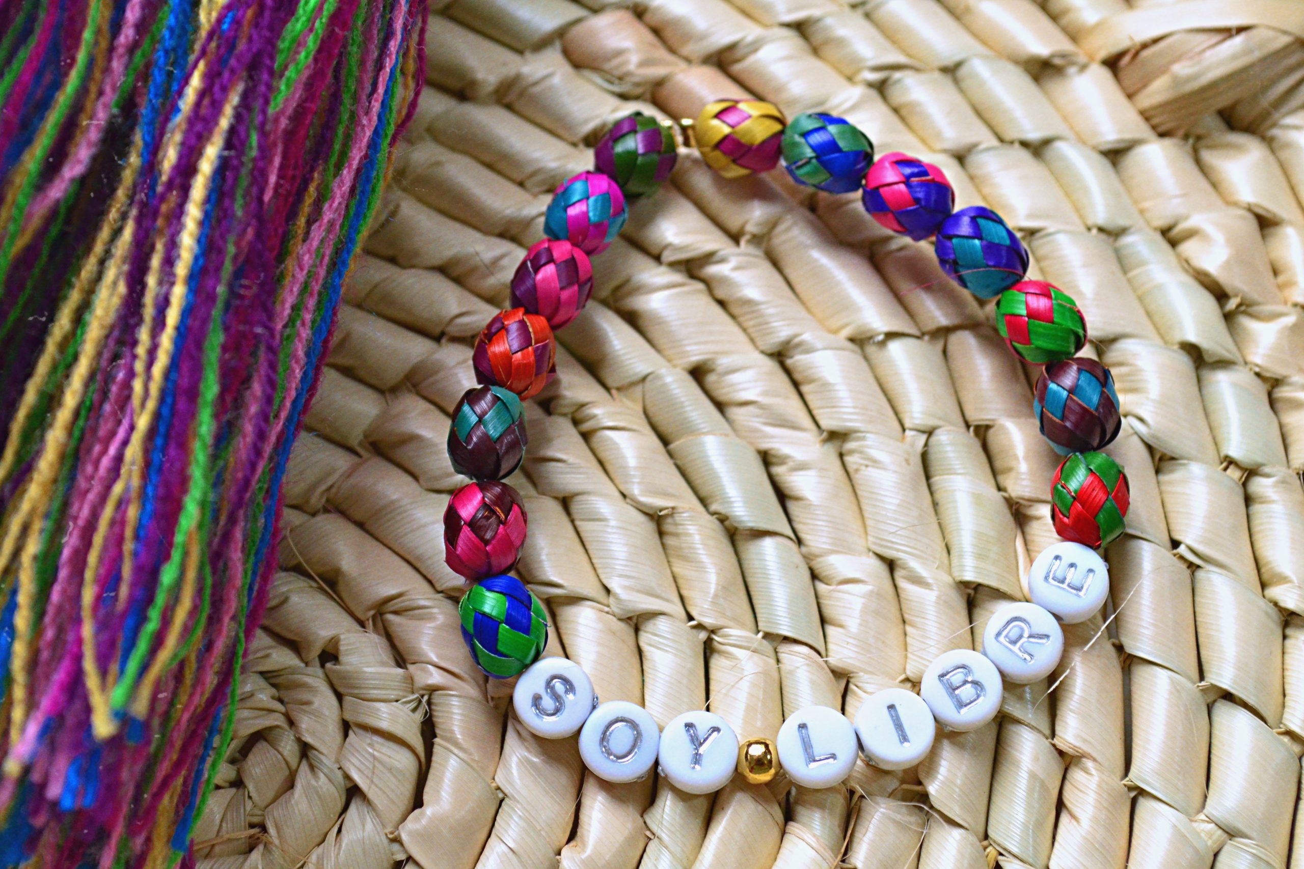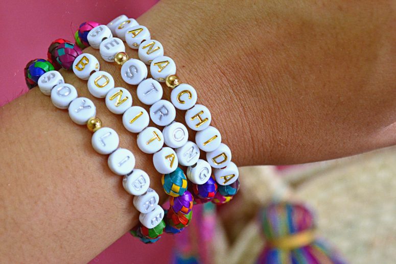 Pulseras elásticas hechas con bolitas de palma tejida y teñida por artesanos de Guerrero y cuentas de acrílico.