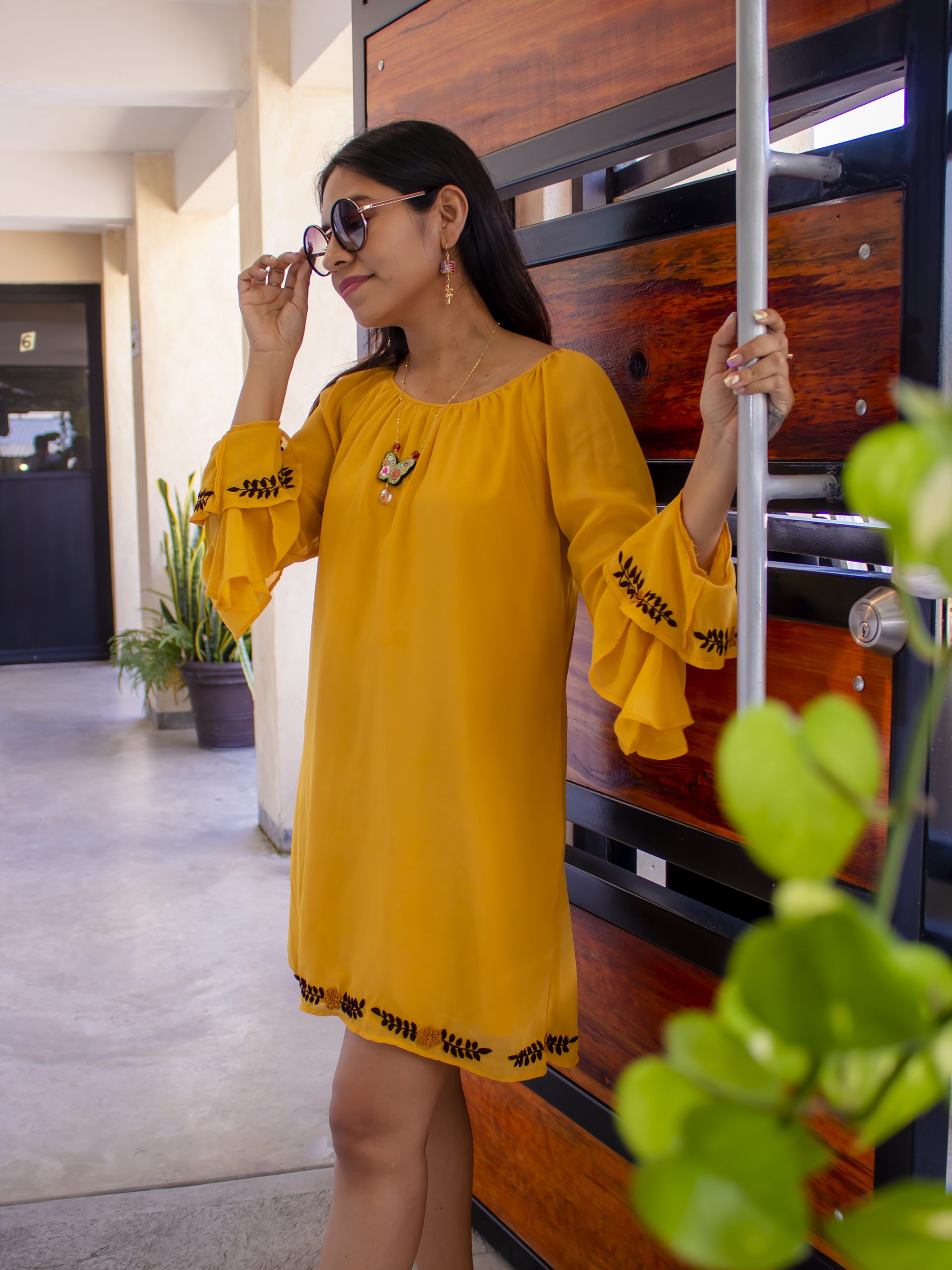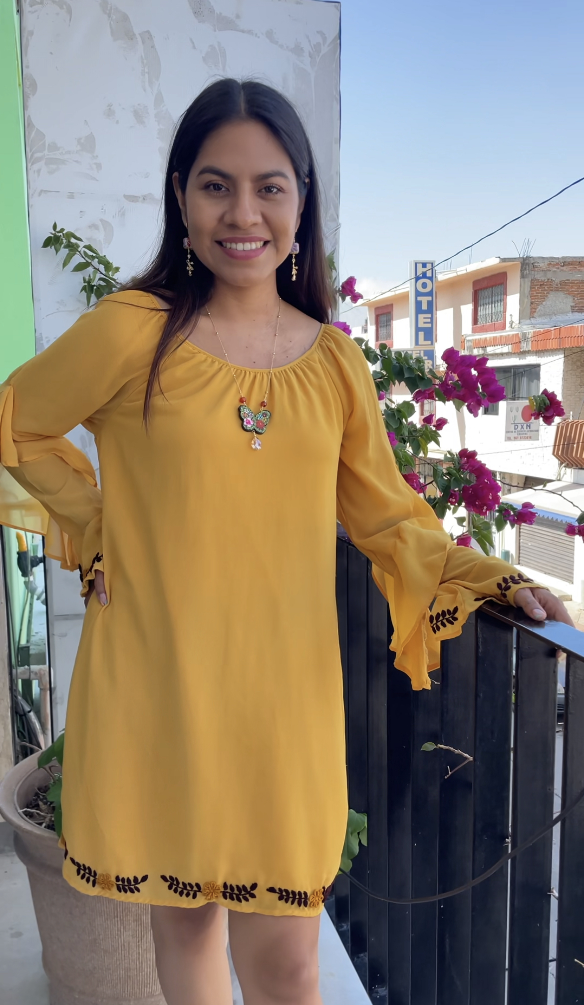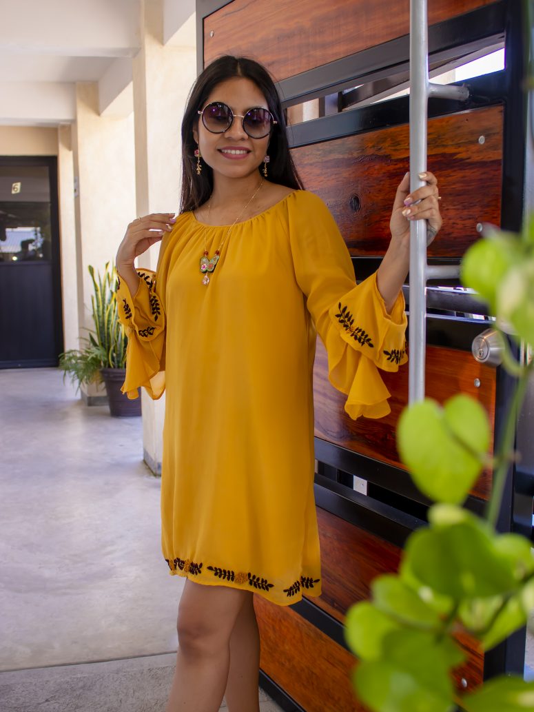 Vestido pre-loved de tela suelta en color amarillo -mostaza con intervención de bordado elabora por artesanas de Aguacatenango, Chiapas.  Talla Chica  (puede quedar a Mediana).