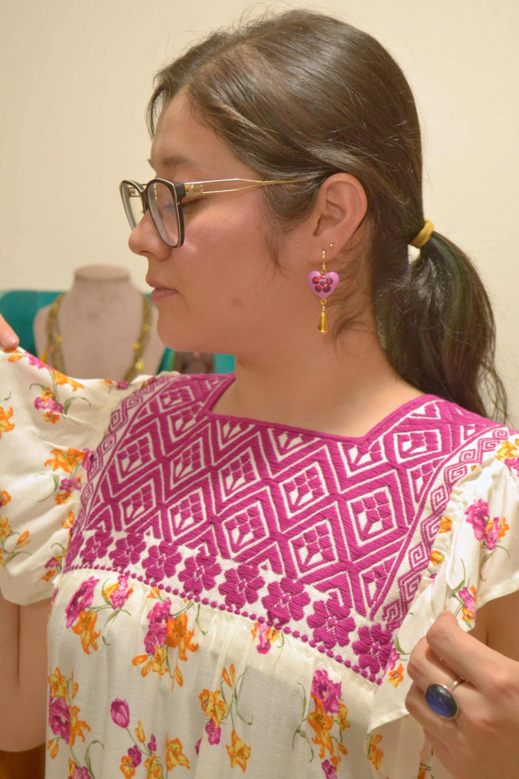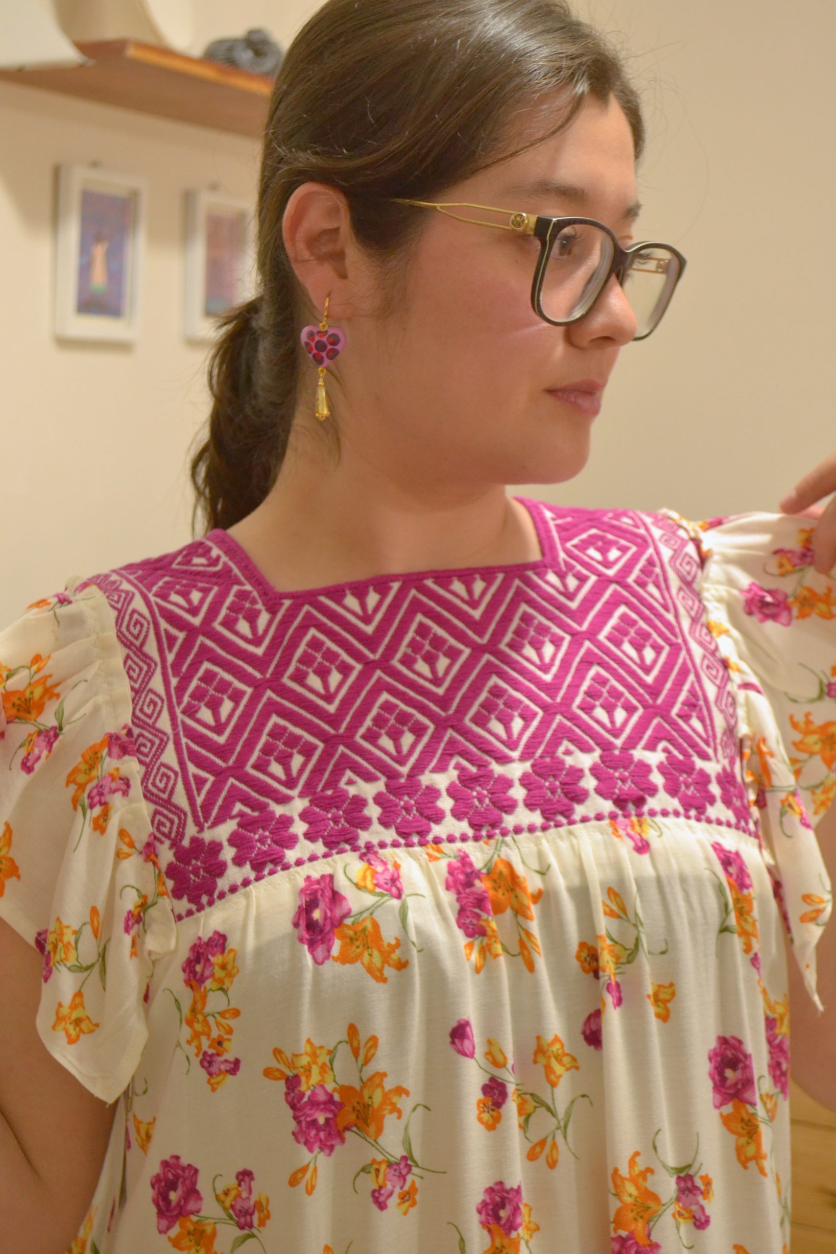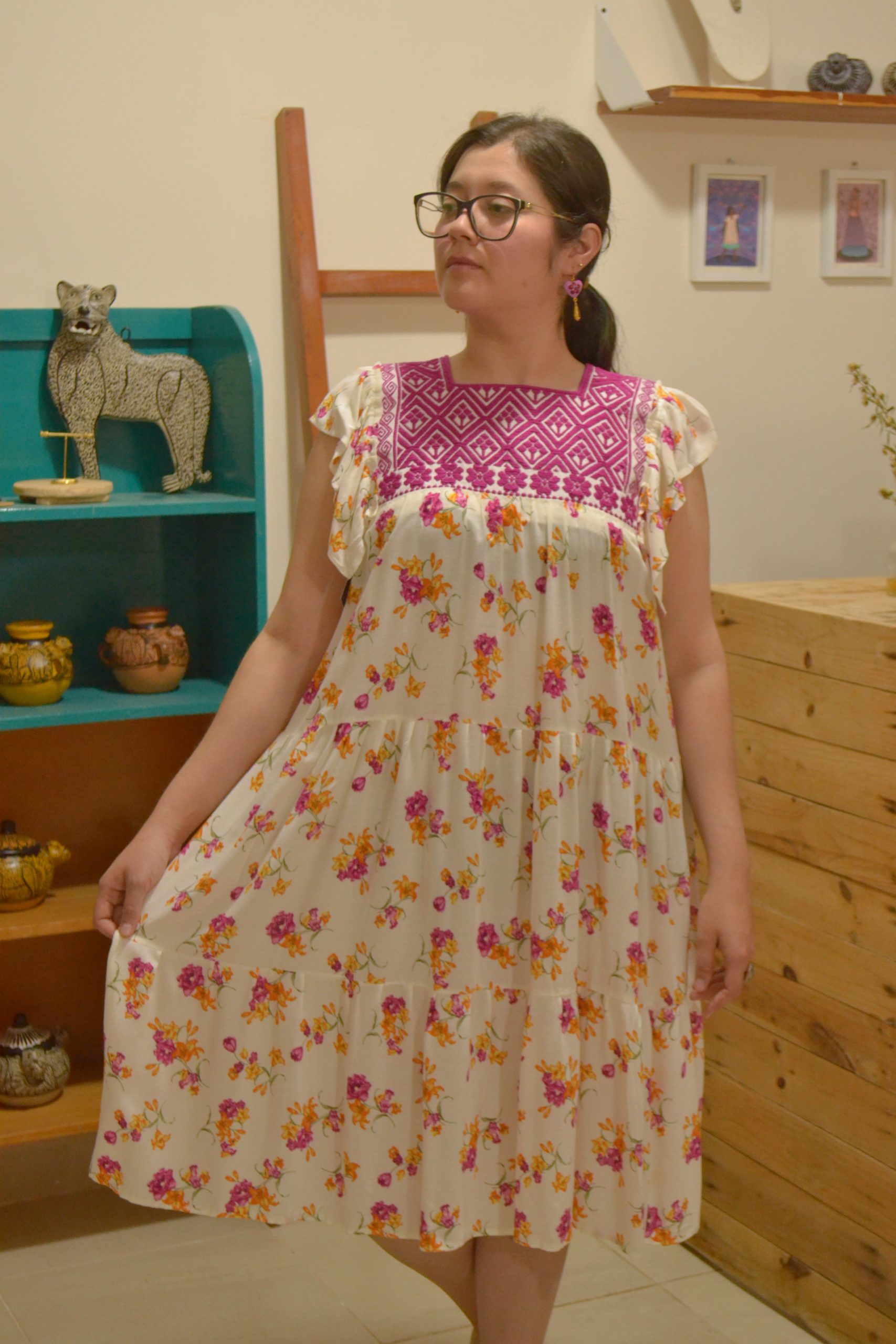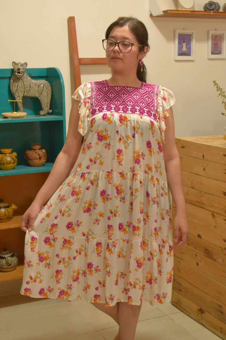 Vestido semi largo elaborado con tela rayón y aplicación de telar de cintura tejido y bordado por artesanas de San Andrés Larráinzar, Chiapas.