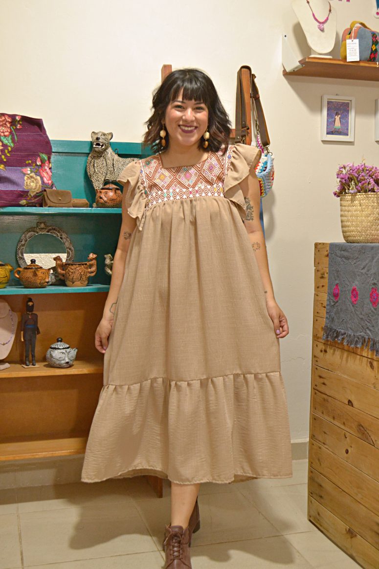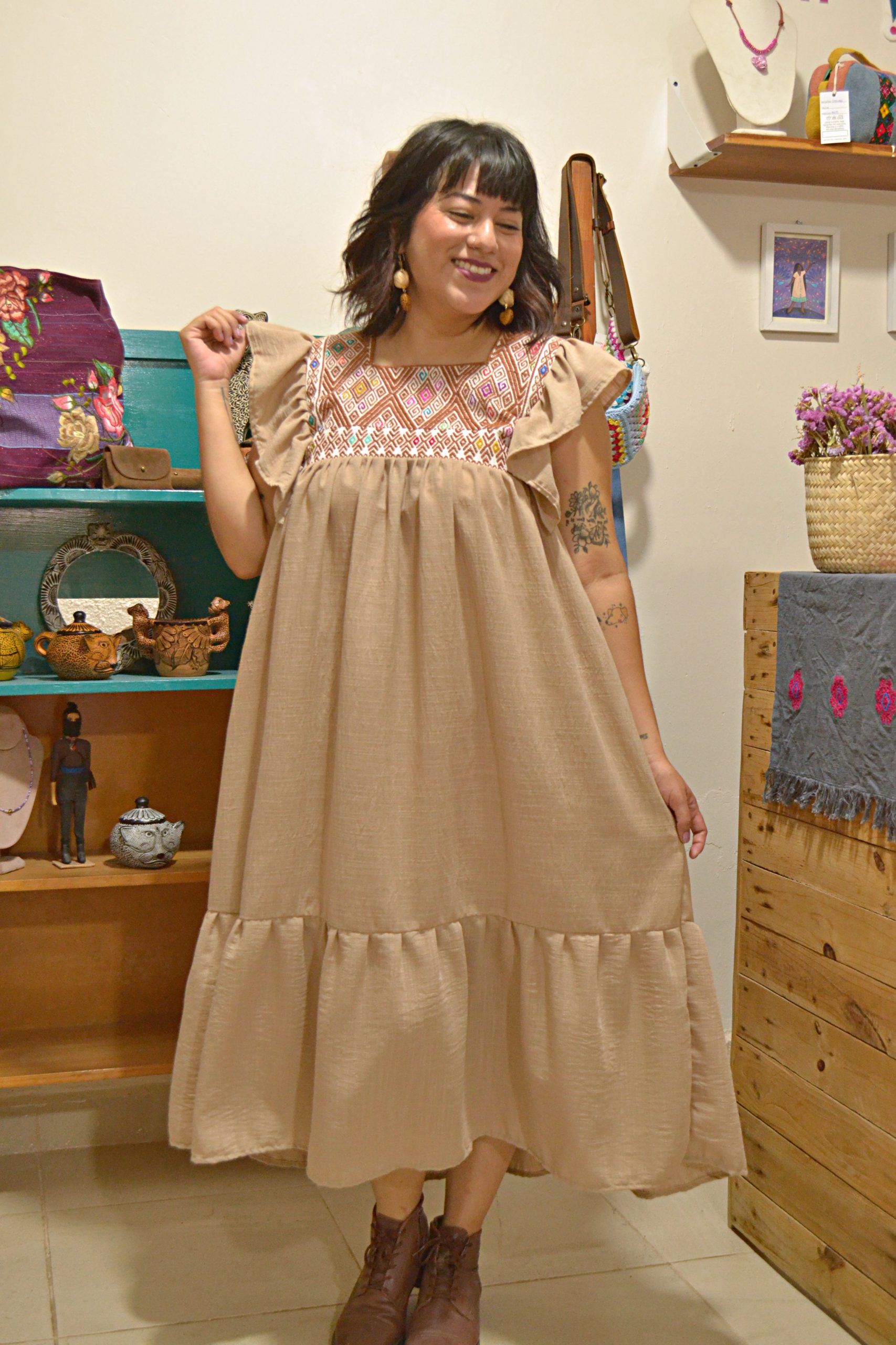 Vestido corte midi con pechera tejida y brocada en telar de cintura por artesanas de San Andrés Larráinzar, Chiapas. Talla: Unitalla